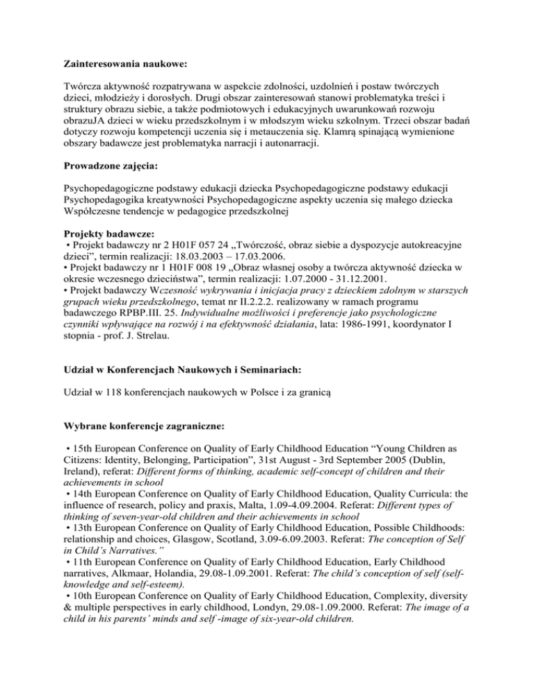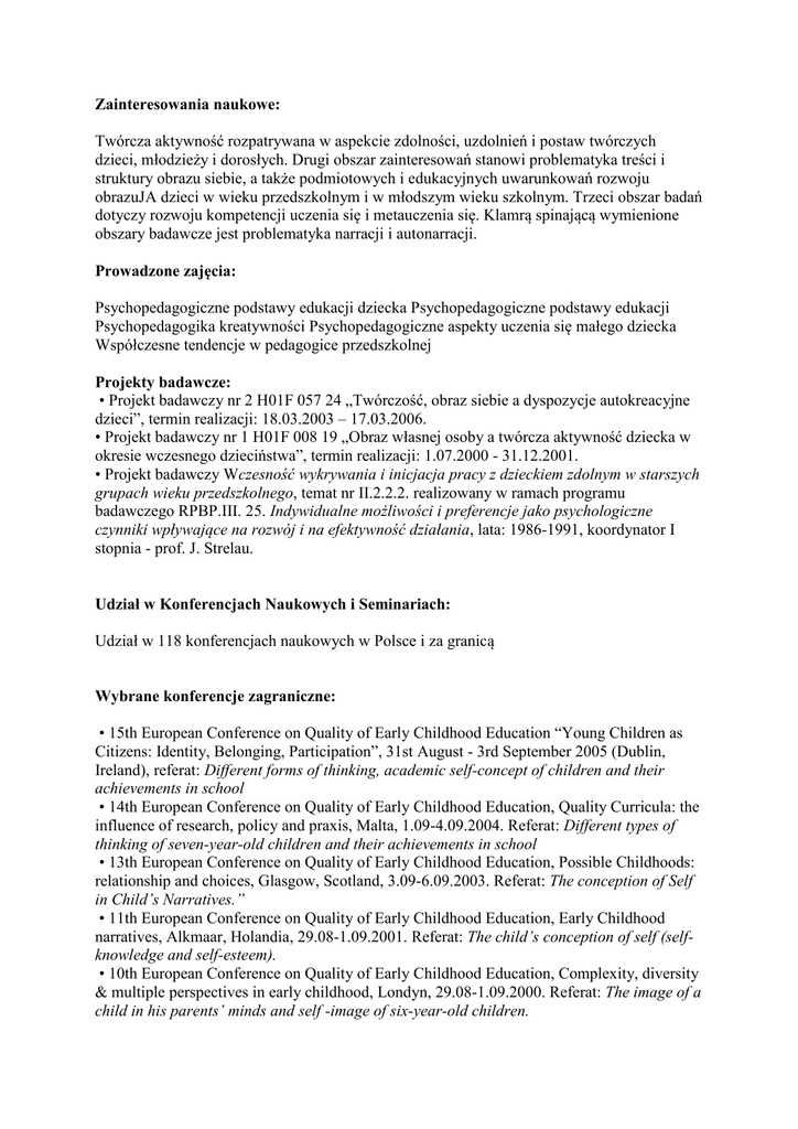 Zainteresowania naukowe: Twórcza aktywność rozpatrywana w aspekcie zdolności, uzdolnień i postaw twórczych dzieci, młodzieży i dorosłych. Drugi obszar zainteresowań stanowi problematyka treści i struktury obrazu siebie, a także podmiotowych i edukacyjnych uwarunkowań rozwoju obrazuJA dzieci w wieku przedszkolnym i w młodszym wieku szkolnym. Trzeci obszar badań dotyczy rozwoju kompetencji uczenia się i metauczenia się. Klamrą spinającą wymienione obszary badawcze jest problematyka narracji i autonarracji. Prowadzone zajęcia: Psychopedagogiczne podstawy edukacji dziecka Psychopedagogiczne podstawy edukacji Psychopedagogika kreatywności Psychopedagogiczne aspekty uczenia się małego dziecka Współczesne tendencje w pedagogice przedszkolnej Projekty badawcze: • Projekt badawczy nr 2 H01F 057 24 „Twórczość, obraz siebie a dyspozycje autokreacyjne dzieci”, termin realizacji: 18.03.2003 – 17.03.2006. • Projekt badawczy nr 1 H01F 008 19 „Obraz własnej osoby a twórcza aktywność dziecka w okresie wczesnego dzieciństwa”, termin realizacji: 1.07.2000 - 31.12.2001. • Projekt badawczy Wczesność wykrywania i inicjacja pracy z dzieckiem zdolnym w starszych grupach wieku przedszkolnego, temat nr II.2.2.2. realizowany w ramach programu badawczego RPBP.III. 25. Indywidualne możliwości i preferencje jako psychologiczne czynniki wpływające na rozwój i na efektywność działania, lata: 1986-1991, koordynator I stopnia - prof. J. Strelau. Udział w Konferencjach Naukowych i Seminariach: Udział w 118 konferencjach naukowych w Polsce i za granicą Wybrane konferencje zagraniczne: • 15th European Conference on Quality of Early Childhood Education “Young Children as Citizens: Identity, Belonging, Participation”, 31st August - 3rd September 2005 (Dublin, Ireland), referat: Different forms of thinking, academic self-concept of children and their achievements in school • 14th European Conference on Quality of Early Childhood Education, Quality Curricula: the influence of research, policy and praxis, Malta, 1.09-4.09.2004. Referat: Different types of thinking of seven-year-old children and their achievements in school • 13th European Conference on Quality of Early Childhood Education, Possible Childhoods: relationship and choices, Glasgow, Scotland, 3.09-6.09.2003. Referat: The conception of Self in Child’s Narratives.” • 11th European Conference on Quality of Early Childhood Education, Early Childhood narratives, Alkmaar, Holandia, 29.08-1.09.2001. Referat: The child’s conception of self (selfknowledge and self-esteem). • 10th European Conference on Quality of Early Childhood Education, Complexity, diversity & multiple perspectives in early childhood, Londyn, 29.08-1.09.2000. Referat: The image of a child in his parents’ minds and self -image of six-year-old children. • 9th European Conference on Quality of Early Childhood Education, Early Childhood Education: How does early education lead to life-learning? Helsinki, Finland, 1-4 September 1999, Referat: Self-esteem of preschool children and their cognitive and social functioning. • 3th Warwick International Early Years Conference: Sharing Research in Early Childhood Education, Institute of Education, University of Warwick, Coventry, England, 12-16 kwietnia 1999. Referat: Self-esteem and self-evaluation of six-years-old children and their social functioning at preschool. • 8th European Conference on Quality of Early Childhood Education, Early Childhood Education: New Challenges, New teachers. Santiago de Compostela, 2-5 September 1998, Referat: Creative Capacieties and Abilities and Creative Attitudes as Basic Indicators of Personalitry Competence of a Preschool Teacher. • 7th European Conference on Quality in Early Childhood Education, Monachium, 39.09.1997. Referat: Psychopedagogic and social conditioning of individual differences in the creative capacity of six-year children Członkowstwo w organizacjach i towarzystwach naukowych: • Stowarzyszenie Trans Humana – od 2011 roku • Stowarzyszenie Wspólnota Polska – od 2005 • National Association for Self-Esteem – od 2004 do 2008 roku • Polskie Stowarzyszenie Kreatywności – od 2002 roku, od 2009 członek Zarządu PSK • Zespół Edukacji Elementarnej Komitetu Nauk Pedagogicznych PAN – od 1999 roku • OMEP (Organisation Mondiale pour l’Education Prescolaire) – od 1999 roku, w latach 2000-2004 i 2009-2012 pełnienie funkcji prezesa PK OMEP Oddział Podlaski, • EECERA (European Early Childhood Education Research Association) – od 1998 do 2006 roku Formy podnoszenia kwalifikacji zawodowych: • 2011/2012 - Studia Podyplomowe „Menedżer Badań Naukowych i Prac Rozwojowych” Wyższa Szkoła Ekonomii i Innowacji w Lublinie • 2009/2010 - szkolenie z zakresu obsługi platformy e-learningowej BlackBoard oraz tworzenia kursów e-learningowych prowadzone w ramach realizacji projektu „Nowoczesne i efektywne kształcenie we współpracy z przedsiębiorcami” współfinansowanego przez Unię Europejską w ramach Europejskiego Funduszu Społecznego • 2008 – Kurs SPSS for Windows – kurs podstawowy realizowany w ramach programu ADRIANA – SPSS Polska sp. Z o.o. Kraków. • 2005 – Kurs „Budowanie modeli predykcyjnych z użyciem oprogramowania SPSS”, SPSS Polska sp. z o.o. Kraków. Recenzje wydawnicze książek: • Recenzja wydawnicza książki: Bonar J., 2011, Nauczyciel wczesnej edukacji – oczekiwania społeczne i praktyka edukacyjna, Łódź, Wydawnictwo Uniwersytetu Łódzkiego. • Recenzja wydawnicza książki: Dziedziewicz D., Karwowska E., 2010, Do góry nogami. Pomysłowy świat dwulatka i młodszego przedszkolaka, Ilustracje Aleksandra Gajda. • Recenzja wydawnicza książki Żytko M., 2010, Pozwólmy dzieciom czytać i pisać, Warszawa, Wyd. Akad. Żak. • Recenzja wydawnicza książki habilitacyjnej – Garbula J., 2009, Znaczenia historyczne w edukacji początkowej. Narracyjne konstruo