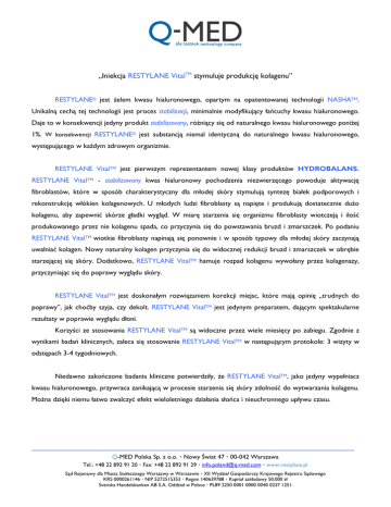 „Iniekcja RESTYLANE VitalTM stymuluje produkcję kolagenu” RESTYLANE® jest żelem kwasu hialuronowego, opartym na opatentowanej technologii NASHATM. Unikalną cechą tej technologii jest proces stabilizacji, minimalnie modyfikujący łańcuchy kwasu hialuronowego. Daje to w konsekwencji jedyny produkt stabilizowany, różniący się od naturalnego kwasu hialuronowego poniżej 1%. W konsekwencji RESTYLANE® jest substancją niemal identyczną do naturalnego kwasu hialuronowego, występującego w każdym zdrowym organizmie. RESTYLANE VitalTM jest pierwszym reprezentantem nowej klasy produktów HYDROBALANS. RESTYLANE VitalTM - stabilizowany kwas hialuronowy pochodzenia niezwierzęcego powoduje aktywację fibroblastów, które w sposób charakterystyczny dla młodej skóry stymulują syntezę białek podporowych i rekonstrukcję włókien kolagenowych. U młodych ludzi fibroblasty są napięte i produkują dostatecznie dużo kolagenu, aby zapewnić skórze gładki wygląd. W miarę starzenia się organizmu fibroblasty wiotczeją i ilość produkowanego przez nie kolagenu spada, co przyczynia się do powstawania bruzd i zmarszczek. Po podaniu RESTYLANE VitalTM wiotkie fibroblasty napinają się ponownie i w sposób typowy dla młodej skóry zaczynają uwalniać kolagen. Nowy naturalny kolagen przyczynia się do widocznej redukcji bruzd i zmarszczek w obrębie starzejącej się skóry. Dodatkowo, RESTYLANE VitalTM hamuje rozpad kolagenu wywołany przez kolagenazy, przyczyniając się do poprawy wyglądu skóry. RESTYLANE VitalTM jest doskonałym rozwiązaniem korekcji miejsc, które mają opinię „trudnych do poprawy”, jak choćby szyja, czy dekolt. RESTYLANE VitalTM jest jedynym preparatem, dającym spektakularne rezultaty w poprawie wyglądu dłoni. Korzyści ze stosowania RESTYLANE VitalTM są widoczne przez wiele miesięcy po zabiegu. Zgodnie z wynikami badań klinicznych, zaleca się stosowanie RESTYLANE VitalTM w następującym protokole: 3 wizyty w odstępach 3-4 tygodniowych. Niedawno zakończone badania kliniczne potwierdziły, że RESTYLANE VitalTM, jako jedyny wypełniacz kwasu hialuronowego, przywraca zanikającą w procesie starzenia się skóry zdolność do wytwarzania kolagenu. Można dzięki niemu łatwo zwalczyć efekt wieloletniego działania słońca i nieuchronnego upływu czasu. __________________________________________________________________________________________ Q-MED Polska Sp. z o.o. • Nowy Świat 47 • 00-042 Warszawa Tel.: +48 22 892 91 20 • Fax: +48 22 892 91 29 • [email protected] • www.restylane.pl Sąd Rejonowy dla Miasta Stołecznego Warszawy w Warszawie • XII Wydział Gospodarczy Krajowego Rejestru Sądowego KRS 0000261146 • NIP 5272515353 • Regon 140639788 • Kapitał zakładowy 50.000 zł Svenska Handelsbanken AB S.A. Oddział w Polsce • PL89 2250 0001 0000 0040 0237 1251