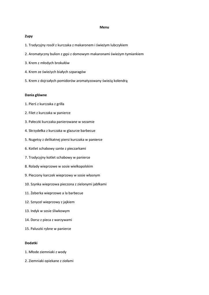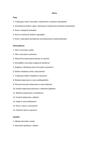 Menu Zupy 1. Tradycyjny rosół z kurczaka z makaronem i świeżym lubczykiem 2. Aromatyczny bulion z gęsi z domowym makaronami świeżym tymiankiem 3. Krem z młodych brokułów 4. Krem ze świeżych białych szparagów 5. Krem z dojrzałych pomidorów aromatyzowany świeżą kolendrą Dania główne 1. Pierś z kurczaka z grilla 2. Filet z kurczaka w panierce 3. Pałeczki kurczaka panierowane w sezamie 4. Skrzydełka z kurczaka w glazurze barbecue 5. Nugetsy z delikatnej piersi kurczaka w panierce 6. Kotlet schabowy sante z pieczarkami 7. Tradycyjny kotlet schabowy w panierce 8. Rolady wieprzowe w sosie wielkopolskim 9. Pieczony karczek wieprzowy w sosie własnym 10. Szynka wieprzowa pieczona z zielonymi jabłkami 11. Żeberka wieprzowe a la barbecue 12. Sznycel wieprzowy z jajkiem 13. Indyk w sosie śliwkowym 14. Dorsz z pieca z warzywami 15. Paluszki rybne w panierce Dodatki 1. Młode ziemniaki z wody 2. Ziemniaki opiekane z ziołami 3. Frytki 4. Ryż jaśminowy z kurkumą 5. Kasza 6. Młode warzywa z wody 7. Młoda kapusta z boczkiem 8. Surowa marchewka z kolendra i pomarańczą 9. Modra kapusta 10. Surówka warzywna 11. Tradycyjna mizeria Desery 1. Sałatka owocowa 2. Selekcja lodów 3. Panna cotta ze świeżymi malinami 4. Sorbet z czarnej porzeczki Zakąski zimne serwowane na platerach (opcjonalnie) 1. Indyk z morelami i orzechami włoskimi 2. Schab wieprzowy z krychymi warzywami i musem drobiowym 3. Pierś kurczaka w świeżym estragonie 4. Galantyna z kurczaka 5. Rolada z indyka z bakaliami Menu 2. (opcjonalnie) 1. Pieczywo ziołowe własnego wypieku Zupy 1. Krem Caprese z dojrzałych pomidorów, puree z Mozzarelli, pesto z liści świeżej bazylii 2. Wywar z pieczonej gęsi, runo leśne, grzyby, vol au vent z mięsem gęsim i czarnuszką Przystawki 1. Sałatka z zielonych listków, nasiona słonecznika i dyni, balsamiczny Vinaigrette, suszone pomidory, czosnek confit 2. Łosoś atlantycki wędzony na zimno w liściach jaśminu i zielonej herbaty, głęboko palone białe rodzynki, salsa mango, konfitura z chilli i jalapenos 3. Wątróbka z dzika, pieczone jabłko, powidła z białej cebuli, żurawina, puder z orzecha Laskowego Dania główne 1. Pierś kurczaka z grilla z serem Mozarella, kremowa emulsja z dojrzałych pomidorów, świeża bazylia 2. Filet z łososia norweskiego, kremowe młode pory, blanszowane warzywa sezonowe 3. Stek złotnicki, dym z kory dębu, runo leśne, emulsja z miodu spadziowego 4. Tortiglioni w kremowym sosie z suszonymi pomidorami, czosnek confit, wędzony boczek, ścinany Parmezan /opcja wegetariańska: bez wędzonego boczku/ Desery 1. Selekcja lodów w liściach mięty 2. Selekcja sorbetów w liściach mięty