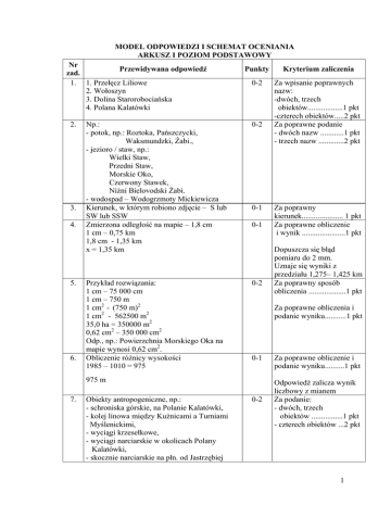 MODEL ODPOWIEDZI I SCHEMAT OCENIANIA ARKUSZ I POZIOM PODSTAWOWY Nr Przewidywana odpowiedź zad. 1. 1. Przełęcz Liliowe 2. Wołoszyn 3. Dolina Starorobociańska 4. Polana Kalatówki 2. 3. 4. 5. 6. Punkty Kryterium zaliczenia 0-2 Za wpisanie poprawnych nazw: -dwóch, trzech obiektów..................1 pkt -czterech obiektów.....2 pkt Za poprawne podanie - dwóch nazw ............1 pkt - trzech nazw .............2 pkt Np.: - potok, np.: Roztoka, Pańszczycki, Waksmundzki, Żabi., - jezioro / staw, np.: Wielki Staw, Przedni Staw, Morskie Oko, Czerwony Stawek, Niżni Bielovodski Żabi. - wodospad – Wodogrzmoty Mickiewicza Kierunek, w którym robiono zdjęcie – S lub SW lub SSW Zmierzona odległość na mapie – 1,8 cm 1 cm – 0,75 km 1,8 cm - 1,35 km x = 1,35 km 0-2 Przykład rozwiązania: 1 cm – 75 000 cm 1 cm – 750 m 1 cm2 - (750 m)2 1 cm2 - 562500 m2 35,0 ha = 350000 m2 0,62 cm2 – 350 000 cm2 Odp., np.: Powierzchnia Morskiego Oka na mapie wynosi 0,62 cm2. Obliczenie różnicy wysokości 1985 – 1010 = 975 0-2 0-1 0-1 Obiekty antropogeniczne, np.: - schroniska górskie, na Polanie Kalatówki, - kolej linowa między Kuźnicami a Turniami Myślenickimi, - wyciągi krzesełkowe, - wyciągi narciarskie w okolicach Polany Kalatówki, - skocznie narciarskie na płn. od Jastrzębiej Dopuszcza się błąd pomiaru do 2 mm. Uznaje się wyniki z przedziału 1,275– 1,425 km Za poprawny sposób obliczenia ...................1 pkt Za poprawne obliczenia i podanie wyniku...........1 pkt 0-1 975 m 7. Za poprawny kierunek..................... 1 pkt Za poprawne obliczenie i wynik ......................1 pkt 0-2 Za poprawne obliczenie i podanie wyniku..........1 pkt Odpowiedź zalicza wynik liczbowy z mianem Za podanie: - dwóch, trzech obiektów ................1 pkt - czterech obiektów ...2 pkt 1 8. 9. Turni, - domy wycieczkowe. Walory turystyczne, np.: - skałki wapienne, - turnie (Raptawicka Turnia) - potoki, - jaskinie (Jaskinia Mroźna, Jaskinia Mylna), - polany (Polana Pisana), - roślinność górska, - dolina górska, - wywierzyska, - górski krajobraz, - piękne widoki. Zagrożenia, np.: - burze, - intensywne opady deszczu, - intensywne opady śniegu, - mgły, - nagły spadek temperatury powietrza, - nagły spadek ciśnienia atmosferycznego, - lawiny, - oblodzenie szlaków, - silny porywisty wiatr (np. halny), - atak niedźwiedzia. Działania, np.: - uzyskanie informacji dotyczącej prognozy pogody, - uzyskanie informacji o możliwości wejścia i poruszania się po szlakach górskich, - przygotowanie ubrania odpowiedniego do górskich wędrówek. - powiadomienie TOPR o trasie wyprawy i planowanym czasie pobytu w górach, - stosowanie się do regulaminu Tatrzańskiego Parku Narodowego. 10. Problemy, np.: - zachwianie równowagi przyrodniczej na terenie TPN, - sprzeczność interesów ekonomicznych społeczności lokalnej z funkcjami ekologicznymi TPN, - naruszenie równowagi między liczbą turystów odwiedzających TPN, a przepustowością tatrzańskich szlaków, - naturalne ograniczanie rozwoju społecznogospodarczego społeczności lokalnej (brak rezerw gruntów pod działalność gospodarczą), - zagrożenia dla chronionych gatunków roślin rosnących w bezpośrednim sąsiedztwie 2 0-2 Za podanie: - dwóch walorów ......1 pkt - czterech walorów ....2 pkt 0-2 Za podanie: - dwóch przykładów zagrożeń ....................1 pkt Za podanie dwóch przykładów działań ....1 pkt lub Za podanie: - jednego zagrożenia i jednego działania ..1 pkt 0-2 Za poprawne sformułowanie: - dwóch, trzech problemów ............. 1 pkt - czterech ................... 2 pkt szlaków turystycznych. 11. A, C, E. 12. Fiord - C Sandry - A 13. a) tsunami b) np.: - podwodne trzęsienia ziemi, - wybuchy wulkanów, - podwodne osuwiska. 14. Podobieństwa, np.: - w obu miejscowościach najwyższe wartości temperatury powietrza przypadają na lipiec, - opady atmosferyczne w obu miejscowościach występują w ciągu całego roku. Różnice, np.: - Londyn, klimat umiarkowany o cechach morskich a Uralsk umiarkowany o cechach kontynentalnych, - w Londynie w zimie temperatury powietrza kształtują się zawsze powyżej 0o C a w Uralsku spadają do około –15o C, natomiast latem w Uralsku temperatura powietrza jest wyższa niż w Londynie, - sumy opadów atmosferycznych w poszczególnych miesiącach w Londynie są wyższe niż w Uralsku, - w Londynie najwyższe opady atmosferyczne występują jesienią a w Uralsku wiosną i latem, - wyższa amplituda roczna temperatury w Uralsku, - rozkład opadów w roku (brak wyraźnego maksimum w Londynie, w Uralsku jedno maksimum przełom wiosny-lata i drugie latojesień. 15. a) Na Północnym Atlantyku i u wybrzeży Skandynawii należy wpisać N (niż baryczny). W Zatoce Biskajskiej W (wyż baryczny). 0-1 0-1 0-2 Za wybranie tylko trzech wskazanych.....1 pkt Za poprawne dobranie dwóch procesów ........1 pkt a) za podanie nazwy zjawiska .................1 pkt b) za podanie jednej przyczyny ..............1 pkt 0-2 Za każde dwie prawidłowo wskazane cechy ..........................1 pkt 0-2 a) za prawidłowe wpisanie liter W i N ...1 pkt b) wzrośnie 16. marikultura 0-1 17. Np.: - wzrost znaczenia powiązań międzynarodowych w gospodarce światowej, a co za tym idzie konieczność bardziej 0-2 b) za poprawną odpowiedź...................1 pkt Za podanie terminu .......................1 pkt Za wyjaśnienie z podaniem: - dwóch przyczyn .......1 pkt - trzech przyczyn ........2 pkt 3 nasilonych kontaktów personalnych w obrębie gospodarczych organizacji typu korporacji międzynarodowych i stowarzyszeń gospodarczych, np.: UE, politycznych (NATO, ONZ), - rośnie asortyment cennych towarów, które bezpieczniej jest przewozić transportem lotniczym (np.: produkty technologicznie zaawansowane), - transport lotniczy umożliwia pokonywanie dużych odległości w krótkim czasie, - może być wykorzystywany do przewozu towarów nie nadających się do długiego transpor