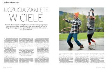 praktycznie warsztaty Uczucia zaklęte w ciele Warsztaty „Bioenergetyka według Lowena – zmysły miednicy” to przeżycie, które pamięta się długo. Dla niektórych szok: uczestnicy płaczą, krzyczą, klną, ale ma to głębszy sens – prowadzi do oczyszczenia ciała z emocji te k s t S K r z y sz tof Boczek iedzimy w kręgu, 15 osób i dwójka płacz. Prowadząca prosi kobietę, by wstaprowadzących. Fizjoterapeutka ła. – Zadam ci lekki ból, a ty wykrzycz go, i terapeutka Marzena Barszcz pro- wypuść z głowy – zapowiada i naciska na si, by każdy powiedział, co go skłoniło, stawy szczękowe. Szczery, głośny krzyk by tu przyszedł. Ludzie otwierają się, uwalnia emocje i kobieta siada w kręgu emocje narastają wraz ze zwierzeniami. – już bardziej rozluźniona. Mam sporo blokad w sobie, do tego od lat Kolejne osoby opowiadają o tym, co bóle kręgosłupa – w głosie uczestniczki ich tutaj przywiodło: o konflikcie z rodzisłychać łzy, po chwili ogarnia ją szloch. Coraz głośniejszy. Uczestnicy wreszcie zdają sobie – Zaufaj mi i płacz. Przez całe sprawę, skąd ten ból w głowie, następne trzy godziny. Będziesz bardzo zmęczona, ale poczujesz w kręgosłupie, napięcia. też rozluźnienie. Płacz będzie cię Mogą nad tym zapłakać, wściec karmić, a nie wyczerpywać – zasię, ale już nie muszą NICZEGO pewnia ją prowadząca. spychać w głąb siebie – Ciągle boli mnie głowa – odzywa się inna uczestniczka. Dotyka skroni i zaczyna płakać. Pozwala cami, który wywołuje w nich cierpienie, sobie na łzy, łka coraz mocniej, aż wręcz o problemach z urodzeniem dziecka, zachłystuje się szlochem. Nastrój żalu, które spotęgowały strach przed kolejną pragnienie ulgi, wyzwolenia – udziela ciążą. Niektórzy przyznają, że byli po się innym. Pozwalamy sobie na wspólny prostu ciekawi tej metody. 120 sens styczeń 2013 – Na warsztaty z bioenergetyki Lowena często przychodzą pacjenci z problemami medycznymi: zapaleniem prostaty, bólami lędźwi, szczękościskiem – mówi po zajęciach prowadząca. – Druga grupa to pacjenci psychoterapeutyczni, sporo jest osób neurotycznych. Przychodzą, bo chcą odpuścić kontrolę nad sobą, ciałem i emocjami, poczuć się lepiej ze sobą, poprawić swoje życie seksualne, wypłakać się albo… przestać zgrzytać zębami. Dużą, chyba najliczniejszą, grupę stanowią osoby cierpiące na bóle psychosomatyczne. Poruszyć energię – Zwykle energię mamy skumulowaną w głowie, ewentualnie w klatce piersiowej. Trzeba ją przeciągnąć do dołu i rozwibrować ciało, ożywić je – tłumaczy Marzena Barszcz. Temu celowi służą ćwiczenia: najpierw musimy poczuć nogi, potem pośladki, aż wreszcie miednicę. To kluczowy element pracy nad ciałem, bo sfery intymne są w naszej kulturze „odcięte” od reszty ciała, zablokowane. Warsztaty mają uwolnić drzemiącą w nich agresję, zaciśniętą w miednicy. Wyswobodzić ją, wypuścić. Zaczynamy od westchnień. Wzdychamy na głos, bardzo głośno. To, jak się okazuje, ćwiczenie do zastosowania na co dzień! – Jeśli 10 razy dziennie westchniesz sobie donośnie, to rozładujesz mniejsze napięcia w organizmie – przekonuje Marzena. Potem zaczynamy krążyć dookoła sali. Wykrzykujemy swoje pretensje. Do mijanych osób mamy krzyczeć: „Dlaczego?!”. Ostro, dobitnie, tak jakby właśnie ta osoba wyrządziła nam krzywdę, jakby była winna bólu, który czujemy, jakby to ona odpowiadała za wszystkie nasze cierpienia. „Dlaczego?!” – to słowo jest tak silne, bo niesie w sobie oskarżenie, a zarazem stwierdzenie winy i natychmiastowe wykonanie kary. Prowadzący zachęcają, by wyrzucać z siebie jak najwięcej złości. Do tego potrzebne są mocne słowa. Mamy nie wahać 2013 styczeń sens › 121 praktycznie warsztaty się, jeśli chcemy użyć wulgaryzmów. Słowa stają się zatem coraz bardziej ostre, Metoda amerykańskiego psychoterapeuty Alexandra Lowena opiera się dobitne. Do partnera stojącego naprzeciw na założeniu, że powodem wielu schorzeń są blokady energii umiejscowykrzykujemy: „Spierdalaj!”. Agresywnie, wione w ciele człowieka. Biorą się z nagromadzenia trudnych emocji z twarzą czerwoną od buzującej w niej — żalu, lęku, rozczarowania. Leczenie polega na zlokalizowaniu bloków krwi, od gniewu, który z głębi nas wyi usuwaniu ich poprzez ćwiczenia na poziomie ruchu i słów, dobranych tak, by doprowadzić do uwolnienia i ustąpienia napięć. pływa na usta. Jakbyśmy mieli szansę przegonić raz na zawsze z życia sprawcę swoich rozczarowań. Znów krążymy po sali. Krzyczymy do innych coraz bardziej gdzieś w przestrzeń: „Tato!”, „Mamo!”, uspokoić układ nerwowy. W ten spodobitnie. Gdy drobna blondynka rzuca mi „Dlaczego, ojcze?!”, „Dlaczego, matko?!”, sób ciało szuka balansu – tłumaczy w twarz: „Spierdalaj!”, robi to tak przeko- „Dlaczego?! Dlaczego?!”. po zajęciach prowadząca. – Człowiek nująco, że zatrzymuję mimowolny ruch Osoby, które tu przyszły, wykrzykując wprowadzony w wibracje ma pogłębiony swojej ręki, by się zasłonić. Tak jakbym swoje pytania, zaczynają rozumieć: skąd oddech, łatwiej się otwiera i uzyskuje ten ból w głowie, w kręgosłupie, z czego lepszy „dostęp” do swoich uczuć. Bo spodziewał się uderzenia. – Skrzywdził mnie pewien mężczyzna bierze się to ciągłe podskórne napięcie. kiedy zaczynamy tak drżeć, głęboko – tłumaczy, gdy spostrzega moje zdziwio- Mogą nad tym zapłakać, wściec się, kląć oddychamy i nie jesteśmy w stanie konne spojrzenie. trolować emocji. W punkcie kulminacyjnym ćwiW trakcie ćwiczeń uwalniamy czeń rozładowujących wręcz wydziez blokad najpierw klatkę piersiową, Krążymy wokół po sali, ramy się na siebie. Podczas krzyku potem brzuch, a wreszcie główny a do mijanych osób krzyczymy: wyrzucamy w bok ręce. Jakbyśmy cel – miednicę. Poz