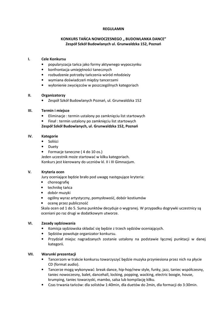 REGULAMIN KONKURS TAŃCA NOWOCZESNEGO „ BUDOWLANKA DANCE” Zespół Szkół Budowlanych ul. Grunwaldzka 152, Poznań I. Cele Konkursu • popularyzacja tańca jako formy aktywnego wypoczynku • konfrontacja umiejętności tanecznych • rozbudzenie potrzeby tańczenia wśród młodzieży • wymiana doświadczeń między tancerzami • wyłonienie zwycięzców w poszczególnych kategoriach II. Organizatorzy • Zespół Szkół Budowlanych Poznań, ul. Grunwaldzka 152 III. Termin i miejsce • Eliminacje : termin ustalony po zamknięciu list startowych • Finał : termin ustalony po zamknięciu list startowych Zespół Szkół Budowlanych, ul. Grunwaldzka 152, Poznań IV. Kategorie • Soliści • Duety • Formacje taneczne ( 4 do 10 os.) Jeden uczestnik może startować w kilku kategoriach. Konkurs jest kierowany do uczniów kl. II i III Gimnazjum. V. Kryteria ocen Jury oceniające będzie brało pod uwagę następujące kryteria: • choreografię • technikę tańca • dobór muzyki • ogólny wyraz artystyczny, pomysłowość, dobór kostiumów • ocenę przez publiczność Skala ocen od 1 do 5. Suma punktów decyduje o wygranej. W przypadku dogrywki uczestnicy są oceniani po raz drugi w dodatkowym utworze. VI. Zasady sędziowania • Komisja sędziowska składać się będzie z trzech sędziów oceniających. • Sędziów powołuje organizator konkursu. • Przydział miejsc nagradzanych zostanie ustalony na podstawie łącznej punktacji w danej kategorii. VII. Warunki prezentacji • Tancerzom w trakcie konkursu towarzyszyć będzie muzyka przyniesiona przez nich na płycie CD (format audio). • Tancerze mogą wykonywać: break dance, hip-hop/new style, funky, jazz, taniec współczesny, taniec nowoczesny, balet, dancehall, locking, popping, wacking, electric boogie, house, krumping, taniec towarzyski, mambo, salsa lub kompilację kilku. • Czas trwania tańców: dla solistów 1:40min, dla duetów do 2min, dla formacji do 3:30min. • • • • • • Rozmiar sceny 9X9m Podczas prezentacji na parkiecie znajduje się tylko jeden uczestnik/duet/formacja. Kolejność startu ustala organizator. Figury akrobatyczne nie mogą zagrażać zdrowiu uczestników. W razie dogrywki uczestnik/duet/formacja wykonuje dodatkowy pokaz inny niż pokaz konkursowy na tych samych zasadach. Akceptacja regulaminu i udział w konkursie jest jednocześnie zgodą na nagrywanie oraz fotografowanie przebiegu konkursu na cele promocyjne. VIII. Kostium • Uczestnicy występują we współczesnych strojach dowolnych • Obuwie zmienne IX. Nagrody • Nagrody przyznawane są we wszystkich kategoriach za zajęcie od I do III miejsca. • Nagroda za najbardziej kreatywny wizerunek dla uczestnika/duetu/formacji. • Wszyscy uczestnicy otrzymają dyplomy uczestnictwa oraz pamiątki z Konkursu. • W dniu finałowym przewidziana jest nagroda dla najliczniejszej własnej publiczności. X. Zgłoszenia Osoby chcące wziąć udział w Konkursie Tańca o przesłanie karty zgłoszenia (do pobrania na stronie www.zsb.com.pl) do 19 grudnia 2014 r. na adres [email protected] XI. Ustalenia końcowe • Sprawy nieujęte w regulaminie rozstrzyga organizator konkursu. • Organizatorzy zapewniają sprzęt nagłaśniający uczestnicy we własnym zakresie powinni dostarczyć opisaną płytę CD (audio) bądź inny nośnik z własną muzyką nagraną w dobrej jakości. • W przypadku dużej ilości zgłoszeń decyduje kolejność zgłoszeń, będzie również utworzona lista rezerwowa w razie rezygnacji któregoś z uczestników. • Organizator zapewnia opiekę medyczną podczas konkursu. • Organizator zapewnia dla uczestników wodę, będzie też czynny szkolny bufet. • Organizator zapewnia szatnię w trakcie występu, ale nie ponosi odpowiedzialności za rzeczy pozostawione w szatni. • Powstanie odpowiedniej kategorii tanecznej uzależnione jest od ilości uczestników. • Organizator zastrzega sobie prawo do zmian w regulaminie. Organizator