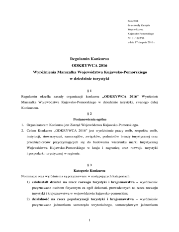 Załącznik do uchwały Zarządu Województwa Kujawsko-Pomorskiego Nr 31/1222/16 z dnia 17 sierpnia 2016 r. Regulamin Konkursu ODKRYWCA 2016 Wyróżnienia Marszałka Województwa Kujawsko-Pomorskiego w dziedzinie turystyki §1 Regulamin określa zasady organizacji konkursu „ODKRYWCA 2016” Wyróżnień Marszałka Województwa Kujawsko-Pomorskiego w dziedzinie turystyki, zwanego dalej Konkursem. §2 Postanowienia ogólne 1. Organizatorem Konkursu jest Zarząd Województwa Kujawsko-Pomorskiego. 2. Celem Konkursu „ODKRYWCA 2016” jest wyróżnienie pracy osób, zespołów osób, instytucji, stowarzyszeń, samorządów, związków, podmiotów branży turystycznej oraz przedsiębiorców przyczyniających się do budowania wizerunku marki turystycznej Województwa Kujawsko-Pomorskiego w kraju i zagranicą oraz rozwoju turystyki i gospodarki turystycznej w regionie. §3 Kategorie Konkursu Nominacje oraz wyróżnienia są przyznawane w następujących kategoriach: 1) całokształt działań na rzecz rozwoju turystyki i krajoznawstwa – wyróżnienie przyznawane osobom fizycznym za ogół dokonań, prowadzonych na rzecz rozwoju turystyki i krajoznawstwa w województwie kujawsko-pomorskim; 2) działalność na rzecz popularyzacji turystyki i krajoznawstwa – wyróżnienie przyznawane jednostkom samorządu terytorialnego, samorządowym jednostkom 1 organizacyjnym, organizacjom pozarządowym prowadzącym działalność w zakresie turystyki na terenie województwa kujawsko-pomorskiego, za propagowanie krajoznawstwa i poznawanie historii regionu; 3) promocja turystyczna regionu - wyróżnienie przyznawane lokalnym organizacjom turystycznym, lokalnym grupom działania, innym organizacjom pozarządowym działającym w obszarze turystyki oraz jednostkom samorządu terytorialnego i samorządowym jednostkom organizacyjnym za prowadzenie działań promocyjnych realizowanych w kraju i zagranicą, które przyczyniły się do rozwoju turystyki i budowania pozytywnego wizerunku regionu; 4) inwestycja sprzyjająca rozwojowi turystyki – wyróżnienie przyznawane jednostkom samorządu terytorialnego i samorządowym jednostkom organizacyjnym za najlepszą inwestycję, która przyczyniła się do rozwoju turystyki w regionie; inwestycja powinna być zakończona do 31 sierpnia 2016 r.; 5) przedsięwzięcie biznesowe – wyróżnienie przyznawane podmiotom branży turystycznej (hotelom, organizatorom turystyki organizującym przyjazdy do województwa kujawsko-pomorskiego, obiektom noclegowym, gospodarstwom agroturystycznym, obiektom gastronomicznym itp.), których działalność przyczynia się do budowania pozytywnego wizerunku województwa kujawsko-pomorskiego; 6) wydarzenie turystyczne i promocyjne – wyróżnienie przyznawane organizatorom wydarzenia (jednostkom samorządu terytorialnego, samorządowym jednostkom organizacyjnym, organizacjom pozarządowym działającym w obszarze turystyki oraz podmiotom branży turystycznej) przyczyniającego się do budowania pozytywnego wizerunku województwa kujawsko-pomorskiego; wydarzenie powinno być zorganizowane do 31 sierpnia 2016 r. §4 Zgłoszenia do konkursu 1. Warunkiem uczestnictwa w Konkursie jest zgłoszenie kandydatury w nieprzekraczalnym terminie do dnia 23 września 2016 r. (decyduje data stempla pocztowego). 2. Zgłoszenia do konkursu mogą być dokonywane bezpośrednio przez samego kandydata lub kandydaci mogą być zgłoszeni przez inny podmiot; w tym przypadku konieczna jest zgoda kandydata na udział w konkursie; formularz stanowi załącznik nr 2 do regulaminu. 2 3. Kandydatów zgłaszać mogą: organizacje pozarządowe, jednostki samorządu terytorialnego, samorządowe jednostki organizacyjne, podmioty branży turystycznej, uczelnie i inne. 4. Kandydaci mogą być zgłaszani tylko w jednej z kategorii, o których mowa w § 3. 5. Kandydaci, którzy otrzymali nominacje do wyróżnienia oraz wyróżnienie Marszałka Województwa Kujawsko-Pomorskiego w ostatnich trzech latach, nie mogą brać udziału w konkursie w tej samej kategorii. 6. Zgłoszenie konkursowe powinno zawierać: 1) wypełniony formularz zgłoszeniowy (załącznik nr 1 do niniejszego regulaminu), 2) wersję elektroniczną wypełnionego formularza w pliku doc. oraz pliki ze zdjęciami (np. kandydata, wydarzenia turystycznego, przedsięwzięcia biznesowego, inwestycji sprzyjającej rozwojowi turystyki, itp.) na płycie CD lub innym nośniku, 3) minimum 1 rekomendację podmiotu wymienionego w ust. 3 w przypadku, gdy kandydatura zgłaszana jest samodzielnie, 4) oświadczenie w sprawie wyrażenia zgody na kandydowanie w konkursie, jeśli kandydatura zgłaszana jest przez inny podmiot (załącznik nr 2), 5) zgodę na wykorzystanie wizerunku, stanowiącą załącznik nr 3 do niniejszego regulaminu. 7. Formularz zgłoszeniowy powinien być podpisany czytelnie przez osoby, które zgodnie z postanowieniami statutu, ustawy lub innego dokumentu są uprawnione do reprezentowania podmiotu i zaciągania w jego imieniu zobowiązań finansowych i zawierania umów. 8. Zgłoszenia konkursowe należy składać w zamkniętej kopercie w biurze podawczym w Urzędzie Marszałkowskim Województwa Kujawsko-Pomorskiego, Plac Teatralny 2, Toruń, bądź przesłać na adres: Urząd Marszałkowski Województwa Kujawsko-Pomorskiego, Departament Sportu i Turystyki, Wydział Turystyki, Plac Teatralny 2, 87-100 Toruń, z dopiskiem „Konkurs ODKRYWCA 2016”. 9. Formularze zgłoszeniowe złożone po terminie nie będą rozpatrywane. 10. Przesłane materiały zostaną zarchiwizowane przez Departament Sportu i Turystyki, Wydział Turystyki Urzędu Marszałkowskiego Województwa KujawskoPomorskiego i nie będą podlegały zwrotowi. 3 §5 Przebieg konkursu 1. Ogłoszenie o konkursie oraz informacje o przebiegu konkursu zostaną zamieszczone na stronie internetowej Urzędu Marszałkowskiego Województwa KujawskoPomorskiego www.odkrywca.kujawsko-pomorskie.pl. 2. Konkurs składa się z dwóch etapów: oceny formalnej i m