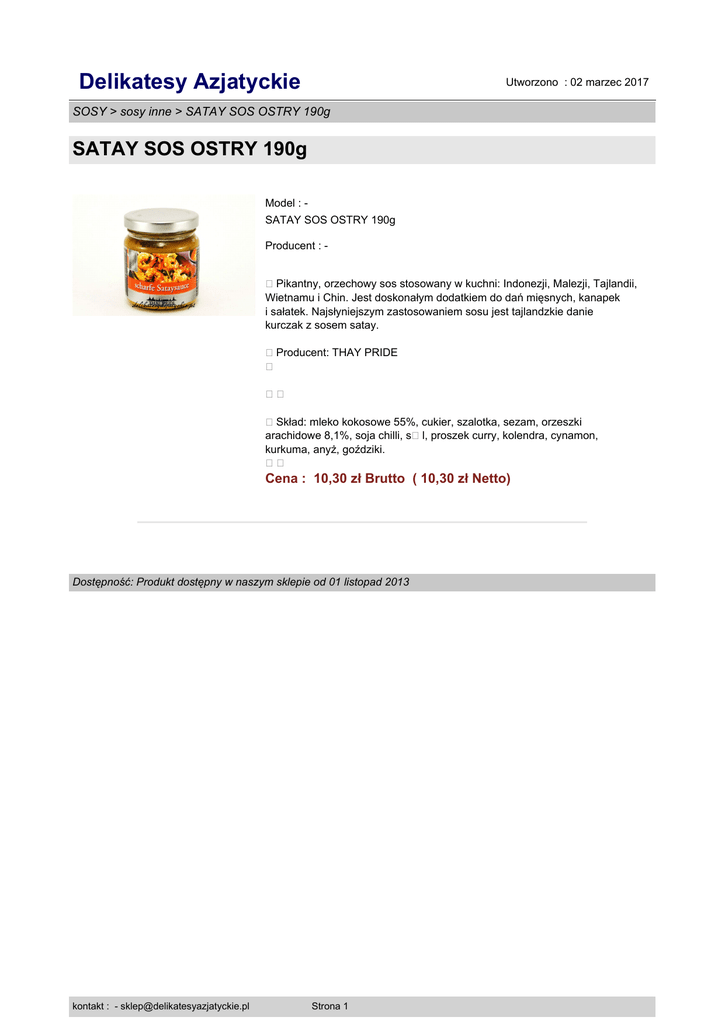 Delikatesy Azjatyckie Utworzono : 02 marzec 2017 SOSY > sosy inne > SATAY SOS OSTRY 190g SATAY SOS OSTRY 190g Model : SATAY SOS OSTRY 190g Producent : Pikantny, orzechowy sos stosowany w kuchni: Indonezji, Malezji, Tajlandii, Wietnamu i Chin. Jest doskonałym dodatkiem do dań mięsnych, kanapek i sałatek. Najsłyniejszym zastosowaniem sosu jest tajlandzkie danie kurczak z sosem satay. Producent: THAY PRIDE � Skład: mleko kokosowe 55%, cukier, szalotka, sezam, orzeszki arachidowe 8,1%, soja chilli, s�l, proszek curry, kolendra, cynamon, kurkuma, anyż, goździki. � Cena : 10,30 zł Brutto ( 10,30 zł Netto) Dostępność: Produkt dostępny w naszym sklepie od 01 listopad 2013 kontakt : - [email protected] Strona 1