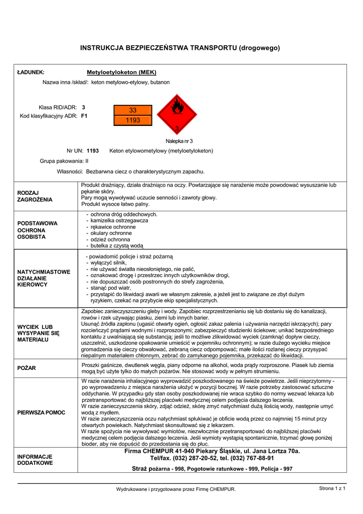 INSTRUKCJA BEZPIECZEŃSTWA TRANSPORTU (drogowego) ŁADUNEK: Metyloetyloketon (MEK) Nazwa inna /skład/: keton metylowo-etylowy, butanon Klasa RID/ADR: 3 33 Kod klasyfikacyjny ADR: F1 1193 Nalepka nr 3 Nr UN: 1193 Keton etylowometylowy (metyloetyloketon) Grupa pakowania: II Własności: Bezbarwna ciecz o charakterystycznym zapachu. RODZAJ ZAGROŻENIA Produkt drażniący, działa drażniąco na oczy. Powtarzające się narażenie może powodować wysuszanie lub pękanie skóry. Pary mogą wywoływać uczucie senności i zawroty głowy. Produkt wysoce łatwo palny. PODSTAWOWA OCHRONA OSOBISTA - ochrona dróg oddechowych. kamizelka ostrzegawcza rękawice ochronne okulary ochronne odzież ochronna butelka z czystą wodą NATYCHMIASTOWE DZIAŁANIE KIEROWCY - powiadomić policje i straż pożarną - wyłączyć silnik, - nie używać światła nieosłoniętego, nie palić, - oznakować drogę i przestrzec innych użytkowników drogi, - nie dopuszczać osób postronnych do strefy zagrożenia, - stanąć pod wiatr, - przystąpić do likwidacji awarii we własnym zakresie, a jeżeli jest to związane ze zbyt dużym ryzykiem, czekać na przybycie ekip specjalistycznych. WYCIEK LUB WYSYPANIE SIĘ MATERIAŁU Zapobiec zanieczyszczeniu gleby i wody. Zapobiec rozprzestrzenianiu się lub dostaniu się do kanalizacji, rowów i rzek używając piasku, ziemi lub innych barier. Usunąć źródła zapłonu (ugasić otwarty ogień, ogłosić zakaz palenia i używania narzędzi iskrzących); pary rozcieńczyć prądami wodnymi i rozproszonymi; zabezpieczyć studzienki ściekowe; unikać bezpośredniego kontaktu z uwalniającą się substancją; jeśli to możliwe zlikwidować wyciek (zamknąć dopływ cieczy, uszczelnić, uszkodzone opakowanie umieścić w pojemniku ochronnym); w razie dużego wycieku miejsce gromadzenia się cieczy obwałować, zebraną ciecz odpompować; małe ilości rozlanej cieczy przysypać niepalnym materiałem chłonnym, zebrać do zamykanego pojemnika, przekazać do likwidacji. POŻAR Proszki gaśnicze, dwutlenek węgla, piany odporne na alkohol, woda prądy rozproszone. Piasek lub ziemia mogą być użyte tylko do małych pożarów. Nie stosować wody w pełnym strumieniu. PIERWSZA POMOC W razie narażenia inhalacyjnego wyprowadzić poszkodowanego na świeże powietrze. Jeśli nieprzytomny po wyprowadzeniu z miejsca narażenia ułożyć w pozycji bocznej. W razie potrzeby zastosować sztuczne oddychanie. W przypadku gdy stan osoby poszkodowanej nie wraca szybko do normy wezwać lekarza lub przetransportować do najbliższej placówki medycznej celem podjęcia dalszego leczenia. W razie zanieczyszczenia skóry, zdjąć odzież, skórę zmyć natychmiast dużą ilością wody, następnie umyć wodą z mydłem. W razie zanieczyszczenia oczu natychmiast spłukiwać je obficie wodą przez co najmniej 15 minut przy otwartych powiekach. Natychmiast skonsultować się z lekarzem. W razie spożycia nie wywoływać wymiotów, niezwłocznie przetransportować do najbliższej placówki medycznej celem podjęcia dalszego leczenia. Jeśli wymioty wystąpią spontanicznie, trzymać głowę poniżej bioder, aby nie dopuścić do przedostania się do płuc. INFORMACJE DODATKOWE Firma CHEMPUR 41-940 Piekary Śląskie, ul. Jana Lortza 70a. Tel/fax. (032) 287-20-52, tel. (032) 767-88-91 Straż pożarna - 998, Pogotowie ratunkowe - 999, Policja - 997 Wydrukowane i przygotowane przez Firmę CHEMPUR. Strona 1 z 1