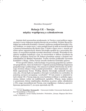 Stanisław Konopacki* Relacje UE – Turcja: między współpracą a członkostwem Istnieje dość powszechne przekonanie, że Turcja w swej polityce zagranicznej w coraz większym stopniu kieruje się na wschód. Premier Recep Erdoğan ma znakomite kontakty z Iranem, niedawno podpisał kontrakty z Syrią i Irakiem, a w maju 2010 r. ostro potępił Izrael za atak na turecki konwój z pomocą humanitarną dla Strefy Gazy. Z kolei w lipcu 2010 r. turecki minister spraw zagranicznych Ahmet Davutoğlu spotkał się z przywódcą Hamasu, co oczywiście musiało wywołać oburzenie w Izraelu. Wszystkie te inicjatywy mogłyby świadczyć o tym, że rzeczywiście w obliczu wycofania się Europy z przyjęcia Turcji do UE Ankara poszukuje sojuszy z krajami muzułmańskimi na Bliskim Wschodzie. Trzeba również podkreślić ożywienie kontaktów z Rosją, z którą Turcja zawarła niedawno kontrakty gazowe. W ten sposób Ankara, wykorzystując swą pozycję gospodarczą i położenie geograficzne, stara się budować w regionie pozycję lokalnego hegemona gospodarczego i politycznego. Nie oznacza to jednak odwrócenia się od Europy, bowiem relacje z Unią są nadal priorytetem – choć niejedynym – polityki zagranicznej Turcji. Według Ahmeta Davutoğlu nadszedł wreszcie czas, aby „Turcja była europejska w Europie i wschodnia na wschodzie, bo jesteśmy zarazem europejscy i wschodni”.1 W tym sensie w ostatnich latach relacje UE z Turcją stają się coraz bardziej uwikłane w politykę zagraniczną Ankary wobec jej najbliższych sąsiadów. Więcej, mają miejsce w przestrzeni, której współrzędne określone są przez: pełne członkostwo w UE, czego rzecznikiem jest Turcja, oraz współpracę z Ankarą („uprzywilejowane partnerstwo”), za czym opowiada się UE. * Dr hab. Stanisław Konopacki – Uniwersytet Łódzki; Uniwersytet Kardynała Stefana Wyszyńskiego w Warszawie. 1 O. Matthews, Turcja między Zachodem i Wschodem, „Europa. Magazyn Idei Newsweeka” nr 8/2010, s. 7. 9 Studia Europejskie, 2/2011 Celem niniejszego artykułu jest ukazanie najważniejszych źródeł tych przeciwstawnych tendencji, z których wyłania się obraz wzajemnych relacji Europy z Turcją mających nierzadko paradoksalny charakter. Autor podjął też próbę zarysowania możliwości wyjścia z błędnego koła i znalezienia korzystnego dla obydwu stron rozwiązania. Europejskość Turcji Wśród argumentów przeciwko członkostwu w UE często pojawia się stwierdzenie, że Turcja to kraj nieeuropejski. Otóż nie jest to argument do końca przekonujący i pozostaje w sprzeczności z niektórymi sądami i faktami. Należy zauważyć, że już w XVII w. dopuszczano obecność Turcji w rodzinie europejskiej. Założyciel Pensylwanii i Filadelfii William Penn w opublikowanym w 1693 r. traktacie O obecnym i przyszłym pokoju w Europie zaproponował utworzenie europejskiego związku państw z udziałem Turcji.2 W końcu XIX w. do tego kraju przylgnęła etykieta „chorego człowieka Europy”, co by znaczyło, że przez ówczesnych przywódców politycznych był jednak postrzegany jako europejski. Z tego punktu widzenia interesująco przedstawiają się poglądy Konstantego Borzęckiego, dawnego kleryka seminarium duchownego we Włocławku, który po swej ucieczce z klasztoru w 1848 r. i klęsce powstania wielkopolskiego dzięki pomocy Hôtel Lambert wyjechał do Turcji. W swej nowej ojczyźnie przechodzi na islam i, jako Mustafa Celaleddin, zaczyna robić karierę w osmańskiej armii.3 Mustafa Celaleddin-Borzęcki wsławił się również działalnością publicystyczną. W swej pracy Dawni i nowi Turcy dowodzi, że Turcy, podobnie jak Francuzi, Niemcy czy Polacy, są narodem europejskim. Nazywając swą koncepcję turioarianizmem, przekonywał Turków do zmiany alfabetu arabskiego na łaciński. Jak wiadomo, zmiana alfabetu stała się jedną z wielkich reform przeprowadzonych przez Atatürka pół wieku później. O europejskości Turcji może również świadczyć fakt, że stała się członkiem Rady Europy w 1949 r. Ponadto coś musi być na rzeczy, skoro Ankara ściśle współpracuje z Unią Zachodnioeuropejską4 (UZE), a tureccy oficerowie służą w eurokorpusach powstałych przy tej organizacji. Warto dodać, że w unijnych grupach bojowych powstał oddział włosko-rumuńsko-tuK. Łastawski, Od idei do integracji europejskiej, Warszawa 2004, s. 34. W. Szabłowski, Zabójca z miasta moreli. Reportaże z Turcji, Wołowiec 2010, s. 18 4 Turcja jest stowarzyszonym członkiem Unii Zachodnioeuropejskiej od 1992 r. 2 3 10 S. Konopacki, Relacje UE – Turcja: między współpracą a członkostwem recki, który w połowie 2010 r. uzyskał zdolność działania.5 Poza tym tureccy policjanci i żołnierze uczestniczą we wszystkich unijnych misjach cywilnych i wojskowych na Bałkanach. W tym kontekście zgoła symbolicznego znaczenia nabiera fakt przyznania Stambułowi tytułu Europejskiej Stolicy Kultury w 2010 r. Rok 2005 Po wielu latach usilnych przygotowań Unia Europejska rozpoczęła negocjacje akcesyjne z Turcją w końcu 2005 r. To rok, któremu dano miano annus horribilis,6 albowiem w referendum dotyczącym przygotowywanego w morzu trudności Traktatu Konstytucyjnego społeczeństwa Francji i Holandii zagłosowały przeciwko temu dokumentowi. Rzeczywiste powody odrzucenia traktatu, którego zwykli obywatele przecież nie znali, nie dotyczyły zupełnie jego treści. Po pierwsze, francuskie i holenderskie referenda w sprawie Traktatu Konstytucyjnego, opracowanego m.in. w celu „przybliżenia Unii do obywateli” i przezwyciężenia deficytu demokracji, ujawniły przepaść, jaka istnieje między europejskimi elitami i obywatelami. Były wyrazem zdecydowanego sprzeciwu społeczeństw wobec polityków, którzy w niedostatecznym stopniu wyjaśniają obywatelom swoje decyzje i poczynania. Francuzi i Holendrzy głosowali nie tyle przeciw eurokonstytucji, o której wiedzieli niewiele, ile przeciw elit