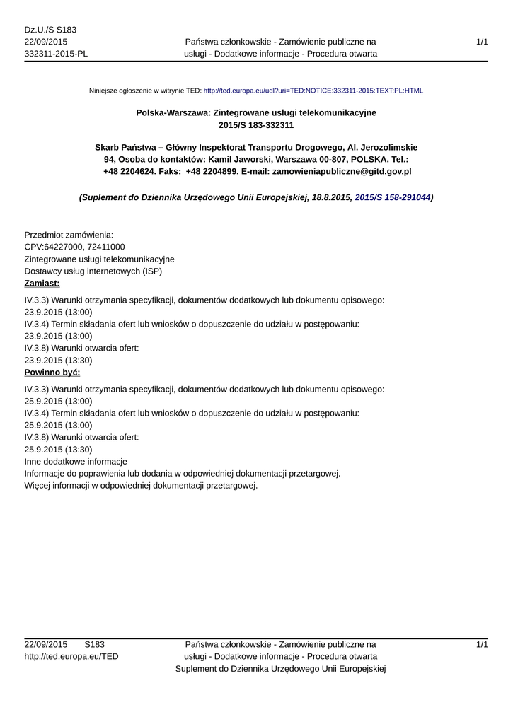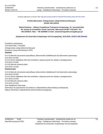 Dz.U./S S183 22/09/2015 332311-2015-PL Państwa członkowskie - Zamówienie publiczne na usługi - Dodatkowe informacje - Procedura otwarta 1/1 Niniejsze ogłoszenie w witrynie TED: http://ted.europa.eu/udl?uri=TED:NOTICE:332311-2015:TEXT:PL:HTML Polska-Warszawa: Zintegrowane usługi telekomunikacyjne 2015/S 183-332311 Skarb Państwa – Główny Inspektorat Transportu Drogowego, Al. Jerozolimskie 94, Osoba do kontaktów: Kamil Jaworski, Warszawa 00-807, POLSKA. Tel.: +48 2204624. Faks: +48 2204899. E-mail: [email protected] (Suplement do Dziennika Urzędowego Unii Europejskiej, 18.8.2015, 2015/S 158-291044) Przedmiot zamówienia: CPV:64227000, 72411000 Zintegrowane usługi telekomunikacyjne Dostawcy usług internetowych (ISP) Zamiast: IV.3.3) Warunki otrzymania specyfikacji, dokumentów dodatkowych lub dokumentu opisowego: 23.9.2015 (13:00) IV.3.4) Termin składania ofert lub wniosków o dopuszczenie do udziału w postępowaniu: 23.9.2015 (13:00) IV.3.8) Warunki otwarcia ofert: 23.9.2015 (13:30) Powinno być: IV.3.3) Warunki otrzymania specyfikacji, dokumentów dodatkowych lub dokumentu opisowego: 25.9.2015 (13:00) IV.3.4) Termin składania ofert lub wniosków o dopuszczenie do udziału w postępowaniu: 25.9.2015 (13:00) IV.3.8) Warunki otwarcia ofert: 25.9.2015 (13:30) Inne dodatkowe informacje Informacje do poprawienia lub dodania w odpowiedniej dokumentacji przetargowej. Więcej informacji w odpowiedniej dokumentacji przetargowej. 22/09/2015 S183 http://ted.europa.eu/TED Państwa członkowskie - Zamówienie publiczne na usługi - Dodatkowe informacje - Procedura otwarta Suplement do Dziennika Urzędowego Unii Europejskiej 1/1