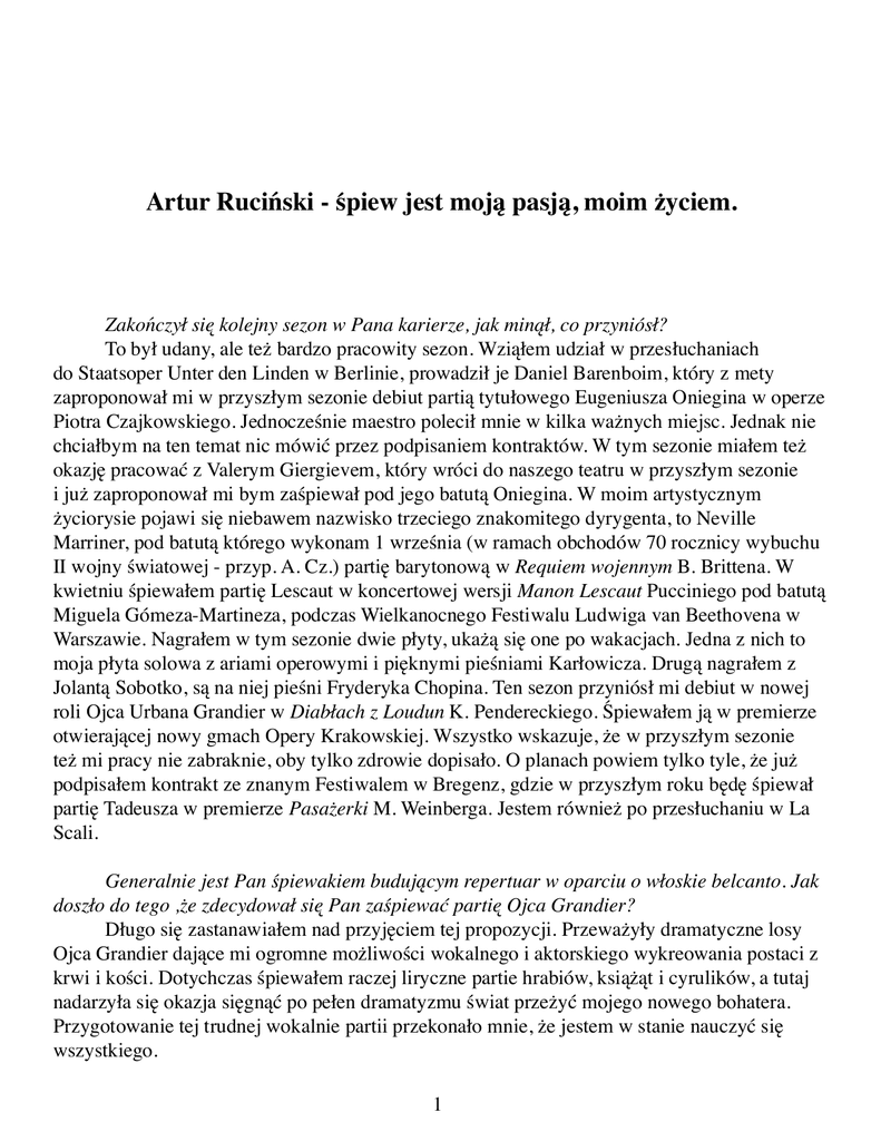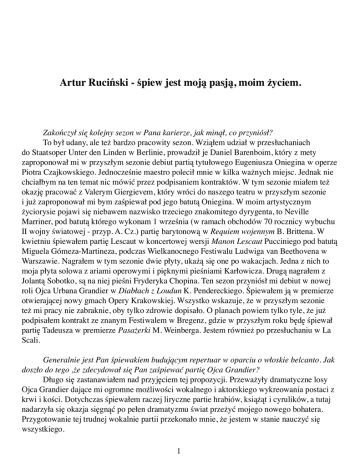 Artur Ruciński - śpiew jest moją pasją, moim życiem. Zakończył się kolejny sezon w Pana karierze, jak minął, co przyniósł? To był udany, ale też bardzo pracowity sezon. Wziąłem udział w przesłuchaniach do Staatsoper Unter den Linden w Berlinie, prowadził je Daniel Barenboim, który z mety zaproponował mi w przyszłym sezonie debiut partią tytułowego Eugeniusza Oniegina w operze Piotra Czajkowskiego. Jednocześnie maestro polecił mnie w kilka ważnych miejsc. Jednak nie chciałbym na ten temat nic mówić przez podpisaniem kontraktów. W tym sezonie miałem też okazję pracować z Valerym Giergievem, który wróci do naszego teatru w przyszłym sezonie i już zaproponował mi bym zaśpiewał pod jego batutą Oniegina. W moim artystycznym życiorysie pojawi się niebawem nazwisko trzeciego znakomitego dyrygenta, to Neville Marriner, pod batutą którego wykonam 1 września (w ramach obchodów 70 rocznicy wybuchu II wojny światowej - przyp. A. Cz.) partię barytonową w Requiem wojennym B. Brittena. W kwietniu śpiewałem partię Lescaut w koncertowej wersji Manon Lescaut Pucciniego pod batutą Miguela Gómeza-Martineza, podczas Wielkanocnego Festiwalu Ludwiga van Beethovena w Warszawie. Nagrałem w tym sezonie dwie płyty, ukażą się one po wakacjach. Jedna z nich to moja płyta solowa z ariami operowymi i pięknymi pieśniami Karłowicza. Drugą nagrałem z Jolantą Sobotko, są na niej pieśni Fryderyka Chopina. Ten sezon przyniósł mi debiut w nowej roli Ojca Urbana Grandier w Diabłach z Loudun K. Pendereckiego. Śpiewałem ją w premierze otwierającej nowy gmach Opery Krakowskiej. Wszystko wskazuje, że w przyszłym sezonie też mi pracy nie zabraknie, oby tylko zdrowie dopisało. O planach powiem tylko tyle, że już podpisałem kontrakt ze znanym Festiwalem w Bregenz, gdzie w przyszłym roku będę śpiewał partię Tadeusza w premierze Pasażerki M. Weinberga. Jestem również po przesłuchaniu w La Scali. Generalnie jest Pan śpiewakiem budującym repertuar w oparciu o włoskie belcanto. Jak doszło do tego ,że zdecydował się Pan zaśpiewać partię Ojca Grandier? Długo się zastanawiałem nad przyjęciem tej propozycji. Przeważyły dramatyczne losy Ojca Grandier dające mi ogromne możliwości wokalnego i aktorskiego wykreowania postaci z krwi i kości. Dotychczas śpiewałem raczej liryczne partie hrabiów, książąt i cyrulików, a tutaj nadarzyła się okazja sięgnąć po pełen dramatyzmu świat przeżyć mojego nowego bohatera. Przygotowanie tej trudnej wokalnie partii przekonało mnie, że jestem w stanie nauczyć się wszystkiego. 1 2 Pana dotychczasowa kariera związana jest przede wszystkim z polskimi scenami. Występy zagraniczne pojawiają się w pańskiej dotychczasowej karierze rzadko, nie ma Pan parcia na zagranicę? To była moja w pełni świadoma decyzja, że na początek kariery będzie związany z polskimi teatrami. Nie żałuję tego kroku, więcej jestem z tej decyzji dumny! Śpiew to moja pasja i moje życie, ale zrobienie wielkiej kariery nie może się odbywać za wszelką cenę. Najpierw szczęście moich bliskich, dopiero później kariera. Cieszy mnie też fakt, że w Polsce po każdym występie mam miłe dowody sympatii publiczności, a i oceny krytyków też dają mi powody do satysfakcji. Dotychczas zaśpiewałem na polskich scenach 17 partii, najchętniej wracam do Łucji z Lammermoor, gdzie śpiewam partię hrabiego Ashtona. Na zdobywanie zagranicznych scen przyjdzie jeszcze czas, zresztą już powoli i w tym względzie następują zmiany. Jednak w tej chwili najważniejsza dla mnie jest moja rodzina i grono przyjaciół, a to wymaga byśmy jak najczęściej byli razem. Ponadto na polskich scenach śpiewam te partie, które warunkują mój stały rozwój i sprawiają mi radość. Szybko okazało się, że moje postępowanie przynosi rezultaty, propozycje zagranicznych występów zaczęły spływać same. Wybieram te, które uwzględniają moje aktualne możliwości wokalne. 3 4 Proszę przypomnieć jak wyglądały początki pańskiej kariery? Studiowałem w Akademii Muzycznej w Warszawie w klasie prof. Jerzego Knetiga. Debiutowałem jako Gugliemo w studenckim przedstawieniu Cosi fan tutte Mozarta. W 2001 roku śpiewałem rolę Papagena w Czarodziejskim flecie Mozarta w Warszawskiej Operze Kameralnej podczas tournée teatru po Hiszpanii. W kwietniu 2002 roku debiutowałem partią tytułowego Eugeniusza Oniegina na scenie Opery Narodowej w Warszawie, pod batutą Jacka Kaspszyka. Później śpiewałem na tej scenie m.in. Lorda Ashtona w Łucji z Lammermoor, Figara w Cyruliku sewilskim, Księcia Jeleckiego w Damie pikowej, Niklasa i Muzę w Opowieściach Hoffmanna oraz Walentego w Fauście. Jestem też laureatem kilku międzynarodowych konkursów wokalnych: we Lwowie, im. Adama Didura w Bytomiu, Belvedere w Wiedniu. Jak na śpiewaka o niezbyt długim stażu cieszy się Pan niezwykłą popularnością, czego ma Pan wiele dowodów. Co znaczy dla Pana uznanie publiczności i krytyki? Jest to dla mnie niezwykle ważne, czasami jestem zupełnie zaskakiwany tymi dowodami uznania. Często wychodzą one od ludzi znakomicie się znających na operowym śpiewie. Mam też od lat swoją wierną publiczność co wyjątkowo sobie cenię. Jestem przekonany, że uznanie publiczności uskrzydla i jest każdemu artyście potrzebne bo dowodzi, że jego praca ma sens. Buduje Pan karierę z niezwykłą rozwagą. Co leży u jej podstaw? Przede wszystkim każdy śpiewak powinien bardzo ostrożnie dobierać repertuar uwzględniając aktualne możliwości swojego głosu. Nie można porywać się zbyt wcześnie na wielkie partie dramatyczne. A z czymś takim spotykają się młodzi śpiewacy bardzo często. Jak tylko o młodym śpiewaku zaczyna być głośno to bardzo często takie propozycje są mu składane. Uważam, że do przyjmowania nowych propozycji należy podchodzić bardzo ostrożnie i przyjmować tylko te, które pomogą nam w wsze