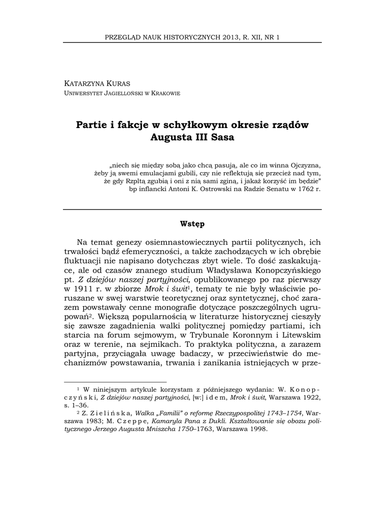PRZEGLĄD NAUK HISTORYCZNYCH 2013, R. XII, NR 1 KATARZYNA KURAS UNIWERSYTET JAGIELLOŃSKI W KRAKOWIE Partie i fakcje w schyłkowym okresie rządów Augusta III Sasa „niech się między sobą jako chcą pasują, ale co im winna Ojczyzna, żeby ją swemi emulacjami gubili, czy nie reflektują się przecież nad tym, że gdy Rzpltą zgubią i oni z nią sami zginą, i jakaż korzyść im będzie” bp inflancki Antoni K. Ostrowski na Radzie Senatu w 1762 r. Wstęp Na temat genezy osiemnastowiecznych partii politycznych, ich trwałości bądź efemeryczności, a także zachodzących w ich obrębie fluktuacji nie napisano dotychczas zbyt wiele. To dość zaskakujące, ale od czasów znanego studium Władysława Konopczyńskiego pt. Z dziejów naszej partyjności, opublikowanego po raz pierwszy w 1911 r. w zbiorze Mrok i świt1, tematy te nie były właściwie poruszane w swej warstwie teoretycznej oraz syntetycznej, choć zarazem powstawały cenne monografie dotyczące poszczególnych ugrupowań2. Większą popularnością w literaturze historycznej cieszyły się zawsze zagadnienia walki politycznej pomiędzy partiami, ich starcia na forum sejmowym, w Trybunale Koronnym i Litewskim oraz w terenie, na sejmikach. To praktyka polityczna, a zarazem partyjna, przyciągała uwagę badaczy, w przeciwieństwie do mechanizmów powstawania, trwania i zanikania istniejących w prze- W niniejszym artykule korzystam z późniejszego wydania: W. K o n o p c z y ń s k i, Z dziejów naszej partyjności, [w:] i d e m, Mrok i świt, Warszawa 1922, s. 1–36. 2 Z. Z i e l i ń s k a, Walka „Familii” o reformę Rzeczypospolitej 1743–1754, Warszawa 1983; M. C z e p p e, Kamaryla Pana z Dukli. Kształtowanie się obozu politycznego Jerzego Augusta Mniszcha 1750–1763, Warszawa 1998. 1 62 KATARZYNA KURAS szłości podziałów3. Być może za ten stan rzeczy odpowiada przyjmowana intuicyjnie definicja „partii” oraz „partyjności”4, która prowadzi zarazem do ich dość dowolnego stosowania w narracji historycznej. Termin „partia”, choć w opinii badaczy nieadekwatny do opisu osiemnastowiecznej rzeczywistości, jest dość często traktowany jako synonim stronnictwa bądź obozu5. Wiąże się z tym zarazem wyraźna tendencja do zastępowania go innymi określeniami, np. obóz, fakcja, koteria, które zdaniem wielu historyków lepiej pasują do opisu rzeczywistości „prepartyjnej”6. Źródła tego mechanizmu tkwią zapewne w przywiązaniu do współczesnej definicji partii7 oraz w przekonaniu, że partie stanowiły finalny produkt pewnego procesu polegającego na żmudnej ewolucji form „prepartyjnych”. W tym ujęciu to rozwój struktur organizacyjnych oraz płaszczyzny programowej decydował o zastąpieniu doraźnych fakcji przez tryby machin partyjnych. W konsekwencji intuicyjne stosowanie pojęcia „partia” w narracji historycznej stanowi narzędzie klasyfikujące stopień ewolucji partyjności i wprowadza w in3 Np. J. D y g d a ł a, Życie polityczne Prus Królewskich u schyłku ich związku z Rzecząpospolitą w XVIII wieku, Warszawa 1984, s. 80–106; T. S z w a c i ń s k i, Sejmiki poselskie przed konwokacją 1764 r., „Kwartalnik Historyczny” 2006, R. CXIII, z. 1, s. 19–56. 4 Ogólne informacje na temat partii i systemów partyjnych por. M. G u l c z y ń s k i, A. M a ł k i e w i c z, Wiedza o partiach i systemach partyjnych. Podręcznik akademicki, Warszawa 2008; różne definicje terminu „partia” – M. C h m a j, W. S o k ó ł, M. Ż m i g r o d z k i, Teoria partii politycznych, Lublin 2001, s. 14–20. 5 Por. Z. Z i e l i ń s k a, Magnaten und Adel im politischen Landleben Polen-Litauens des 18. Jahrhunderts, [w:] Klientelesysteme im Europa der Frühen Neuzeit, red. A. Mączak, E. Müller-Luckner, München 1988, s. 203. 6 Dla S. Ochmann-Staniszewskiej fakcje to grupy nacisku organizowane przy lokalnych elitach władzy w celu osiągnięcia doraźnych celów politycznych. Porozumienia pomiędzy fakcjami, w tym konfederacje rokoszowe z lat 1606–1609 i 1665–1666 traktuje ona jako „coś w rodzaju quasi-partii politycznej, organizującej się ad hoc i na krótki okres”. Por. e a d e m, Od stabilizacji do kryzysu władzy królewskiej. Państwo Wazów, [w:] Między monarchią a demokracją. Studia z dziejów Polski XV–XVIII wieku, red. A. Sucheni-Grabowska, M. Żaryn, Warszawa 1994, s. 237. Podobnie traktują temat opracowania politologiczne np. M. C h m a j, W. S o k ó ł, M. Ż m i g r o d z k i, op. cit., s. 25. Z. Zielińska z kolei uważa, że dla opisu sceny politycznej w czasach saskich adekwatne jest określenie koteria, a nie partia. Por. Z. Z i e l i ń s k a, Mechanizm sejmikowy i klientela radziwiłłowska za Sasów, „Przegląd Historyczny” 1971, t. LXII, z. 3, s. 400; e a d e m, Magnaten und Adel…, s. 203. 7 O potrzebie pojmowania i wczuwania się w XVIII-wieczne znaczenie polityki: J. M i c h a l s k i, Problematyka polskiej elity politycznej XVIII wieku, „Wiek Oświecenia” 1988, t. V, s. 19. Partie i fakcje w schyłkowym okresie rządów… 63 tencji autorów pewną gradację w jej opisie, w którym „fakcję” i „partię” dzieli niezdefiniowany bliżej dystans. Termin „partia” oczywiście istniał w osiemnastowiecznym słowniku debaty politycznej i był często używany8. Sytuację komplikuje fakt, że już współcześni nie do końca zdawali sobie sprawę z różnic istniejących pomiędzy partią a fakcją9. Według Davida Hume’a, istniały dwa typy grup: personalne i realne. Fakcje „personalne” funkcjonowały wykorzystując przyjaźnie i animozje, podczas gdy członków stronnictw „realnych” łączyło poczucie odrębności i dążenie do osiągnięcia pewnego celu10. Różnice między „fakcją” (tożsamą z grupą personalną) a „partią” (grupa realna) były dla D. Hume’a co najmniej płynne, jednak wszelkie negatywne konotacje łączył on z fakcyjnością – niebezpieczną zarówno dla rzą