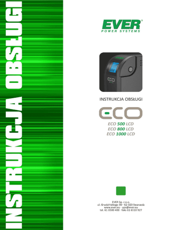Instrukcja obsługi zasilaczy serii ECO LCD SPIS TREŚCI WSTĘP ...................................................................................................................................... 3 OGÓLNA CHARAKTERYSTYKA ZASILACZA .............................................................. 3 INSTRUKCJA BHP ................................................................................................................. 4 INSTALACJA ZASILACZA .................................................................................................. 5 ROZPAKOWANIE ................................................................................................................ 5 WYBÓR MIEJSCA INSTALACJI........................................................................................ 5 BUDOWA ZASILACZA ....................................................................................................... 6 ELEMENTY NA PANELU CZOŁOWYM I BOCZNYM ..................................................... 6 PANEL TYLNY ................................................................................................................... 7 IKONY INFORMACYJNE WYŚWIETLACZA LCD ........................................................... 7 OPIS ZNACZENIA IKON INFORMACYJNYCH WYŚWIETLACZA LCD ......................... 8 OPIS PRZYCISKU WIELOFUNKCYJNEGO ZASILACZA................................................ 9 URUCHOMIENIE i OBSŁUGA ZASILACZA .................................................................. 10 WSPOŁPRACA ZASILACZA Z KOMPUTEREM .......................................................... 13 CHARAKTERYSTYKA PRACY ZASILACZA ................................................................ 14 OPIS OGÓLNY ................................................................................................................... 14 ZABEZPIECZENIA ............................................................................................................ 15 PRZECIĄŻENIOWE ......................................................................................................... 15 PRZECIWZWARCIOWE .................................................................................................. 15 PRZECIWPRZEPIĘCIOWE ............................................................................................. 15 UWAGI EKSPLOATACYJNE ............................................................................................ 16 BEZPIECZNIK .................................................................................................................... 16 WSPÓŁPRACA Z AGREGATAMI PRĄDOTWÓRCZYMI ............................................ 16 WYKORZYSTANIE FILTRA TELEINFORMATYCZNEGO ......................................... 16 WYMIANA AKUMULATORÓW...................................................................................... 17 PRZECHOWYWANIE, KONSERWACJA I TRANSPORT ............................................. 17 UTYLIZACJA ..................................................................................................................... 17 PARAMETRY TECHNICZNE ............................................................................................ 18 INFORMACJE DOTYCZĄCE PRZEPISÓW I GWARANCJI....................................... 19 DEKLARACJA ZGODNOŚCI............................................................................................ 19 GWARANCJA ..................................................................................................................... 19 POLECANE DODATKOWE AKCESORIA (nie zawarte w zestawie UPS) ................... 19 LISTWA ANTYPRZEPIĘCIOWA EVER .......................................................................... 19 2012/08/13 Pomoc Techniczna, tel. +48 61 6500 400 www.ever.eu 2 Instrukcja obsługi zasilaczy serii ECO LCD WSTĘP Dziękujemy za dokonanie zakupu zasilacza awaryjnego ECO LCD. Przed rozpoczęciem użytkowania prosimy o zapoznanie się z niniejszą instrukcją. Mamy nadzieję, że zakupiony UPS spełni Państwa oczekiwania. Zasilacze EVER ECO LCD zabezpieczają podłączone do nich urządzenia przed spadkami oraz zanikami napięcia w sieci, a także eliminują możliwość uszkodzeń w wyniku przepięć w sieci elektrycznej. Głównym przeznaczeniem zasilaczy EVER z serii ECO LCD są: komputery PC, konsole do gier, sieci i urządzenia telekomunikacyjne (WiFi), monitory, drukarki atramentowe, systemy kasowe. OGÓLNA CHARAKTERYSTYKA ZASILACZA Cztery gniazda wyjściowe IEC 320 z ochroną przeciwprzepięciową oraz z podtrzymaniem awaryjnym (kolor czarny). Cztery gniazda wyjściowe IEC 320 sieciowe z ochroną przeciwprzepięciową, bez podtrzymania awaryjnego (kolor biały - tylko w wersjach ECO 800 LCD oraz ECO 1000 LCD). “Zimny start” – możliwość uruchomienia bez podłączonego zasilania z sieci. Rozbudowany panel LCD (EVS) – wizualna informacja dotycząca określonych stanów i parametrów pracy. Dźwiękowa sygnalizacja określonych stanów pracy. Cyfrowy monitoring stopnia naładowania baterii (DBM). Inteligentny przycisk wielofunkcyjny (IMB). Mikroprocesorowa kontrola parametrów. Podwójny system zabezpieczenia (DPS). Tryb oszczędzania energii (GREEN FUNCTION). Szybka i łatwa wymiana baterii (ESB). Filtr teleinformatyczny (złącze RJ45). Komunikacja z komputerem poprzez port USB. 2012/08/13 Pomoc Techniczna, tel. +48 61 6500 400 www.ever.eu 3 Instrukcja obsługi zasilaczy serii ECO LCD INSTRUKCJA BHP Praca zasilacza oraz jego magazynowanie powinny odbywać się w warunkach zgodnych ze specyfikacją urządzenia (rozdziały: INSTALACJA ZASILACZA, CHARAKTERYSTYKA PRACY ZASILACZA, UWAGI EKSPLOATACYJNE oraz PARAMETRY TECHNICZNE). W przypadku wystąpienia zwarcia duży prąd może spowodować poważne oparzenia. Przed podłączeniem urządzenia należy sprawdzić stan techniczny przewodów, wtyków i gniazd zasilania oraz stan samego urządzenia. Urządzenie musi być włączone do gniazda trójprzewodowego (bi