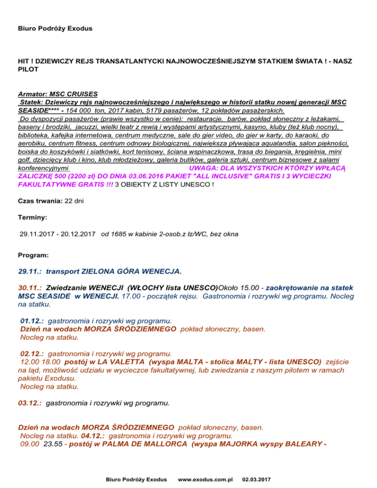 Biuro Podróży Exodus HIT ! DZIEWICZY REJS TRANSATLANTYCKI NAJNOWOCZEŚNIEJSZYM STATKIEM ŚWIATA ! - NASZ PILOT Armator: MSC CRUISES Statek: Dziewiczy rejs najnowocześniejszego i największego w historii statku nowej generacji MSC SEASIDE**** - 154 000 ton, 2017 kabin, 5179 pasażerów, 12 pokładów pasażerskich. Do dyspozycji pasażerów (prawie wszystko w cenie): restauracje, barów, pokład słoneczny z leżakami, baseny i brodziki, jacuzzi, wielki teatr z rewią i występami artystycznymi, kasyno, kluby (też klub nocny), biblioteka, kafejka internetowa, centrum medyczne, sale do gier video, do gier w karty, do karaoki, do aerobiku, centrum fitness, centrum odnowy biologicznej, największa pływająca aqualandia, salon piękności, boiska do koszykówki i siatkówki, kort tenisowy, ściana wspinaczkowa, trasa do biegania, kręgielnia, mini golf, dziecięcy klub i kino, klub młodzieżowy, galeria butików, galeria sztuki, centrum biznesowe z salami konferencyjnymi POLSKI PILOT Z ZIELONEJ GÓRY UWAGA: DLA WSZYSTKICH KTÓRZY WPŁACĄ ZALICZKĘ 500 (2200 zł) DO DNIA 03.06.2016 PAKIET "ALL INCLUSIVE" GRATIS I 3 WYCIECZKI FAKULTATYWNE GRATIS !!! 3 OBIEKTY Z LISTY UNESCO ! Czas trwania: 22 dni Terminy: 29.11.2017 - 20.12.2017 od 1685 w kabinie 2-osob.z łz/WC, bez okna Program: 29.11.: transport ZIELONA GÓRA WENECJA. 30.11.: Zwiedzanie WENECJI (WŁOCHY lista UNESCO)Około 15.00 - zaokrętowanie na statek MSC SEASIDE w WENECJI. 17.00 - początek rejsu. Gastronomia i rozrywki wg programu. Nocleg na statku. 01.12.: gastronomia i rozrywki wg programu. Dzień na wodach MORZA ŚRÓDZIEMNEGO pokład słoneczny, basen. Nocleg na statku. 02.12.: gastronomia i rozrywki wg programu. 12.00 18.00 postój w LA VALETTA (wyspa MALTA - stolica MALTY - lista UNESCO) zejście na ląd, możliwość udziału w wycieczce fakultatywnej, lub zwiedzania z naszym pilotem w ramach pakietu Exodusu. Nocleg na statku. 03.12.: gastronomia i rozrywki wg programu. Dzień na wodach MORZA ŚRÓDZIEMNEGO pokład słoneczny, basen. Nocleg na statku. 04.12.: gastronomia i rozrywki wg programu. 09.00 23.55 - postój w PALMA DE MALLORCA (wyspa MAJORKA wyspy BALEARY - Biuro Podróży Exodus www.exodus.com.pl 02.03.2017 HISZPANIA) - zejście na ląd, możliwość udziału w wycieczce fakultatywnej, lub zwiedzania z naszym pilotem w ramach pakietu Exodusu. Nocleg na statku. 05.12.: gastronomia i rozrywki wg programu.10.00 18.00 - postój w BARCELONIE (HISZPANIA lista UNESCO) - zejście na ląd, możliwość udziału w wycieczce fakultatywnej, lub zwiedzania miasta z naszym pilotem w ramach pakietu Exodusu. Nocleg na statku. 06.12.: gastronomia i rozrywki wg programu. Dzień na wodach MORZA ŚRÓDZIEMNEGO pokład słoneczny, basen. Przejście przez CIEŚNINĘ GIBRALTARSKĄ Nocleg na statku 07.12.: gastronomia i rozrywki wg programu.08.00 18.00 postój w KADYKSIE (HISZPANIA) zejście na ląd, możliwość udziału w wycieczce fakultatywnej, lub zwiedzania z naszym pilotem w ramach pakietu Exodusu. Nocleg na statku. 08.12.: gastronomia i rozrywki wg programu. Dzień na wodach MORZA ŚRÓDZIEMNEGOO pokład słoneczny, basen. Nocleg na statku. 09.12.: gastronomia i rozrywki wg programu. 08.00 17.00 postój w FUNCHAL (wyspa MADERA - PORTUGALIA) zejście na ląd, możliwość udziału w wycieczce fakultatywnej, lub zwiedzania z naszym pilotem w ramach pakietu Exodusu. Nocleg na statku. 10.12 14.12.: gastronomia i rozrywki wg programu. Dni na wodach OCEANU ATLANTYCKIEGO pokład słoneczny, basen. Nocleg na statku. 15.12.: gastronomia i rozrywki wg programu. 08.00 18.00 postój w PHILIPSBURG (wyspa ST.MAARTEN) zejście na ląd, możliwość udziału w wycieczce fakultatywnej, lub zwiedzania z naszym pilotem w ramach pakietu Exodusu. Nocleg na statku. 16.12.: gastronomia i rozrywki wg programu. 08.00 - 18.00 postój w CHARLOTTE AMALIE (AMERYKAŃSKIE WYSPY DZIEWICZE) - zejście na ląd, możliwość udziału w wycieczce fakultatywnej, lub zwiedzania z naszym pilotem w ramach pakietu Exodusu. Nocleg na statku. 17.12.: gastronomia i rozrywki wg programu.08.00 - 18.00 postój w SAN JUAN (PORTORYKO TERYTORIUM ZAMORSKIE USA) - zejście na ląd, możliwość udziału w wycieczce fakultatywnej, lub zwiedzania z naszym pilotem w ramach pakietu Exodusu. Nocleg na statku. 18.12.: gastronomia i rozrywki wg programu. 02.00 wznowienie rejsu. Dzień na wodach OCEANU ATLANTYCKIEGO pokład słoneczny, basen. Nocleg na statku. 19.12.: gastronomia i rozrywki wg programu. Dni na wodach OCEANU ATLANTYCKIEGO pokład słoneczny, basen. Biuro Podróży Exodus www.exodus.com.pl 02.03.2017 Nocleg na statku. 20.12.: gastronomia i rozrywki wg programu. Około 08.00 - wyokrętowanie w MIAMI. Transfer na lotnisko. Przeloty MIAMI BERLIN. Transport BERLIN ZIELONA GÓRA Biuro Podróży Exodus www.exodus.com.pl 02.03.2017