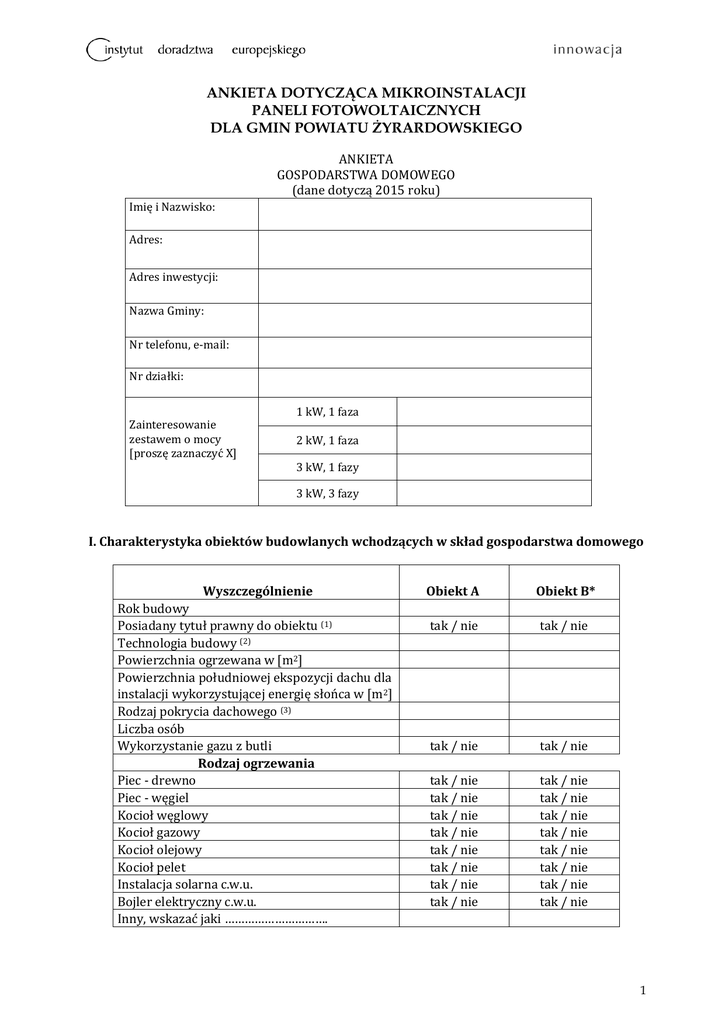 ANKIETA DOTYCZĄCA MIKROINSTALACJI PANELI FOTOWOLTAICZNYCH DLA GMIN POWIATU ŻYRARDOWSKIEGO ANKIETA GOSPODARSTWA DOMOWEGO (dane dotyczą 2015 roku) Imię i Nazwisko: Adres: Adres inwestycji: Nazwa Gminy: Nr telefonu, e-mail: Nr działki: Zainteresowanie zestawem o mocy [proszę zaznaczyć X] 1 kW, 1 faza 2 kW, 1 faza 3 kW, 1 fazy 3 kW, 3 fazy I. Charakterystyka obiektów budowlanych wchodzących w skład gospodarstwa domowego Wyszczególnienie Rok budowy Posiadany tytuł prawny do obiektu (1) Technologia budowy (2) Powierzchnia ogrzewana w [m2] Powierzchnia południowej ekspozycji dachu dla instalacji wykorzystującej energię słońca w [m2] Rodzaj pokrycia dachowego (3) Liczba osób Wykorzystanie gazu z butli Rodzaj ogrzewania Piec - drewno Piec - węgiel Kocioł węglowy Kocioł gazowy Kocioł olejowy Kocioł pelet Instalacja solarna c.w.u. Bojler elektryczny c.w.u. Inny, wskazać jaki …………………………. Obiekt A Obiekt B* tak / nie tak / nie tak / nie tak / nie tak / nie tak / nie tak / nie tak / nie tak / nie tak / nie tak / nie tak / nie tak / nie tak / nie tak / nie tak / nie tak / nie tak / nie tak / nie tak / nie 1 tytuł prawny do władania nieruchomością jest niezbędny do uzyskania przyłącza mikroinstalacji do sieci (najczęściej spotykanymi tytułami do władania nieruchomością są: prawo własności, prawo użytkowania wieczystego, użytkowanie, dzierżawa, najem lub samoistne posiadanie), (2) technologia budowy – cegła, pustak (3) rodzaj pokrycia dachowego – eternit, blacha, itp. * Np. budynek garażu (1) II. Wykaz energochłonnych urządzeń elektrycznych w gospodarstwach domowych [kW] Rodzaj urządzenie Lodówka Zamrażalka Pralka Zmywarka Kuchenka elektryczna Kuchenka mikrofalowa Piekarnik elektryczny Prodiż Okap kuchenny Podgrzewacz wody (np. bojler) Moc [kW] Rodzaj urządzenia Żelazko Odkurzacz Silniki Hydrofor Czajnik elektryczny Grzejnik elektryczny Suma żarówek Moc [kW] Łączna moc wszystkich urządzeń: ………………………. kW III. Zużycie energii elektrycznej w gospodarstwie domowym na podstawie rachunków za energię – 2015 r. Zużycie w okresach rozliczeniowych(1) w 2015 r. Wyszczególnienie Zużycie rzeczywiste [kWh] Zużycie szacowane [kWh] Styczeń Luty Marzec Kwiecień Maj Czerwiec Lipiec Sierpień Wrzesień Październik Listopad Grudzień Razem w roku Moc umowna (przyłączeniowa)(2) ……………….. kW zużycie podać z podziałem na poszczególne okresy rozliczeniowe (miesięczne, dwumiesięczne lub kwartalne) (1) 2 Moc umowna wynika z podpisanej umowy z operatorem systemu dystrybucyjnego oraz jest wyrażana w „kW”. Często występuje w fakturach za energię pod pozycją „moc umowna” lub w pozycji „ilość” przy opłacie sieciowej stałej lub opłacie przejściowej – patrz załącznik. (2) Oświadczenie: Zgodnie z art. 23 ust. 1 pkt. 1 ustawy z dnia 29 sierpnia 1997r o ochronie danych osobowych (Dz. U. z 2014r poz. 1182, z późn. zm.) wyrażam zgodę na przetwarzanie danych osobowych zawartych w ankiecie w celu uzyskania dofinansowania na budowę mikroinstalacji prosumenckich. Data: ……………………………… ………………………………………………….. (podpis) Zgodnie z art. 24 ust. 1 ustawy z dnia 29 sierpnia 1997r o ochronie danych osobowych (Dz. U. z 2014r z późn. zm.) informuje się, że: 1. Administratorem Państwa danych osobowych jest Gmina 2. Państwa dane osobowe przetwarzane będą w celu uzyskania dofinansowania na budowę mikroinstalacji prosumenckich. 3. Posiadają Państwo prawo dostępu do treści swoich danych oraz ich poprawiania. 4. Podanie danych osobowych jest dobrowolne i determinuje możliwość uzyskania dofinansowania na budowę mikroinstalacji prosumenckich. Przykładowy rachunek za energię elektryczną Objaśnienia: 1 – Moc umowna [kW] 2 – Zużycie rzeczywiste „R” [kWh] 3 – Zużycie szacowane „S” [kWh] UWAGI: Proszę dołączyć zdjęcie południowej strony dachu. 3