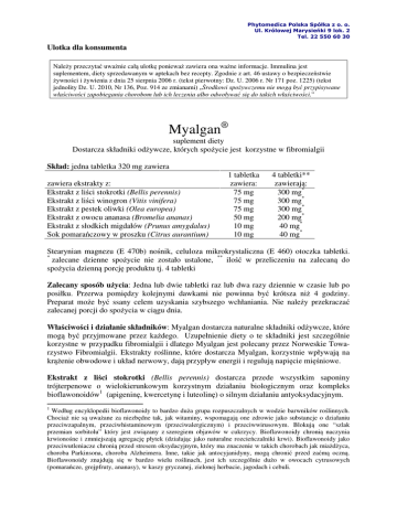 Phytomedica Polska Spółka z o. o. Ul. Królowej Marysieńki 9 lok. 2 Tel. 22 550 60 30 Ulotka dla konsumenta Należy przeczytać uważnie całą ulotkę ponieważ zawiera ona ważne informacje. Immulina jest suplementem, diety sprzedawanym w aptekach bez recepty. Zgodnie z art. 46 ustawy o bezpieczeństwie żywności i żywienia z dnia 25 sierpnia 2006 r. (tekst pierwotny: Dz. U. 2006 r. Nr 171 poz. 1225) (tekst jednolity Dz. U. 2010, Nr 136, Poz. 914 ze zmianami) „Środkowi spożywczemu nie mogą być przypisywane właściwości zapobiegania chorobom lub ich leczenia albo odwoływać się do takich właściwości.” Myalgan® suplement diety Dostarcza składniki odżywcze, których spożycie jest korzystne w fibromialgii Skład: jedna tabletka 320 mg zawiera zawiera ekstrakty z: Ekstrakt z liści stokrotki (Bellis perennis) Ekstrakt z liści winogron (Vitis vinifera) Ekstrakt z pestek oliwki (Olea europea) Ekstrakt z owocu ananasa (Bromelia ananas) Ekstrakt z słodkich migdałów (Prunus amygdalus) Sok pomarańczowy w proszku (Citrus aurantium) 1 tabletka zawiera: 75 mg 75 mg 75 mg 50 mg 10 mg 10 mg 4 tabletki** zawierają: 300 mg* 300 mg* 300 mg* 200 mg* 40 mg* 40 mg* Stearynian magnezu (E 470b) nośnik, celuloza mikrokrystaliczna (E 460) otoczka tabletki. * zalecane dzienne spożycie nie zostało ustalone, ** ilość w przeliczeniu na zalecaną do spożycia dzienną porcję produktu tj. 4 tabletki Zalecany sposób użycia: Jedna lub dwie tabletki raz lub dwa razy dziennie w czasie lub po posiłku. Przerwa pomiędzy kolejnymi dawkami nie powinna być krótsza niż 4 godziny. Preparat może być ssany celem uzyskania szybszego wchłaniania. Nie należy przekraczać zalecanej porcji do spożycia w ciągu dnia. Właściwości i działanie składników: Myalgan dostarcza naturalne składniki odżywcze, które mogą być przyjmowane przez każdego. Uzupełnienie diety o te składniki jest szczególnie korzystne w przypadku fibromialgii i dlatego Myalgan jest polecany przez Norweskie Towarzystwo Fibromialgii. Ekstrakty roślinne, które dostarcza Myalgan, korzystnie wpływają na krążenie obwodowe i układ nerwowy, dają przypływ energii i regulują napięcie mięśniowe. Ekstrakt z liści stokrotki (Bellis perennis) dostarcza przede wszystkim saponiny trójterpenowe o wielokierunkowym korzystnym działaniu biologicznym oraz kompleks bioflawonoidów1 (apigeninę, kwercetynę i luteolinę) o silnym działaniu antyoksydacyjnym. 1 Według encyklopedii bioflawonoidy to bardzo duża grupa rozpuszczalnych w wodzie barwników roślinnych. Chociaż nie są uważane za niezbędne tak, jak witaminy, wspomagają one zdrowie jako substancje o działaniu przeciwzapalnym, przeciwhistaminowym (przeciwalergicznym) i przeciwwirusowym. Blokują one “szlak przemian sorbitolu” który jest związany z szeregiem objawów w cukrzycy. Bioflawonoidy chronią naczynia krwionośne i zmniejszają agregację płytek (działając jako naturalne rozcieńczalniki krwi). Bioflawonoidy jako przeciwutleniacze chronią przed stresem oksydacyjnym, który ma znaczenie w takich chorobach jak miażdżyca, choroba Parkinsona, choroba Alzheimera. Inne, takie jak antocyjanidyny, mogą chronić przed zaćmą oczną. Bioflawonoidy znajdują się w bardzo wielu roślinach, jest ich szczególnie dużo w owocach cytrusowych (pomarańcze, grejpfruty, ananasy), w kaszy gryczanej, zielonej herbacie, jagodach i cebuli. Phytomedica Polska Spółka z o. o. Ul. Królowej Marysieńki 9 lok. 2 Tel. 22 550 60 30 Ekstrakt z liści winogron (Vitis vinifera) jest bogatym źródłem licznych polifenoli (m. in. rezweratrolu) których spożycie jest korzystne m. in. dla prawidłowego funkcjonowania układu krążenia i który poprzez stymulację sirtuin2 zwiększa odporność na stres i długość życia komórek, poza tym wykazuje silne działanie antyoksydacyjne. Ekstrakt z pestek oliwek (Olea europaea) jest bardzo bogatym źródłem m.in. polifenoli, związków o bardzo silnym działaniu przeciwutleniającym i przeciwzapalnym. Poza tym ekstrakt z pestek oliwek dostarcza kwas gamma-aminomasłowy, werbaskozydy, oleozydy, tyrozol, rutynę i luteolinę. Posiadają one szereg korzystnych właściwości, m.in. działają kardioprotekcyjnie oraz przeciwutleniająco. Mówi się o nich, że działają jako optimizery antyoksydantów, a ich wszechstronny korzystny efekt trudny jest do przecenienia. Wspomagają one przepływ krwi i funkcję narządu krążenia oraz jednocześnie zmniejszają napięcie mięśniowe. Napięte mięśnie mogą uciskać na przebiegające nerwy powodując ból, drętwienie, parastezje, jak również przenosić się na leżące w pobliżu stawy. Ekstrakt z owocu ananasa (Bromelia ananas) jest źródłem przede wszystkim enzymu proteolitycznego bromeliny, który pomaga trawić białko, może również pomagać w rozpuszczaniu skrzepów krwi, intensyfikuje działanie antybiotyków. Badania potwierdziły, że spożycie bromeliny może być korzystne w wielu sytuacjach klinicznych m. in. działa korzystnie na stawy, naczynia wieńcowe, zatoki i układ moczowy. Ekstrakt ze słodkich migdałów (Prunus amygdalus) dostarcza składniki mineralne, zwłaszcza magnez, witaminy, nienasycone kwasy tłuszczowe oraz glikozyd amigdalinę określaną czasem jako witamina B17 (laetrile). Sok pomarańczowy w proszku (Citrus aurantium) jest bogatym źródłem witamin, bioflawonoidów i składników mineralnych. Uwagi: Przechowywać w sposób niedostępny dla małych dzieci. Kobiety w ciąży i w okresie karmienia przed użyciem powinny skonsultować się z lekarzem. Nie stosować w przypadku uszkodzenia blistra z kapsułkami i po upływie daty minimalnej trwałości. Data minimalnej trwałości znajduje się na krótkim boku pudełka, obok kodu paskowego. Przechowywać w temperaturze pokojowej tj. 15 - 25 °C w zamkniętym opakowaniu, należy unikać wysokich temperatur. Suplement diety nie może być stosowany jako substytut (zamiennik) zróż