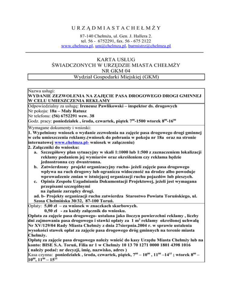 URZĄDMIASTACHEŁMŻY 87-140 Chełmża, ul. Gen. J. Hallera 2. tel. 56 - 6752291, fax. 56 - 675 2122 www.chelmza.pl, [email protected], [email protected] KARTA USŁUG ŚWIADCZONYCH W URZĘDZIE MIASTA CHEŁMŻY NR GKM 04 Wydział Gospodarki Miejskiej (GKM) Nazwa usługi: WYDANIE ZEZWOLENIA NA ZAJĘCIE PASA DROGOWEGO DROGI GMINNEJ W CELU UMIESZCZENIA REKLAMY Odpowiedzialny za usługę: Ireneusz Pawlikowski – inspektor ds. drogowych Nr pokoju: 18a – Mały Ratusz Nr telefonu: (56) 6752291 wew. 38 Godz. pracy: poniedziałek , środa, czwartek, piątek 700-1500 wtorek 800-1600 Wymagane dokumenty i wnioski: 1. Wypełniony wniosek o wydanie zezwolenia na zajęcie pasa drogowego drogi gminnej w celu umieszczenia reklamy.(wniosek do pobrania w pokoju nr 18a oraz na stronie internatowej www.chelmza.pl- wniosek w załączeniu) 2. Załączniki do wniosku: a. Szczegółowy plan sytuacyjny w skali 1:1000 lub 1:500 z zaznaczeniem lokalizacji reklamy podaniem jej wymiarów oraz określeniem czy reklama będzie jednostronna czy dwustronna. b. Zatwierdzony projekt organizacyjny ruchu- jeżeli zajęcie pasa drogowego wpływa na ruch drogowy lub ogranicza widoczność na drodze albo powoduje wprowadzenie zmian w istniejącej organizacji ruchu pojazdów lub pieszych. c. Opinia Zespołu Uzgadniania Dokumentacji Projektowej, jeżeli jest wymagana przepisami szczególnymi na żądanie zarządcy drogi. ad. b- Projekty organizacji ruchu zatwierdza Starostwo Powiatu Toruńskiego, ul. Szosa Chełmińska 30/32, 87-100 Toruń. Opłaty: 5,00 zł – za wniosek w znaczkach skarbowych. 0,50 zł - za każdy załącznik do wniosku. Opłata za zajęcie pasa drogowego- ustalana jako iloczyn powierzchni reklamy , liczby dni zajmowania pasa drogowego i stawki opłaty za 1 m2 reklamy określonej uchwałą Nr XV/129/04 Rady Miasta Chełmży z dnia 27sierpnia.2004 r. w sprawie ustalenia wysokości stawek opłat za zajęcie pasa drogowego dróg gminnych na terenie miasta Chełmży. Opłatę za zajęcie pasa drogowego należy wnieść do kasy Urzędu Miasta Chełmży lub na konto: BISE S.A. Toruń, Filia nr 1 w Chełmży 10 13 70 1271 0000 1801 4398 1016 ( należy podać: nr decyzji, imię, nazwisko, adres ) Kasa czynna: poniedziałek , środa, czwartek, piątek, 700 – 1000 , 1100 –1415 ; wtorek 800 – 1000, 1100 – 1515 Ustawowy termin odbioru dokumentów: Wydanie zezwolenia lub jego odmowa następuje w formie decyzji administracyjnej, w terminie 30 dni daty złożenia wniosku oraz wymaganych dokumentów. Tryb odwoławczy: Do Samorządowego Kolegium Odwoławczego, w terminie 14 dni od dnia doręczenia decyzji, za pośrednictwem Burmistrza Miasta Chełmży, który wydał decyzję. Odbiór dokumentów: Uwagi: 1. Wniosek o wydanie zezwolenia na zajęcie pasa drogowego drogi gminnej w celu umieszczenia reklamy należy złożyć z wyprzedzeniem umożliwiającym rozpatrzenie wniosku i wydanie zezwolenia przed terminem umieszczenia reklamy. 2. Ze względu na potrzeby związane z zarządzaniem drogami, wymogi wynikające z warunków technicznych dróg publicznych albo bezpieczeństwa ruchu drogowego, może nastąpić odmowa wydania zezwolenia. 3. Przed faktycznym umieszczeniem reklamy w pasie drogowym należy wystąpić o wydanie odrębnego zezwolenia na zajęcie pasa drogowego drogi gminnej w celu prowadzenia robót. 4. Za zajęcie pasa drogowego bez zezwolenia pobiera się opłaty karne w wysokości dziesięciokrotnej należnej opłaty. Przez zajęcie pasa drogowego bez zezwolenia rozumie się : samowolne zajęcie pasa, przekroczenie terminu zajęcia lub zajęcie większej powierzchni niż określona w zezwoleniu. Podstawa prawna: 1. Ustawa z dnia 14 czerwca 1960 r. Kodeks postępowania administracyjnego (Dz. U. z 2000 r. Nr 98, poz. 1071 z późn.zm.) 2. Ustawa z dnia 21 marca 1985 r. o drogach publicznych (Dz.U. z 2000 r. Nr 71, poz 838 z późn.zm.). 3. Ustawa z dnia 9 września 2000 r. o opłacie skarbowej (Dz.U.z 2004 r. Nr 253 poz. 2532 z późn.zm.). 4. Ustawa z dnia 27 marca 2003 r. o zagospodarowaniu przestrzennym (Dz.U. z 2003r. Nr 80, poz 717 z późn.zm.). 5. Ustawa z dnia 7 lipca 1994r. Prawo budowlane (Dz.U. z 2003 r. Nr 207, poz. 2016 z późn. zm). 6. Rozporządzenie Rady Ministrów z dnia 1 czerwca 2004 r. w sprawie określenia warunków udzielania zezwoleń na zajęcie pasa drogowego (Dz.U. Nr 140, poz 1481). 7. Rozporządzenie Ministra Transportu i Gospodarki Morskiej z dnia 2 marca 1999 r. w sprawie warunków technicznych, jakim powinny odpowiadać drogi publiczne i ich usytuowanie (Dz.U Nr 43, poz. 430). 8. Uchwała Nr XV/129/04 Rady Miasta Chełmży z dnia 27 sierpnia 2004 r. w sprawie ustalenia wysokości stawek opłat za zajęcie pasa drogowego dróg gminnych na terenie miasta Chełmży Uwaga: Aktualność kart jest sprawdzona nie rzadziej niż raz na trzy miesiące Opracował: Ireneusz Pawlikowski - inspektor data 29.07.2005r. Sprawdził: Janusz Wilczyński - naczelnik data 29.07.2005r. Zatwierdził: Marek Kuffel 29.07.2005r. - Z-ca Burmistrza data WNIOSKODAWCA: Chełmża, dnia............................... ................................................................ ................................................................ Burmistrz Miasta Chełmży ul. Gen. J. Hallera 2 ( imię i nazwisko lub nazwa firmy) ................................................................. 87-140 Chełmża ................................................................. ( adres zamieszkania/ siedziba firmy) telefon..................................................... WNIOSEK o wydanie zezwolenia na zajęcie pasa drogowego w celu umieszczenia reklamy Proszę o wydanie zezwolenia na zajęcie pasa drogowego ulicy: ........................................................................................................................................ .......... ( lokalizacja ) w celu umieszczenia reklamy.................................................................................................. ( dokładny