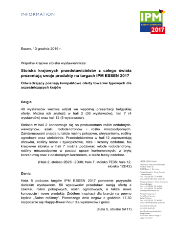 I N F O R M AT I O N Essen, 13 grudnia 2016 r. Wspólne krajowe stoiska wystawiennicze: Stoiska krajowych przedstawicielstw z całego świata prezentują swoje produkty na targach IPM ESSEN 2017 Odwiedzający poznają kompaktowe oferty towarów typowych dla uczestniczących krajów Belgia 40 wystawców weźmie udział we wspólnej prezentacji belgijskiej oferty. Można ich znaleźć w hali 2 (30 wystawców), hali 7 (4 wystawców) oraz hali 12 (6 wystawców). Stoisko w hali 2 koncentruje się na producentach roślin ozdobnych, wawrzynów, azalii, rododendronów i roślin mrozoodpornych. Zainteresowani znajdą tu także rośliny pokojowe, chryzantemy, rośliny ogrodowe oraz wieloletnie. Przedsiębiorstwa w hali 12 zaprezentują drzewka, rośliny leśne i żywopłotowe, róże i krzewy ozdobne. Na krajowym stoisku w hali 7 można podziwiać młode rododendrony, rośliny mrozoodporne w postaci upraw kontenerowych, z bryłą korzeniową oraz z odsłoniętym korzeniem, a także trawy ozdobne. (Hala 2, stoisko 2B25 i 2D30; hala 7, stoisko 7E35; hala 12, stoisko 12D42) Dania Hala 5 podczas targów IPM ESSEN 2017 ponownie przypadła duńskim wystawcom. 50 wystawców przedstawi swoją ofertę z zakresu roślin pokojowych, roślin ogrodowych, a także nowe koncepcje i nowe produkty. Źródłem inspiracji dla branży na pewno będzie „Salon roślinny”. Pierwszego dnia targów o godzinie 17.30 rozpocznie się Happy-flower-hour dla wystawców i gości. (Hala 5, stoisko 5A17) MESSE ESSEN GmbH Messehaus West Norbertstraße Postfach 10 01 65 45001 Essen I Germany Presse-Kontakt I Press Contact Luise Halfmann Fon + 49.(0)201. 72 44-898 [email protected] Presse-Assistenz I Press Assistance Claudia Brügger Fon + 49.(0)201. 72 44-244 Fax + 49.(0)201. 72 44-249 [email protected] Presse-Fotoservice I Press Photo Service Rainer Schimm Fon + 49.(0)201. 72 44-247 [email protected] www.messe-essen.de www.ipm-essen.de Veröffentlichung kostenfrei – Beleg erbeten Publication free of charge – Copy requested INFOR MAC J A Francja Francja będzie reprezentowana na dwóch krajowych stoiskach. Tematem przewodnim stoiska w galerii będą kwiaty, warzywa i systemy dla dynamicznie rosnącego rynku miejskiego: mini-papryka, ogórki i łubin, nowe niezwykle pięknie kwitnące cyklameny oraz farmy pionowe. Będzie można obejrzeć również nowe hortensje, chryzantemy, lilie oraz poznać nowe substraty. Na drugim stoisku w hali 10 Francja pokaże między innymi nowe odmiany magnolii, róże długo kwitnące i po raz pierwszy wyjątkowe gatunki morwy, orzecha włoskiego i kasztanów. (Galeria, stoisko GA 31, GA 41, GA 42, GA44; hala 10, stoisko 11B11) Wielka Brytania Krajowe stoisko Wielkiej Brytanii będzie zorganizowane przez stowarzyszenie Commercial Horticultural Association (CHA). 16 firmy uczestniczących zaprezentuje na nim szeroki asortyment nowych wariacji i innowacyjnych technologii. (Hala 3, stoisko 3B37; hala 10, stoisko 10C13 i 10C17) Indie Główną rolę na krajowym stoisku indyjskim, które współtworzy 26 firm, odgrywają produkty z włókna kokosowego. Miąższ włókna kokosowego poprawia właściwości gleby i dlatego coraz chętniej jest stosowany jako nawóz. Ma działanie wspomagające wzrost, nie zawiera gleby i jest znakomitym zamiennikiem torfu. Włókna kokosowe są dostępne w różnych formach, np. jako nawóz organiczny, kompost, brykiet lub arkusze. (Hala 3, stoisko 3A17; hala 7, stoisko 7B33) Izrael Wystawcy na izraelskim stoisku koncentrują się na uprawach biologicznych, drzewach wysokopiennych oraz łatwych w pielęgnacji i odpornych na suszę roślin. Prezentację współtworzy sześć firm. Pokażą między innymi zioła, rośliny wieloletnie, warzywa, cytrusy i INFOR MAC J A awokado w doniczkach, mirt, ozdobne rośliny drzewiaste, judaszowiec południowy, kapturnice, kwitnące rośliny liściaste oraz cebulice. (Hala 2.0, stoisko 2B15) Japonia Centralnym elementem krajowego stoiska Japonii jest zaawansowany kunszt hodowli drzewek bonsai. W targach udział wezmą cztery firmy, z czego dwie są lokalnymi grupami bonsai. Mottem prezentacji będzie „Piękno tradycji”. Aby promować sztukę bonsai także w ogrodach, oprócz klasycznych okazów będzie można obejrzeć także drzewka ogrodowe pod nazwą macro-bonsai. (Hala 10, stoisko 10A14) Włochy Po włoskich wystawcach na targach IPM ESSEN jak zwykle możemy spodziewać się atrakcyjnej tematyki śródziemnomorskiej. W tymczasowych halach 13 i 14 oraz w foyer obiektu Grugahalle zobaczymy typowy dla tego regionu asortyment szkółek leśnych oraz rośliny ozdobne do uprawy doniczkowej. Ważnym elementem stoiska będzie prezentacja sycylijska zorganizowana przez włoski Instytut Handlu Zagranicznego (ICE). 13 producentów przedstawi tutaj głównie drzewka cytrynowe i pomarańczowe. (Hale 13 i 14, foyer obiektu Grugahalle) Holandia Niemal 60 przedsiębiorstw współtworzy wspólne stoisko holenderskie w hali 12, organizowane przez BIZZ Holland. Wystawcy pochodzą między innymi z Boskoop, Opheusden, Venlo, Zundert i dalszych części Holandii. Zaprezentują najnowsze żywopłoty ozdobne, krzewy, rośliny wieloletnie, rośliny wodne oraz drzewa do obsadzeń ulicznych. Każdego dnia targów goście mogą skorzystać z możliwości oprowadzenia z przewodnikiem. Wycieczki rozpoczną się o godzinie 10 i 14 przy stoisku informacyjnym, a ich uczestnicy zapoznają się ze specjalnościami i nowymi odmianami wystawców. (Hala 12, stoisko 12A20, A21, A40, A41, A55) INFOR MAC J A Polska Jednym z głównych elementów polskich wystawców są odmiany mrozoodporne. Klimat przejściowy w Polsce zapewnia znakomite warunki dla hodowli szerokiego asortymentu tych wytrzymałych roślin. Udział w targach IPM ESSEN 2017 weźmie osiem przedsiębiorstw. Pokażą one różnorodne rośliny: drzewka, krzewy, rośliny wieloletnie, pnące oraz owocowe — zarówno jako uprawy na wolnym powietrzu, jak i uprawy kontenerowe. Odwiedzający zapoznają się z o