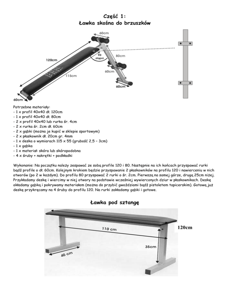 Część 1: Ławka skośna do brzuszków 60cm 90 stopni 120cm 80cm 60cm 115cm 60cm 60cm Potrzebne materiały: - 1 x profil 40x40 dł. 120cm - 1 x profil 40x40 dł. 80cm - 2 x profil 40x40 lub rurka śr. 4cm - 2 x rurka śr. 2cm dł. 60cm - 2 x gąbki (moŜna je kupić w sklepie sportowym) - 2 x płaskownik dł. 20cm gr. 4mm - 1 x deska o wymiarach 115 x 55 (grubość 2,5 – 3cm) - 1 x gąbka - 1 x materiał: skóra lub skóropodobna - 4 x śruby + nakrętki + podkładki Wykonanie: Na początku naleŜy zespawać ze sobą profile 120 i 80. Następnie na ich końcach przyspawać rurki bądź profile o dł. 60cm. Kolejnym krokiem będzie przyspawanie 2 płaskowników na profilu 120 i nawierceniu w nich otworów (po 2 w kaŜdym). Do profilu 80 przyspawać 2 rurki o śr. 2cm. Pierwszą na samej górze, drugą 25cm niŜej. Przykładamy deskę i wiercimy w niej otwory na podstawie wcześniej wywierconych dziur w płaskownikach. Deskę okładamy gąbką i pokrywamy materiałem (moŜna do przybić gwoździami bądź pistoletem tapicerskim). Gotową juŜ deskę przykręcamy na 4 śruby do profilu 120. Na rurki zakładamy gąbki i gotowe. Ławka pod sztangę 120cm 110 cm 35cm m 40 c Potrzebne materiały: - 2 x profil 40x40 dł. 40cm - 2 x profil 40x40 dł. 35cm - 1 x profil 40x40 dł. 110cm - 1 x deska o wymiarach 120 x 25 (grubość 2,5 – 3cm) - 2 x płaskownik dł. 20cm gr. 4mm - 1 x gąbka - 1 x materiał: skóra lub skóropodobna - 4 x śruby + nakrętki + podkładki Wykonanie: Do profilu 40 przyspawamy profil 35, robimy to identycznie z drugim profilem. Otrzymane literki T przyspawamy do profilu 110. Na profilu 110 przyspawać naleŜy dwa płaskowniki (nawiercamy je po 2 otwory na kaŜdy). Przykładamy deskę i wiercimy w niej otwory na podstawie wcześniej wywierconych dziur w płaskownikach. Deskę okładamy gąbką i pokrywamy materiałem (moŜna do przybić gwoździami bądź pistoletem tapicerskim). Gotową juŜ deskę przykręcamy na 4 śruby do profilu 110. Gotowe. Ławka pod sztangę ze stojakami 96cm 110cm 110cm 30cm 35cm 104cm 25cm 40cm Potrzebne materiały: - 3 x profil 40x40 dł. 110cm - 1 x profil 40x40 dł. 96cm - 1 x profil 40x40 dł. 40cm - 1 x profil 40x40 dł. 104cm - 2 x profil 40x40 dł. 25cm - 1 x profil 40x40 dł. 30cm - 2 x profil 40x40 dł. 35cm - 1 x deska o wymiarach 120 x 25 (grubość 2,5 – 3cm) - 2 x płaskownik dł. 20cm gr. 4mm - 1 x gąbka - 1 x materiał: skóra lub skóropodobna - 2 x płaskownik dł. 15cm gr. 4mm - 4 x śruby + nakrętki + podkładki 2 Wykonanie: Podobnie jak w projektach wyŜej. Dochodzi tam tutaj zrobienie literek V które będą utrzymywały naszą sztangę. Proponuje zgiąć płaskownik na 10cm i 5cm. Drugi tak samo i przyspawać do stojaków na samą górę. Profile 25cm mogą być przyspawane tworząc kąt 90 stopni z profilem 104. Gotowe. Ławka skośna w górę pod sztangę 33cm 16cm 80cm 16cm 23cm 50cm 33cm 88cm 55cm 5cm 3,5cm 4cm 50cm 10cm Potrzebne materiały: - 2 x profil 40x40 dł. 50cm - 1 x profil 40x40 dł. 55cm - 1 x profil 40x40 dł. 88cm - 2 x profil 20x20 dł. 15cm - 2 x profil 20x20 dł. 23cm - 2 x profil 20x20 dł. 33cm - 2 x profil 20x20 dł. 80cm - 1 x profil 30x20 dł. 33cm - 1 x profil 30x20 dł. 50cm - 1 x deska o wymiarach jak siedzisko + 1cm (grubość 2,5 – 3cm) - 1 x deska o wymiarach jak do leŜenia + 1cm (grubość 2,5 – 3cm) - 1 x płaskownik dł. 18cm gr. 4mm - 2 x gąbka - 2 x materiał: skóra lub skóropodobna - 4 x płaskownik dł. 13,5cm gr. 4mm - 9 x płaskownik dł. 12cm gr. 4mm - 10 x śruby + nakrętki + podkładki - 1 x gruba śruba + nakrętka + podkładki Wykonanie: Na samym początku chciałbym podkreślić, Ŝe płaskowniki mające za zadanie regulowanie poziomu (13,5cm) naleŜy przyspawać do profili (55cm i 88cm) tak aby dawały nam poziom, skos do klatki (45 stopni) i skos do barków (90 stopni). Profile 20x20 zespawać jak na foto wyŜej (plus zespawanie z gotowymi ramkami płaskowników w kształcie literki U – na profilu 23 i 23) i ponawiercać Ŝeby później moŜna było przykręcić deskę. Deski po wywierceniu otworów w profilach przykładamy i nawiercamy. Później obijamy i gotowe juŜ przykręcamy do profili. Płaskownik po środku (4 x 10 x 4) nawiercamy i przekładamy przez niego grubą śrubę, na której będą poruszać się nasze ramki. Skręcamy śrubą i sprawdzamy czy ramki płynnie chodzą. Reszta profili spawana jak na zdjęciu. 3 Ławka skośna w dół pod sztangę 20cm 125cm 30cm 30cm 30cm 9cm 112cm 36cm 50cm 14cm 126cm 20cm 10x10cm 50cm Potrzebne materiały: - 2 x profil 40x40 dł. 50cm - 1 x profil 40x40 dł. 126cm - 1 x profil 40x40 dł. 9cm - 1 x profil 40x40 dł. 112cm - 1 x profil 40x40 dł. 20cm - 2 x rurka śr. 2cm dł. 36cm - 1 x deska o wymiarach 125 x 30 (grubość 2,5 – 3cm) - 1 x deska o wymiarach 30 x 20 (grubość 2,5 – 3cm) - 4 x płaskownik dł. 20cm gr. 4mm - 2 x gąbka - 2 x materiał: skóra lub skóropodobna - 1 x blacha 10 x 10 grubość (min 5mm) - 8 x śruby + nakrętki + podkładki - 2 x gąbki (moŜna je kupić w sklepie sportowym) Wykonanie: Ławeczka bardzo prosta do wykonania a myślę bardzo potrzebna na siłowni☺ Profil 126cm nie jest konieczny, ale gdy będzie uŜywana do duŜych obciąŜeń to dla pewności przyspawać. Zamiast blachy 10x10 moŜna przyspawać profil 50cm – taki jak na równoległym końcu, ja osobiście tak to rozwiązałem. Deskę i obicie wykonujemy identycznie jak w projektach wyŜej. 4 Modlitewnik Blacha 35cm 70cm 20cm 45 stopni 30cm 32cm 65cm 40cm 35cm 35cm 75cm 80cm Potrzebne materiały: - 1 x profil 40x40 dł. 80cm - 2 x profil 40x40 dł. 35cm - 1 x profil 40x40 dł. 75cm - 1 x profil 40x40 dł. 40cm - 1 x profil 40x40 dł. 65cm - 1 x profil 40x40 dł. 32cm - 3 x profil, który wejdzie w 40x40 dł. wedle uznania - 1 x deska o wymiarach 70 x 35 (grubość 2,5 – 3cm) - 1 x deska o wymiarach 30 x 20 (grubość 2,5 – 3cm) - 2 x płaskownik dł. 20cm gr. 4mm - 2 x płaskownik dł. 15cm gr. 4mm (