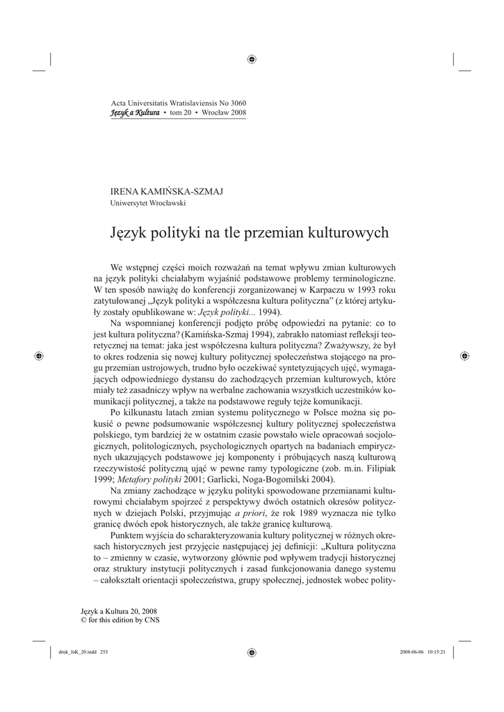 Acta Universitatis Wratislaviensis No 3060 Jêzyk a Kultura • tom 20 • Wrocław 2008 IRENA KAMIŃSKA-SZMAJ Uniwersytet Wrocławski Język polityki na tle przemian kulturowych We wstępnej części moich rozważań na temat wpływu zmian kulturowych na język polityki chciałabym wyjaśnić podstawowe problemy terminologiczne. W ten sposób nawiążę do konferencji zorganizowanej w Karpaczu w 1993 roku zatytułowanej „Język polityki a współczesna kultura polityczna” (z której artykuły zostały opublikowane w: Język polityki... 1994). Na wspomnianej konferencji podjęto próbę odpowiedzi na pytanie: co to jest kultura polityczna? (Kamińska-Szmaj 1994), zabrakło natomiast refleksji teoretycznej na temat: jaka jest współczesna kultura polityczna? Zważywszy, że był to okres rodzenia się nowej kultury politycznej społeczeństwa stojącego na progu przemian ustrojowych, trudno było oczekiwać syntetyzujących ujęć, wymagających odpowiedniego dystansu do zachodzących przemian kulturowych, które miały też zasadniczy wpływ na werbalne zachowania wszystkich uczestników komunikacji politycznej, a także na podstawowe reguły tejże komunikacji. Po kilkunastu latach zmian systemu politycznego w Polsce można się pokusić o pewne podsumowanie współczesnej kultury politycznej społeczeństwa polskiego, tym bardziej że w ostatnim czasie powstało wiele opracowań socjologicznych, politologicznych, psychologicznych opartych na badaniach empirycznych ukazujących podstawowe jej komponenty i próbujących naszą kulturową rzeczywistość polityczną ująć w pewne ramy typologiczne (zob. m.in. Filipiak 1999; Metafory polityki 2001; Garlicki, Noga-Bogomilski 2004). Na zmiany zachodzące w języku polityki spowodowane przemianami kulturowymi chciałabym spojrzeć z perspektywy dwóch ostatnich okresów politycznych w dziejach Polski, przyjmując a priori, że rok 1989 wyznacza nie tylko granicę dwóch epok historycznych, ale także granicę kulturową. Punktem wyjścia do scharakteryzowania kultury politycznej w różnych okresach historycznych jest przyjęcie następującej jej definicji: „Kultura polityczna to – zmienny w czasie, wytworzony głównie pod wpływem tradycji historycznej oraz struktury instytucji politycznych i zasad funkcjonowania danego systemu – całokształt orientacji społeczeństwa, grupy społecznej, jednostek wobec polityJęzyk a Kultura 20, 2008 © for this edition by CNS druk_JaK_20.indd 253 2008-06-06 10:15:21 254 IRENA KAMIŃSKA-SZMAJ ki. Jest to sfera subiektywna polityki (wewnętrzne przekonania) znajdująca wyraz w zachowaniach konkretnych i werbalnych” (Garlicki 1991: 26). Jan Garlicki – autor cytowanej definicji – wyróżnia cztery podstawowe komponenty kultury politycznej: poznawczy (zainteresowanie polityką, wiedza o polityce, znajomość faktów politycznych), aksjologiczny (wartości odnoszone do systemu politycznego), ocenno-afektywny (formułowanie przez grupy społeczne lub jednostki ocen wydarzeń politycznych, sądów wartościujących na temat funkcjonowania instytucji politycznych), behawioralny (uznawane wzory zachowań w sferze polityki i wypróbowane typy działań politycznych) (Garlicki 1991: 26–30; Garlicki, Noga-Bogomilski 2004: 44–49). Wszystkie wymienione elementy kultury politycznej są ściśle związane z zachowaniami werbalnymi zarówno rządzących, jak i rządzonych, czyli ich wypowiedziami na temat różnych zjawisk z życia politycznego, funkcjonowania systemu, ocenami zachowań polityków, sądami na temat prezentowanych ideologii i systemów wartości. Językowe zachowania w sferze polityki są zdeterminowane modelem komunikacji politycznej, dominującym w określonym systemie politycznym, a także uznawanymi (lub nie) przez społeczeństwo wzorami kultury, kreowanymi i upowszechnianymi przez rządzących, a w systemach pluralistycznych również przez uczestników dyskursu publicznego reprezentujących różne opcje polityczne, głoszących różne ideologie, prezentujących różne systemy wartości. To formy kultury politycznej decydują o tym, jak ludzie dążą do władzy, jak ją rozszerzają, w jaki sposób wywierają wpływ na innych ludzi. 1. Kultura polityczna i model komunikacji politycznej w PRL W opracowaniach na temat kultury politycznej przyjmuje się najczęściej koncepcję typów kultury politycznej zaproponowaną przez Gabriela A. Almonda, który wyróżnił jej trzy podstawowe rodzaje: zaściankowa (parafialna), podporządkowania (poddańcza), uczestnictwa (podaję za: Garlicki, Noga-Bogomilski 2004: 50–52). Zgodnie z tą typologią należy przyjąć, że w okresie PRL dominującym typem kultury politycznej była kultura podporządkowania z elementami kultury zaściankowej i kultury uczestnictwa – zarówno prosystemowego, jak i kontestującego – charakterystyczna dla systemów totalitarnych, rządów autorytarnych, opartych na systemie monopartyjnym, której wyznacznikami są: – umiarkowany lub niski poziom zainteresowania polityką i niewielka o niej wiedza (wynikające z ograniczonej i kontrolowanej formy aktywności politycznej obywateli, z braku dostępu do różnych źródeł informacji); Język a Kultura 20, 2008 © for this edition by CNS druk_JaK_20.indd 254 2008-06-06 10:15:21 Język polityki na tle przemian kulturowych 255 – narzucony przez władzę i zideologizowany system wartości; – w dużym stopniu ograniczona (przez cenzurę i aparat przemocy) możliwość wyrażania ocen zjawisk politycznych, krytykowania instytucji politycznych, metod sprawowania władzy; – ograniczony zakres uznawanych wzorów zachowań w sferze polityki (por. Garlicki, Noga-Bogomilski 2004: 144–145). Ten typ kultury politycznej jest ściśle związany z modelem komunikacji politycznej charakterystycznym dla okresu PRL (szerzej na temat komunikacji politycznej zob. m.in. Goban-Klas 1998; Dobek-Ostrowska 2004; Fras 2005). W czasach realnego socjalizmu była to komunika