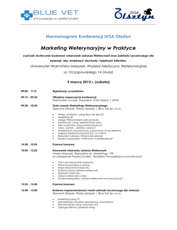 Harmonogram Konferencji IVSA Olsztyn Marketing Weterynaryjny w Praktyce czyli jak skutecznie budować wizerunek Lekarza Weterynarii oraz Zakładu Leczniczego dla zwierząt, aby zwiększyć dochody i lojalność klientów. Uniwersytet Warmińsko-Mazurski, Wydział Medycyny Weterynaryjnej ul. Oczapowskiego 14 (Aula) 9 marca 2013 r. (sobota) 09:00 - 9:15 Rejestracja uczestników 09:15 - 09:30 Oficjalne rozpoczęcie konferencji Przemysław Łuczak, Prezydent IVSA Olsztyn | UWM 09:30 - 10:30 Złote zasady Marketingu Weterynaryjnego Sławomir Dłubak, Prezes Zarządu | Blue Vet Sp. z o.o. Wstęp, produkty i usługi Blue Vet dla ZLZ Marketing 4P Usługa Weterynaryjna jako produkt, Dystrybucja usług, segmentacja rynku Pięć poziomów usług weterynaryjnych Ceny, cenniki – polityka cenowa Marketing to nie promocja, a promocja to nie reklama Legalne działania promocji ZLZ, co wolno! Ekosystem Lekarza i Właścicieli zwierząt Studium przypadku „Vethoven i e-książeczka.pl” 10:30 - 10:55 Przerwa kawowa 10:55 - 12:25 Kreowanie wizerunku Lekarza Weterynarii Marek Matysiak, Specjalista ds. Marketingu i PR (w zastępstwie Pauliny Dudek – Redaktor Prowadząca e-Lecznica.pl ) Czym jest kreowanie wizerunku, Personal branding w branży Etapy kreowania wizerunku Kryteria wyboru lekarza weterynarii Spójność wizerunku Lekarz weterynarii w Sieci Studium przypadku „Lekarz weterynarii na e-Lecznica.pl” 12:25 - 12:40 Przerwa kawowa 12:40 - 13:40 Budowa rozpoznawalności marki zakładu leczniczego dla zwierząt Sławomir Dłubak, Prezes Zarządu | Blue Vet Sp. z o.o. Marketing usług 7P Identyfikacja wizualna: zewnętrzna, wewnętrzna Standaryzacja usług i procedur ZLZ Obsługa klienta i sprzedaż usług Budowanie relacji z klientem - komunikacja Wartość ZLZ, zakup i zbycie Studium przypadku „DOGTOR” 13:40 - 14:00 Zamkniecie konferencji oraz wręczenie certyfikatów uczestnictwa. Przemysław Łuczak, Prezydent IVSA Olsztyn | UWM 15:00 - 16:30 Warsztaty z obsługi oprogramowania do zarządzania praktyką weterynaryjną Vethoven i e-ksiazeczka.pl (Sala Informatyczna)