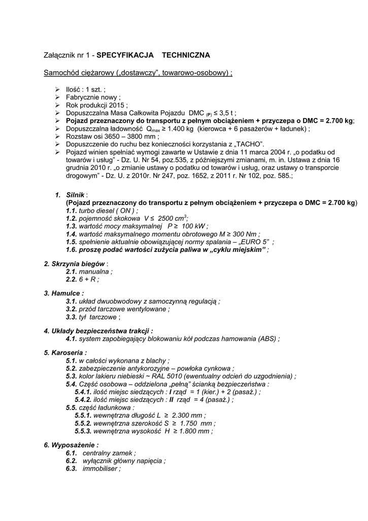 Załącznik nr 1 - SPECYFIKACJA TECHNICZNA Samochód ciężarowy („dostawczy”, towarowo-osobowy) ; Ilość : 1 szt. ; Fabrycznie nowy ; Rok produkcji 2015 ; Dopuszczalna Masa Całkowita Pojazdu DMC (P) ≤ 3,5 t ; Pojazd przeznaczony do transportu z pełnym obciążeniem + przyczepa o DMC = 2.700 kg; Dopuszczalna ładowność Qmax ≥ 1.400 kg (kierowca + 6 pasażerów + ładunek) ; Rozstaw osi 3650 – 3800 mm ; Dopuszczenie do ruchu bez konieczności korzystania z „TACHO”. Pojazd winien spełniać wymogi zawarte w Ustawie z dnia 11 marca 2004 r. „o podatku od towarów i usług” - Dz. U. Nr 54, poz.535, z późniejszymi zmianami, m. in. Ustawa z dnia 16 grudnia 2010 r. „o zmianie ustawy o podatku od towarów i usług, oraz ustawy o transporcie drogowym” - Dz. U. z 2010r. Nr 247, poz. 1652, z 2011 r. Nr 102, poz. 585.; 1. Silnik : (Pojazd przeznaczony do transportu z pełnym obciążeniem + przyczepa o DMC = 2.700 kg) 1.1. turbo diesel ( ON ) ; 1.2. pojemność skokowa V ≤ 2500 cm3; 1.3. wartość mocy maksymalnej P ≥ 100 kW ; 1.4. wartość maksymalnego momentu obrotowego M ≥ 300 Nm ; 1.5. spełnienie aktualnie obowiązującej normy spalania – „EURO 5” ; 1.6. proszę podać wartości zużycia paliwa w „cyklu miejskim” ; 2. Skrzynia biegów : 2.1. manualna ; 2.2. 6 + R ; 3. Hamulce : 3.1. układ dwuobwodowy z samoczynną regulacją ; 3.2. przód tarczowe wentylowane ; 3.3. tył tarczowe ; 4. Układy bezpieczeństwa trakcji : 4.1. system zapobiegający blokowaniu kół podczas hamowania (ABS) ; 5. Karoseria : 5.1. w całości wykonana z blachy ; 5.2. zabezpieczenie antykorozyjne – powłoka cynkowa ; 5.3. kolor lakieru niebieski ~ RAL 5010 (ewentualny odcień do uzgodnienia) ; 5.4. Część osobowa – oddzielona „pełną” ścianką bezpieczeństwa : 5.4.1. ilość miejsc siedzących : I rząd = 1 (kier.) + 2 (pasaż.) ; 5.4.2. ilość miejsc siedzących : II rząd = 4 (pasaż.) ; 5.5. część ładunkowa : 5.5.1. wewnętrzna długość L ≥ 2.300 mm ; 5.5.2. wewnętrzna szerokość S ≥ 1.750 mm ; 5.5.3. wewnętrzna wysokość H ≥ 1.800 mm ; 6. Wyposażenie : 6.1. centralny zamek ; 6.2. wyłącznik główny napięcia ; 6.3. immobiliser ; 6.4. „czujniki parkowania - tył”, wraz z zewnętrznym sygnałem dźwiękowym ; 6.5. pasy bezpieczeństwa i zagłówki dla wszystkich siedzeń ; 6.6. auto-alarm sterowany pilotem z funkcją monitorowania wnętrza, zintegrowany z centralnym zamkiem ; 6.7. światła do jazdy dziennej ; 6.8. wspomaganie układu kierowniczego ; 6.9. gazowe poduszki bezpieczeństwa, czołowe kierowcy i pasażerów przednich siedzeń; 6.10. klimatyzacja manualna ; 6.11. radio ; 6.12. szyby przednie sterowane elektrycznie ; 6.13. szyby atermiczne ; 6.14. pokrowce na wszystkich siedzeniach ; 6.15. wycieraczki gumowe na podłogę ; 6.16. osłony przeciw błotne wszystkich kół ; 6.17. felgi kół stalowe z oponami letnimi, wraz z kołpakami ; 6.18. dodatkowy komplet opon zimowych ; 6.19. pełnowymiarowe koło zapasowe ; 6.20. hak holowniczy z gniazdem elektrycznej instalacji oświetlenia przyczepy ; 6.21. przenośna nawigacja GPS, o przekątnej ekranu 4,7”, na bazie aktualnej wersji programu „Auto Mapa PL” z legalizującą licencją ; 6.22. panel ostrzegawczo informacyjny tzw. belka świetlna mocowana na dachu z przodu pojazdu : 6.22.1. na obu skrajach panelu światła LED, pulsujące, koloru pomarańczowego, P=2 x 20W ; 6.22.2. w środkowej części panelu, centralnie umieszczony na nim napis „ WODOCIĄGI”, podświetlony lampą koloru białego ; Należy zastosować prawidłowy sposób montażu „belki świetlnej” z uwzględnieniem konstrukcji dachu ( w razie potrzeb konstrukcyjnych przewidzieć wykonanie konstrukcji wzmacniającej ) ; Wszystkie elementy wyposażenia i doposażenia pojazdu winne być zgodne z wymogami producenta pojazdu ; I. Gwarancja : na silnik i podzespoły : na lakier : na perforację nadwozia : GM ≥ 2 lata GL ≥ 3 lata GB ≥ 10 lat II. Dokumenty : z ofertą : „Karta katalogowa” produktu o zawartości merytorycznej bezwzględnie obejmującej treści ustosunkowujące się do wszystkich pozycji (parametrów) zawartych w Specyfikacji Technicznej SIWZ dla uzyskania możliwości bezpośredniej oceny wymaganych w SIWZ parametrów produktu ; z towarem : Świadectwo Homologacji wydane przez Ministerstwo Transportu RP, dopuszczające przedmiotowy pojazd do ruchu po drogach publicznych Rzeczpospolitej Polskiej ; III. Termin realizacji zamówienia : - do 30 dni od daty podpisania Umowy ;