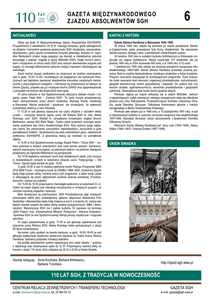 6 GAZETA MIĘDZYNARODOWEGO ZJAZDU ABSOLWENTÓW SGH AKTUALNOŚCI KARTKI Z HISTORII Zbliża się dzień XI Międzynarodowego Zjazdu Absolwentów SGH/SGPiS. Przypominamy o odwiedzeniu 24 IX br. naszego kampusu, gdzie udostępniono na oficjalne i kameralne spotkania społeczności SGH (studentów, pracowników, absolwentów i gości zjazdu) przestrzenie budynku głównego, budynku A i Ogrodów Rektorskich (chętni mogą pogrążyć się również w intelektualnej zadumie korzystając z pięknej i bogatej w zbiory Biblioteki SGH). Dzięki licznym pomysłom i inicjatywom ze strony kadry SGH oraz samych absolwentów program jest bogaty, co wymaga dokonywania wyborów między imprezami odbywającymi się równolegle. Dzień można zacząć spotkaniem ze znajomymi ze studiów (rezerwujemy sale w godz. 10.00–12.00), rocznikowym lub kolegialnym (do wybranych historycznych auli będziemy zapraszać absolwentów kierunków związanych merytorycznie z poszczególnymi kolegiami – informacje są umieszczane na bieżąco na stronie Zjazdu); pojawiła się już inicjatywa Alumni ZWIAD oraz sghprofessionals z pomysłem na konkurs dla studenckich start-upów. W samo południe w Auli Spadochronowej usłyszymy dźwięki muzyki i nagramy razem Flash Mob – „Fokstrot SGH”. To perła muzyki przedwojennej, utwór skomponowany przez dwóch studentów Wyższej Szkoły Handlowej w Warszawie. Można posłuchać i popatrzeć, ale oczekujemy, że większość uczestników zatańczy z nami fokstrota. O 12.30 w auli głównej rozpocznie się część oficjalna z udziałem władz uczelni – uroczyste otwarcie zjazdu przez JM Rektora SGH dr. hab. Marka Rockiego, prof. SGH. Wykład nt. zarządzania innowacjami wygłosi Brunon Bartkiewicz, prezes ING Bank Śląski. Trudno sobie wyobrazić znaczące wydarzenie uczelniane bez Chóru Akademickiego SGH, który wykona swoje najlepsze utwory. Na zakończenie uroczystości zaplanowaliśmy „wyrzucenie w górę pamiątkowych biretów”. Spodziewamy się wielu znamienitych gości, zasłużonych profesorów SGH/SGPiS. Z pewnością dadzą się namówić na pamiątkowe zdjęcia. O 13.45 w Auli Spadochronowej wystąpi Zespół Pieśni i Tańca SGH – wykona poloneza w strojach szlacheckich oraz suitę tańców spiskich. Zainteresowanych zapraszamy na krużganki, na pierwszym piętrze i na parterze. Następnie przejdziemy do Ogrodów Rektorskich na poczęstunek. Od 14.00 będziemy serwować lunch (bez dodatkowych opłat), przy muzyce w dixielandowych rytmach w wykonaniu Zespołu Jazzu Tradycyjnego – Old Timers. Ogrody będą otwarte do godz. 19.00. O godz.14.00 w auli III zostaną ogłoszone wyniki Ratingu Programów MBA 2016 SEM Forum – trzymajmy kciuki za CEMBA i MBA SGH. Uczestnicy Zjazdu będą mogli poznać ofertę i kryteria oceny tych programów, a także wziąć udział w odbywającej się przed ogłoszeniem wyników dyskusji panelowej „Przedsiębiorczość, szansa czy pułapka”. Od 15.00 do 18.30 proponujemy równoległe wydarzenia w budynkach G i A. Celem tej części Zjazdu jest interakcja merytoryczna w mniejszych grupach, co umożliwi wymianę poglądów i dyskusje. Bloki tematyczne są zróżnicowane. SGH Przedsiębiorcza daje możliwość promowania siebie jako przedsiębiorcy (główne aktywności Miasteczka Firm Studentów i Absolwentów będą miały miejsce w auli A w budynku A); można tam będzie również znaleźć dla siebie ofertę studiów podyplomowych, MBA i doktoranckich. Merytoryczna SGH (na I piętrze budynku G) zaprasza na rozmowy „SGH Polsce” oraz „Konwersatoria Młodych Profesorów”. Aktywna Kulturalno-Sportowa SGH (w Auli Spadochronowej) oferuje pokazy artystyczne i rozgrywki sportowe. W części popołudniowej (o godz. 17.00 w auli głównej) zaplanowane jest wręczenie przez Rektora SGH, Marka Rockiego listów gratulacyjnych z okazji 50–lecia immatrykulacji. Na koniec cyklu spotkań na terenie kampusu, w godz. 18.00–18.45 (w auli głównej) społeczność studencka serdecznie zaprasza do Teatru Scena Główna Handlowa, będziemy podziwiać miniatury teatralne. Na prośbę absolwentów system rejestracyjny jest nadal otwarty – prosimy o rejestrację oraz dokonywanie wpłat do 12 IX. Proponujemy również bilety na koncert z okazji 110–lecia, który odbędzie się 24 IX o 20.00 w Klubie Stodoła. Szkoła Główna Handlowa w Warszawie 1945–1949 28 marca 1945 roku odbyło się pierwsze po wojnie posiedzenie Senatu w Częstochowie, gdzie prowadzone były Kursy Akademickie. Na stanowisko rektora wybrano Jerzego Lotha, a prorektorem został Edward Lipiński. 24 kwietnia 1945 roku w ocalałym budynku bibliotecznym w Warszawie rozpoczęły się zajęcia dydaktyczne. Naukę rozpoczęło 317 studentów, ale już jesienią 1945 roku w SGH studiowało 685 osób, a w 1949 roku 2112 osób. 1 października 1945 roku odbyła się pierwsza powojenna inauguracja roku akademickiego 1945/1946. Szkoła Główna Handlowa pozostała uczelnią prywatną. Była to uczelnia bezwydziałowa, kształcąca studentów w trybie trzyletnim. Program nauczania nawiązywał do przedwojennych programów. Duże znaczenie miało nauczanie teorii ekonomii, organizacji przedsiębiorstw, rachunkowości, geografii ekonomicznej, historii gospodarczej i statystyki. Do wyboru były trzy kierunki studiów: ogólnoekonomiczny, ekonomiki przedsiębiorstw i gospodarki publicznej. Obowiązkowa była nauka dwóch języków obcych. Pierwsze zajęcia po wojnie odbywały się w salach Biblioteki. Jednym z najważniejszych zadań pierwszych miesięcy powojennych stała się odbudowa gmachu przy ulicy Rakowieckiej. Przewodniczącym Komitetu Odbudowy Gmachu został Stanisław Skrzywan. Odbudowę finansowano głównie z kredytu zaciągniętego w Banku Gospodarstwa Krajowego. Pierwsze sale oddano już w 1946 roku, a 15 października 1947 roku, w auli w odbudowanym budynku A, podczas uroczystej inauguracji roku akademickiego 1947/1948, Stanisław Skrzywan złożył sprawozda