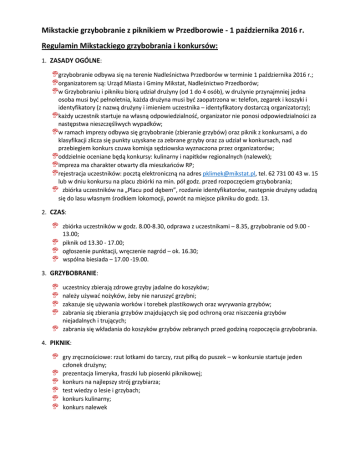 Mikstackie grzybobranie z piknikiem w Przedborowie - 1 października 2016 r. Regulamin Mikstackiego grzybobrania i konkursów: 1. ZASADY OGÓLNE: grzybobranie odbywa się na terenie Nadleśnictwa Przedborów w terminie 1 października 2016 r.; organizatorem są: Urząd Miasta i Gminy Mikstat, Nadleśnictwo Przedborów; w Grzybobraniu i pikniku biorą udział drużyny (od 1 do 4 osób), w drużynie przynajmniej jedna osoba musi być pełnoletnia, każda drużyna musi być zaopatrzona w: telefon, zegarek i koszyki i identyfikatory (z nazwą drużyny i imieniem uczestnika – identyfikatory dostarczą organizatorzy); każdy uczestnik startuje na własną odpowiedzialność, organizator nie ponosi odpowiedzialności za następstwa nieszczęśliwych wypadków; w ramach imprezy odbywa się grzybobranie (zbieranie grzybów) oraz piknik z konkursami, a do klasyfikacji zlicza się punkty uzyskane za zebrane grzyby oraz za udział w konkursach, nad przebiegiem konkurs czuwa komisja sędziowska wyznaczona przez organizatorów; oddzielnie oceniane będą konkursy: kulinarny i napitków regionalnych (nalewek); impreza ma charakter otwarty dla mieszkańców RP; rejestracja uczestników: pocztą elektroniczną na adres [email protected], tel. 62 731 00 43 w. 15 lub w dniu konkursu na placu zbiórki na min. pół godz. przed rozpoczęciem grzybobrania; zbiórka uczestników na „Placu pod dębem”, rozdanie identyfikatorów, następnie drużyny udadzą się do lasu własnym środkiem lokomocji, powrót na miejsce pikniku do godz. 13. 2. CZAS: zbiórka uczestników w godz. 8.00-8.30, odprawa z uczestnikami – 8.35, grzybobranie od 9.00 13.00; piknik od 13.30 - 17.00; ogłoszenie punktacji, wręczenie nagród – ok. 16.30; wspólna biesiada – 17.00 -19.00. 3. GRZYBOBRANIE: uczestnicy zbierają zdrowe grzyby jadalne do koszyków; należy używać nożyków, żeby nie naruszyć grzybni; zakazuje się używania worków i torebek plastikowych oraz wyrywania grzybów; zabrania się zbierania grzybów znajdujących się pod ochroną oraz niszczenia grzybów niejadalnych i trujących; zabrania się wkładania do koszyków grzybów zebranych przed godziną rozpoczęcia grzybobrania. 4. PIKNIK: gry zręcznościowe: rzut lotkami do tarczy, rzut piłką do puszek – w konkursie startuje jeden członek drużyny; prezentacja limeryka, fraszki lub piosenki piknikowej; konkurs na najlepszy strój grzybiarza; test wiedzy o lesie i grzybach; konkurs kulinarny; konkurs nalewek 5. PUNKTACJA: klasyfikację drużyn ustala się na podstawie liczby zdobytych punktów. za każde 10 dkg zdrowych jadalnych grzybów – 1 pkt.; za każdy punkt zdobyty w grach zręcznościowych – 1 pkt.; za udział w prezentacji fraszki lub piosenki – 1-2 pkt.; za strój grzybiarza (drużyna) – 1-3 pkt.; test wiedzy (quizy tematyczne o grzybach i lesie) – za każdą prawidłowa odpowiedź 1 pkt.; za złamanie regulaminu drużyna zostanie wykluczona z konkursu. 6. KONKURS KULINARNY uczestnicy w domu przygotowują potrawę z wykorzystaniem grzybów, która podczas pikniku będzie oceniana przez jury ze względu na walory smakowe, zapachowe i estetykę prezentacji. 7. KONKURS NAPITKÓW REGIONALNYCH (NALEWEK) uczestnikami Konkursu mogą być osoby pełnoletnie osoby fizyczne, osoby prawne lub jednostki organizacyjne nieposiadające osobowości prawnej (w szczególności mogą to być osoby indywidualne, rolnicy, gastronomicy, koła gospodyń wiejskich, stowarzyszenia, fundacje, rady sołeckie); uczestnicy Konkursu zgłaszając swój udział w Konkursie akceptują jego regulamin oraz zobowiązują się uszanować wszelkie postanowienia Komisji konkursowej; do Konkursu można zgłaszać nalewki, tylko te które zostały wyprodukowane własnoręcznie przez uczestników. Nalewki zakupione nie będą oceniane przez Komisję; uczestnicy Konkursu zobowiązani są przygotować i dostarczyć: nalewkę należy dostarczyć do oznaczonego stanowiska na „Placu pod dębem” najpóźniej do godziny 14.00 w dniu 01-10-2016 r. podczas „II Mikstaciego grzybobrania w Przedborowie”; bezzwrotną próbkę nalewki o objętości nie mniejszej niż 250 ml; informację dotyczącą przygotowanej nalewki tj.: nazwa, główny składnik; imię i nazwisko oraz numer telefonu osoby wykonującej trunek. ZASADY OCENIANIA Ocenie w Konkursie podlegają: kolor i klarowność nalewki; bukiet - aromat nalewki; harmonia -równowaga elementów: smaku, aromatu, cukru, kwasowości. 8. NAGRODY: miejsce - wizyta w Brukseli na zaproszenie europosła Andrzeja Grzyba; miejsce - upominek, atlas grzybów; miejsce - upominek, atlas grzybów; nagroda specjalna - upominek, dla osoby która znajdzie największego grzyba; wszyscy uczestnicy otrzymują dyplomy uczestnictwa. 9. JURY 3-osobową komisję sędziowską wyznaczą organizatorzy. Komisja będzie oceniać potrawy w konkursie kulinarnym i nalewki oraz zliczy punkty uzyskane przez poszczególne drużyny w grzybobraniu oraz za gry i quizy; drużyna, która uzyska najwięcej punktów za zbiórkę grzybów oraz za udział w konkursach w ramach pikniku zdobędzie tytuł „Grzybowego króla”. 10. ORGANIZATORZY zastrzegają sobie możliwość zmian w harmonogramie imprezy i regulaminie konkursu, o których poinformują uczestników przed rozpoczęciem grzybobrania.