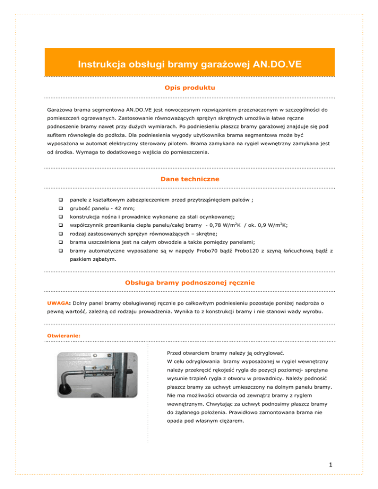Instrukcja obsługi bramy garażowej AN.DO.VE Opis produktu Garażowa brama segmentowa AN.DO.VE jest nowoczesnym rozwiązaniem przeznaczonym w szczególności do pomieszczeń ogrzewanych. Zastosowanie równoważących sprężyn skrętnych umożliwia łatwe ręczne podnoszenie bramy nawet przy dużych wymiarach. Po podniesieniu płaszcz bramy garażowej znajduje się pod sufitem równolegle do podłoża. Dla podniesienia wygody użytkownika brama segmentowa może być wyposażona w automat elektryczny sterowany pilotem. Brama zamykana na rygiel wewnętrzny zamykana jest od środka. Wymaga to dodatkowego wejścia do pomieszczenia. Dane techniczne panele z kształtowym zabezpieczeniem przed przytrząśnięciem palców ; grubość panelu - 42 mm; konstrukcja nośna i prowadnice wykonane za stali ocynkowanej; współczynnik przenikania ciepła panelu/całej bramy - 0,78 W/m2K / ok. 0,9 W/m2K; rodzaj zastosowanych sprężyn równoważących – skrętne; brama uszczelniona jest na całym obwodzie a także pomiędzy panelami; bramy automatyczne wyposażane są w napędy Probo70 bądź Probo120 z szyną łańcuchową bądź z paskiem zębatym. Obsługa bramy podnoszonej ręcznie UWAGA: Dolny panel bramy obsługiwanej ręcznie po całkowitym podniesieniu pozostaje poniżej nadproża o pewną wartość, zależną od rodzaju prowadzenia. Wynika to z konstrukcji bramy i nie stanowi wady wyrobu. Otwieranie: Przed otwarciem bramy należy ją odryglować. W celu odryglowania bramy wyposażonej w rygiel wewnętrzny należy przekręcić rękojeść rygla do pozycji poziomej- sprężyna wysunie trzpień rygla z otworu w prowadnicy. Należy podnosić płaszcz bramy za uchwyt umieszczony na dolnym panelu bramy. Nie ma możliwości otwarcia od zewnątrz bramy z ryglem wewnętrznym. Chwytając za uchwyt podnosimy płaszcz bramy do żądanego położenia. Prawidłowo zamontowana brama nie opada pod własnym ciężarem. 1 Brama zamykana na zamek z wkładką może być zamykana zarówno od środka, jak i od zewnątrz. Odryglowanie bramy następuje przez przekręcenie kluczyka we wkładce i przekręcenie klamki zamka w prawo, stojąc na zewnątrz pomieszczenia bądź w lewo stojąc wewnątrz. Należy podnosić bramę za uchwyt nie za klamkę. Zamek posiada blokadę, która uniemożliwia przekręcenie kluczyka. Odblokowanie możliwe jest tylko od wewnątrz pomieszczenia. Zamykanie: Przed zamknięciem bramy należy upewnić się, że nie ma pod nią żadnych przeszkód np. samochodu, ludzi itp. Bramy garażowe wyposażone są w linkę nylonową służącą do ściągnięcia płaszcza. Chwytając za linkę a następnie za uchwyt należy doprowadzić do opuszczenia płaszcza bramy do podłoża. Po zamknięciu bramy należy ją zaryglować. Bramę z ryglem wewnętrznym należy zamykać po lekkim dociśnięciu do podłoża przez przesunięcie rygla na zewnątrz tak, aby trzpień rygla wszedł w otwór w prowadnicy. Następnie należy obrócić rygiel o 900 w dolne położenie. Brama wyposażona w zamek z wkładką może być ryglowana od środka bądź od zewnątrz. W celu zamknięcia docisnąć płaszcz bramy lekko do podłoża i przekręcając klamkę w prawo, stojąc wewnątrz pomieszczenia bądź w lewo stojąc na zewnątrz doprowadzić do wsunięcia trzpienia rygla w otwór prowadnicy. Aby zablokować możliwość otwarcia bramy przez osoby trzecie należy przekręcić kluczyk we wkładce zamka. Zamek wyposażony jest w możliwość zablokowania otwierania zamka kluczykiem. Aby to uczynić należy przesunąć trzpień blokujący w kierunku prowadnicy. OBSŁUGA BRAMY PODNOSZONEJ AUTOMATYCZNIE UWAGA: Bramy AN.DO.VE wyposażane są w napędy typu Probo 70 bądź 120 firmy Life home integration. Przed przystąpieniem do użytkowania bramy należy dokładnie zapoznać się z instrukcją obsługi napędu. W zależności od przyjętego rozwiązania istnieje możliwość otwierania bramy automatycznej z nadajnika, przełącznika kluczykowego bądź przycisku dzwonkowego. Napęd Probo wyposażany jest w nadajniki z dwoma lub czterema przyciskami. Napęd ten posiada funkcje częściowego otwarcia, tzw. furtkę dla pieszych. O ile funkcja ta jest aktywna przypisany jest do niej jeden z 2 przycisków nadajnika. Kolejny przycisk służy do całkowitego podniesienia bramy. O ile funkcja ta jest nieaktywna, wolny przycisk może służyć do obsługi innego urządzenia, np. automatu bramy wjazdowej. Automat garażowy Probo może funkcjonować w jednym z następujących trybów pracy: praca ręczna –brama porusza się wyłącznie wtedy, kiedy wciśnięty jest przycisk nadajnika aż do zakończenia żądanego ruchu praca krok po kroku – polecenia wydawane są w sposób impulsowy, pojedyncze naciśnięcie przycisku nadajnika powoduje otwarcie lub zamknięcie bramy. Nie jest aktywne automatyczne zamykanie. Naciśnięcie przycisku w czasie otwierania powoduje zatrzymanie bramy i oczekiwanie na następne polecenie praca automatyczna 2-krokowa - polecenia wydawane są w sposób impulsowy, brama zamknie się automatycznie po ustalonym czasie przerwy praca automatyczna 4-krokowa - polecenia wydawane są w sposób impulsowy, brama zamknie się automatycznie po ustalonym czasie przerwy. Naciśnięcie przycisku nadajnika np. w trakcie otwierania powoduje zatrzymanie bramy i oczekiwanie na następne polecenie praca w trybie wspólnoty mieszkaniowej- polecenia wydawane są w sposób impulsowy. Zamknięcie bramy możliwe jest tylko przy bramie całkowicie otwartej. Otwarta brama zamknie się automatycznie po ustalonym czasie przerwy. UWAGA: Tryb pracy automatu ustawiany jest przez instalatora napędu. Zmianę trybu pracy może wykonać tylko uprawniony instalator. Napęd Probo wyposażony jest w funkcję wykrywania przeszkód. Brama odwraca swój ruch kiedy natrafia na przeszkodę. Czułość, z jaką napęd wykrywa przeszkodę ustawiana jest przez instalatora napędu. Przed uruchomieniem napędu należy upewnić się, że osoby znajdują s