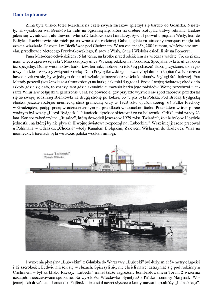 Dom kapitanów Zima była blisko, toteż Marchlik na czele swych flisaków spieszył się bardzo do Gdańska. Niestety, na wysokości wsi Bieńkówka trafił na ogromną krę, która na drobne rozłupała tratwy retmana. Ludzie jakoś się wyratowali, ale drewno, własność krakowskich handlarzy, żywioł porwał z prądem Wisły, hen do Bałtyku. Rozbitkowie nie mieli po co wracać do rodzimej Galicji, gdzie za utracony transport mogło ich czekać więzienie. Pozostali w Bieńkówce pod Chełmnem. W ten oto sposób, 200 lat temu, właściwie ze strachu, przodkowie Metodego Przybytkowskiego, flisacy z Wisły, Sanu i Wisłoka osiedlili się na Pomorzu. Pana Metodego odwiedziłem 15 lat temu, na krótko przed odejściem na wieczną wachtę. To, co piszę, mam więc z „pierwszej ręki”. Mieszkał przy ulicy Wyszogrodzkiej na Fordonku. Specjalna była to ulica i dom też specjalny. Domy wodniaków, barki, tzw. berlinki, holowniki (dziś są pchacze) śluza, przystanie, tor regatowy i ludzie – wszyscy związani z rzeką. Dom Przybytkowskiego nazwany był domem kapitanów. Nie często bowiem zdarza się, by w jednym domu mieszkało jednocześnie sześciu kapitanów żeglugi śródlądowej. Pan Metody poszedł (właściwie został zaniesiony) na barkę, jak miał 5 tygodni. Przed I wojną światową chodził do szkoły gdzie się dało, to znaczy, tam gdzie aktualnie cumowała barka jego rodziców. Wojnę przesłużył u cesarza Wilusia w belgijskim garnizonie Gent. Po powrocie, gdy przyszło wyzwolenie spod zaborów, przedostał się ze swojej rodzinnej Bieńkówki na drugą stronę po lodzie, bo tu już była Polska. Pod Brzozą Bydgoską chodził jeszcze rozbijać niemiecką straż graniczną. Gdy w 1923 roku opuścił szeregi 64 Pułku Piechoty w Grudziądzu, podjął pracę w odziedziczonym po przodkach wodniackim fachu. Potentatem w transporcie wodnym był wtedy „Lloyd Bydgoski”. Niemiecki dyrektor skierował go na holownik „Orlik”, miał wtedy 23 lata. Karierę zakończył na „Rusałce”, którą dowodził jeszcze w 1979 roku. Twierdził, że nie było w Lloydzie jednostki, na której by nie pływał. II wojnę światową rozpoczął na „Lubeckim”. Wcześniej jeszcze pracował u Pohlmana w Gdańsku. „Chodził” wtedy Kanałem Elbląskim, Zalewem Wiślanym do Królewca. Wizą na niemieckich terenach była wówczas polska wódka i minogi. 1 września płynął na „Lubeckim” z Gdańska do Warszawy. „Lubecki” był duży, miał 54 metry długości i 12 szerokości. Ledwie mieścił się w śluzach. Spieszyli się, nie chcieli nawet zatrzymać się pod rodzinnym Chełmnem – był za blisko Rzeszy. „Lubecki” minął także zagrożony bombardowaniem Toruń. 2 września nastąpiło nieoczekiwane spotkanie. Na wysokości Włocławka płynęły aż z Pińska monitory Marynarki Wojennej. Ich dowódca – komandor Fajferski nie chciał nawet słyszeć o kontynuowaniu podróży „Lubeckiego”. Potrzebował przewodnika na Wisłę. W ten sposób kapitan Przybytkowski, martwiąc się o ładunek wieziony do Warszawy, chciał nie chciał, musiał wstąpić w szeregi Marwoju. Nie wiedział nawet, że dnia poprzedniego w Nieszawie gdzie zostawił rodzinę, urodził mu się syn. 11 września monitory trafiły na bardzo niebezpieczne zanurzenie – 55 cm. Zanosiło się na kilkudniowe pokonywanie krótkiego odcinka. Na brzegu widać było niemieckie patrole, które po kilku godzinach zamieniły się w baterie dział. Flotylla była jeszcze na tyle daleko, że ludzie mogli przedostać się na polski brzeg, ale monitory wpadłyby w ręce wroga. W tej sytuacji kmdr Fajferski wydał najboleśniejszy z rozkazów wodniaka – zatopić! W ten oto sposób kpt. Przybytkowski i marynarz Stanisław Suwała, przy pomocy żerdzi musieli przerwać żywot także „Lubeckiego”. Pozostało przedostać się do swoich, omijając po drodze Niemców, którzy właśnie zajmowali Włocławek. Po drodze pan Metody został pochwycony przez Polaków jako niemiecki szpieg i postawiony pod ścianą przed plutonem egzekucyjnym. Gdyby nie krajan z Chełmna, który go przeegzaminował ze znajomości ludzi i ulic, to pewnie zakończyłby wojnę. Niedługo potem „Lubeckiego” wyłowiono i pan kapitan pływał na nim, tyle, że pod niemiecką banderą. Za to robotę robił polską – przewiózł około 1800 „leśnych” pod Tarnobrzegiem, a oni dali mu zaświadczenie za stracony czas i ropę. Potem w zbiornikach na paliwo ukrywał skazanych na śmierć więźniów z płockiego więzienia i transportował ich do Warszawy. Wojna minęła mu na pływaniu. Nie był pomnikowym bohaterem, ot zwykła marynarska proza. Niestety, dla Przybytkowskiego czas pokoju rozpoczął się tragedią. Na polecenie bydgoskich zwierzchników, miał przeprowadzić unieruchomioną w gdańskim porcie „Warszawę”. Nie było załogi. Znalazł 5 przypadkowych ludzi, brakowało jeszcze jednego. Zabrał swego siedemnastoletniego syna. Gdy przy Rybim Porcie odbijała „Warszawa”, Rosjanie ostrzegali, że kanał nie jest do końca rozminowany – kilka dni temu zginęło sześciu żołnierzy radzieckich. Przedstawiciel firmy nalegał, pan Metody postanowił zaryzykować. 24 czerwca barka „Zofia” zaczęła pchanie uszkodzonej „Warszawy”, na której byli marynarz Blachowski i syn Przybytkowskiego. Pod miejscowością Górki Zachodnie, na śluzie, młody Henryk Przybytkowski zszedł do kajuty przygotować śniadanie. W tym momencie załoga „Zofii” usłyszała detonację. Kapitan zobaczył przez przechylający się na burtę statek, tonącego, uwieszonego na balu drzewa, poparzonego palacza. Ten przeżył. Nieprzytomny mechanik z rozciętą głową leżał na wodzie, po chwili zniknął w otmętach Wisły. Henryk w kajucie nie miał szans na przeżycie. Henrykowi Bryndzie i swojemu synowi kapitan już pomóc nie mógł. O ile Metody Przybytkowski był czynnym kapitanem, o tyle jego sąsiad z domu kapitanów, Sta