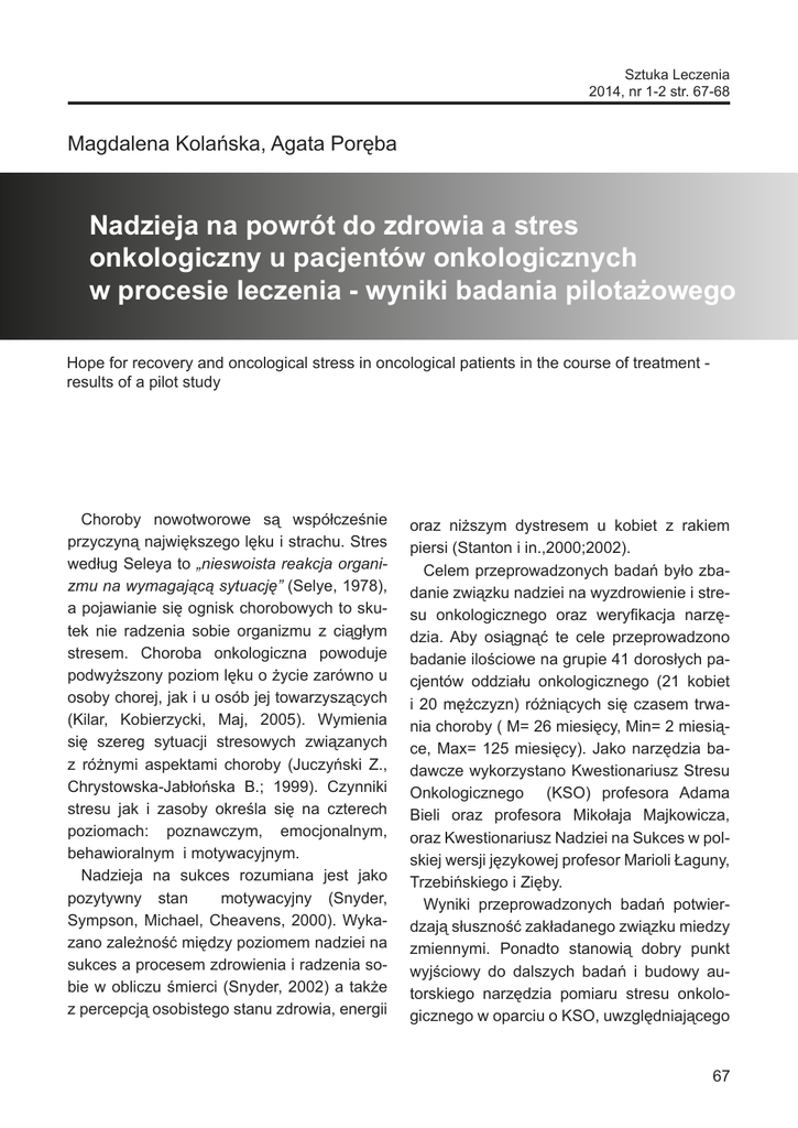 Sztuka Leczenia 2014, nr 1-2 str. 67-68 Magdalena Kolańska, Agata Poręba Nadzieja na powrót do zdrowia a stres onkologiczny u pacjentów onkologicznych w procesie leczenia - wyniki badania pilotażowego Hope for recovery and oncological stress in oncological patients in the course of treatment results of a pilot study Choroby nowotworowe są współcześnie przyczyną największego lęku i strachu. Stres według Seleya to „nieswoista reakcja organizmu na wymagającą sytuację” (Selye, 1978), a pojawianie się ognisk chorobowych to skutek nie radzenia sobie organizmu z ciągłym stresem. Choroba onkologiczna powoduje podwyższony poziom lęku o życie zarówno u osoby chorej, jak i u osób jej towarzyszących (Kilar, Kobierzycki, Maj, 2005). Wymienia się szereg sytuacji stresowych związanych z różnymi aspektami choroby (Juczyński Z., Chrystowska-Jabłońska B.; 1999). Czynniki stresu jak i zasoby określa się na czterech poziomach: poznawczym, emocjonalnym, behawioralnym i motywacyjnym. Nadzieja na sukces rozumiana jest jako pozytywny stan motywacyjny (Snyder, Sympson, Michael, Cheavens, 2000). Wykazano zależność między poziomem nadziei na sukces a procesem zdrowienia i radzenia sobie w obliczu śmierci (Snyder, 2002) a także z percepcją osobistego stanu zdrowia, energii oraz niższym dystresem u kobiet z rakiem piersi (Stanton i in.,2000;2002). Celem przeprowadzonych badań było zbadanie związku nadziei na wyzdrowienie i stresu onkologicznego oraz weryfikacja narzędzia. Aby osiągnąć te cele przeprowadzono badanie ilościowe na grupie 41 dorosłych pacjentów oddziału onkologicznego (21 kobiet i 20 mężczyzn) różniących się czasem trwania choroby ( M= 26 miesięcy, Min= 2 miesiące, Max= 125 miesięcy). Jako narzędzia badawcze wykorzystano Kwestionariusz Stresu Onkologicznego (KSO) profesora Adama Bieli oraz profesora Mikołaja Majkowicza, oraz Kwestionariusz Nadziei na Sukces w polskiej wersji językowej profesor Marioli Łaguny, Trzebińskiego i Zięby. Wyniki przeprowadzonych badań potwierdzają słuszność zakładanego związku miedzy zmiennymi. Ponadto stanowią dobry punkt wyjściowy do dalszych badań i budowy autorskiego narzędzia pomiaru stresu onkologicznego w oparciu o KSO, uwzględniającego 67 Nadzieja na powrót do zdrowia a stres onkologiczny u pacjentów onkologicznych w procesie leczenia- wyniki badania pilotażowego dotychczasowe założenia teoretyczne. [email protected] 68