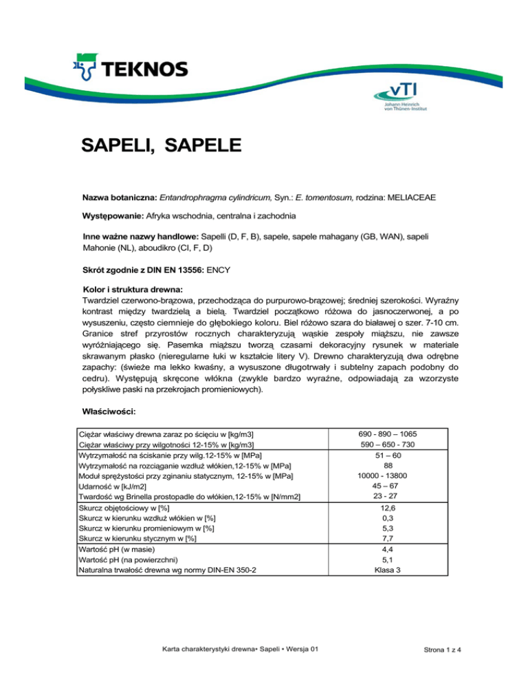 SAPELI, SAPELE Nazwa botaniczna: Entandrophragma cylindricum, Syn.: E. tomentosum, rodzina: MELIACEAE Występowanie: Afryka wschodnia, centralna i zachodnia Inne ważne nazwy handlowe: Sapelli (D, F, B), sapele, sapele mahagany (GB, WAN), sapeli Mahonie (NL), aboudikro (CI, F, D) Skrót zgodnie z DIN EN 13556: ENCY Kolor i struktura drewna: Twardziel czerwono-brązowa, przechodząca do purpurowo-brązowej; średniej szerokości. Wyraźny kontrast między twardzielą a bielą. Twardziel początkowo różowa do jasnoczerwonej, a po wysuszeniu, często ciemnieje do głębokiego koloru. Biel różowo szara do białawej o szer. 7-10 cm. Granice stref przyrostów rocznych charakteryzują wąskie zespoły miąższu, nie zawsze wyróżniającego się. Pasemka miąższu tworzą czasami dekoracyjny rysunek w materiale skrawanym płasko (nieregularne łuki w kształcie litery V). Drewno charakteryzują dwa odrębne zapachy: (świeże ma lekko kwaśny, a wysuszone długotrwały i subtelny zapach podobny do cedru). Występują skręcone włókna (zwykle bardzo wyraźne, odpowiadają za wzorzyste połyskliwe paski na przekrojach promieniowych). Właściwości: Ciężar właściwy drewna zaraz po ścięciu w [kg/m3] Ciężar właściwy przy wilgotności 12-15% w [kg/m3] Wytrzymałość na ściskanie przy wilg.12-15% w [MPa] Wytrzymałość na rozciąganie wzdłuż włókien,12-15% w [MPa] Moduł sprężystości przy zginaniu statycznym, 12-15% w [MPa] Udarność w [kJ/m2] Twardość wg Brinella prostopadle do włókien,12-15% w [N/mm2] Skurcz objętościowy w [%] Skurcz w kierunku wzdłuż włókien w [%] Skurcz w kierunku promieniowym w [%] Skurcz w kierunku stycznym w [%] Wartość pH (w masie) Wartość pH (na powierzchni) Naturalna trwałość drewna wg normy DIN-EN 350-2 Karta charakterystyki drewna• Sapeli • Wersja 01 690 - 890 – 1065 590 – 650 - 730 51 – 60 88 10000 - 13800 45 – 67 23 - 27 12,6 0,3 5,3 7,7 4,4 5,1 Klasa 3 Strona 1 z 4 Obróbka: Sapeli jest łatwe w obróbce z wykorzystaniem wszelkich narzędzi. Powierzchnie promieniowe są podatne na strzępienie tylko przy wyraźnie skręconych włóknach. Sapeli jest łatwe w obróbce skrawaniem i cięciem, efekt stępienia narzędzi w niewielkim stopniu. Gwoździe i śruby utrzymają się w nim dobrze, zaleca się wcześniejsze nawiercenie. Klejenie dobre. Suszenie: Drewno schnie stosunkowo szybko, suszenie powinno być dokładnie kontrolowane, ponieważ drewno ma tendencję do niewielkiego paczenia. Zastosowanie: Na zewnątrz lub wewnątrz pomieszczeń. Szczególnie nadaje się do: konstrukcji zewnętrznych bez kontaktu z ziemią, pozyskiwania forniru skrawanego obwodowo (sklejki), konstrukcji szkieletowych (okien, drzwi domów, ogrodów zimowych), pokryć ścian i sufitów (wewnętrznych), wysokiej jakości mebli, budowy i wykonywania łódek Makroskopowy przekrój poprzeczny drewna Sapeli (10 x powiększenie) Karta charakterystyki drewna• Sapeli • Wersja 01 Powierzchnia drewna Sapeli (przekrój promieniowy) Strona 2 z 4 Konserwacja: Drewno Sapeli nie stwarza większych problemów podczas wykańczania powierzchni materiałami syntetycznymi lub wodnymi, w przypadku wykończeń na biało lub w kolorach pastelowych możliwość wystąpienia przebarwień. Podatność twardzieli na impregnację słaba (bielu - średnia; EN 350-2, 1994). W kontakcie z jonami żelaza możliwe występowanie brunatnych przebarwień (reakcja żelazo/taniny). Systemy powłok: Przedstawione poniżej systemy powłok lakierowych, zapewniają najwyższą jakość i długotrwałą ochronę. Alternatywne powłoki systemowe do zastosowania, po uprzedniej konsultować z Teknos. Szczegóły dotyczące nanoszenia poszczególnych warstw znajdują się w kartach technicznych każdego z produktów. SYSTEM KRYJĄCY SYSTEM TRANSPARENTNY Okna, drzwi, ogrody zimowe i składane okiennice: Warstwy składowe TEKNOS GORI Industry Impregnat TEKNOL AQUA 1410-01 GORI 356 Podkład AQUA PRIMER 2900-02 GORI 615 Międzywarstwa AQUA FILLER 5200-00 GORI 643 Clear Lakier nawierzchniowy AQUATOP 2600 GORI 660 Warstwy składowe TEKNOS GORI Industry Impregnat TEKNOL AQUA 1410-01 GORI 356 Podkład Międzywarstwa Lakier nawierzchniowy Dalsze informacje: ANTISTAIN AQUA 2901-52 ANTISTAIN AQUA 2901-00 AQUATOP 2600 GORI 642 White GORI 643 White GORI 660 Teknos Sp. z o.o. ul. Księcia Ziemowita 59 03-885 Warszawa Tel. +48 22 678 70 04 E-mail: [email protected] Teknos nie gwarantuje, że informacje zawarte w niniejszej karcie technicznej są poprawne i kompletne. Teknos nie gwarantuje również niezawodności zaleceń, szacunków, instrukcji oraz innych informacji zawartych w niniejszej karcie charakterystyki. Teknos ma prawo dokonać dowolnych zmian w dowolnym czasie w informacjach dostępnych w tej karcie, jak również w produktach tutaj opisanych, za co Teknos nie ponosi żadnej odpowiedzialności. Karta charakterystyki drewna• Sapeli, • Wersja 01 Strona 3 z 4 Drewno to wyjątkowy, piękny i bardzo uniwersalny materiał Cechy i właściwości różnych gatunków drewna są bardzo zróżnicowane i dlatego w procesie jego obróbki i zabezpieczania powierzchni wymagane jest indywidualne podejście do tematu. W powyższej karcie charakterystyki dla drewna chcieliśmy omówić w sposób bardziej szczegółowy właściwości i zastosowania przy zabezpieczaniu najważniejszych gatunków drewna. Karta powstała we współpracy z Instytutem Johann-Heinrich-Von-Thünen (vTI) w Hamburgu. Wartości pH drewna zostały określone po raz pierwszy jako istotne zmienne chemiczne. Stężenie takich substancji w drewnie jak: kwasy żywiczne i garbniki ma zasadniczy wpływ na wartość pH. Kryterium zabezpieczenia powierzchni i ukierunkowany wybór systemu lakierniczego będą właściwsze na podstawie tych danych określonych przez vTI i stanowią przykład rozwiązywania problemów związanych z technologią drewna. Wszystkie powłoki systemowe wymienione w karcie technicznej zostały wybrane ze względu