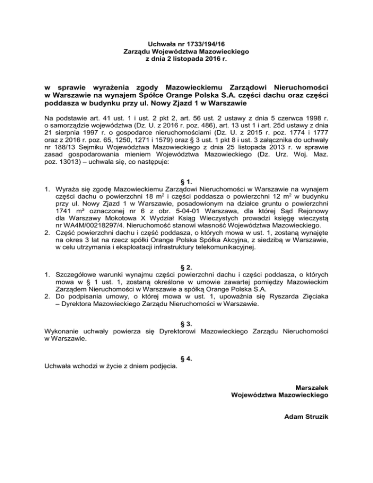 Uchwała nr 1733/194/16 Zarządu Województwa Mazowieckiego z dnia 2 listopada 2016 r. w sprawie wyrażenia zgody Mazowieckiemu Zarządowi Nieruchomości w Warszawie na wynajem Spółce Orange Polska S.A. części dachu oraz części poddasza w budynku przy ul. Nowy Zjazd 1 w Warszawie Na podstawie art. 41 ust. 1 i ust. 2 pkt 2, art. 56 ust. 2 ustawy z dnia 5 czerwca 1998 r. o samorządzie województwa (Dz. U. z 2016 r. poz. 486), art. 13 ust 1 i art. 25d ustawy z dnia 21 sierpnia 1997 r. o gospodarce nieruchomościami (Dz. U. z 2015 r. poz. 1774 i 1777 oraz z 2016 r. poz. 65, 1250, 1271 i 1579) oraz § 3 ust. 1 pkt 8 i ust. 3 załącznika do uchwały nr 188/13 Sejmiku Województwa Mazowieckiego z dnia 25 listopada 2013 r. w sprawie zasad gospodarowania mieniem Województwa Mazowieckiego (Dz. Urz. Woj. Maz. poz. 13013) – uchwala się, co następuje: § 1. 1. Wyraża się zgodę Mazowieckiemu Zarządowi Nieruchomości w Warszawie na wynajem części dachu o powierzchni 18 m2 i części poddasza o powierzchni 12 m2 w budynku przy ul. Nowy Zjazd 1 w Warszawie, posadowionym na działce gruntu o powierzchni 1741 m² oznaczonej nr 6 z obr. 5-04-01 Warszawa, dla której Sąd Rejonowy dla Warszawy Mokotowa X Wydział Ksiąg Wieczystych prowadzi księgę wieczystą nr WA4M/00218297/4. Nieruchomość stanowi własność Województwa Mazowieckiego. 2. Część powierzchni dachu i część poddasza, o których mowa w ust. 1, zostaną wynajęte na okres 3 lat na rzecz spółki Orange Polska Spółka Akcyjna, z siedzibą w Warszawie, w celu utrzymania i eksploatacji infrastruktury telekomunikacyjnej. § 2. 1. Szczegółowe warunki wynajmu części powierzchni dachu i części poddasza, o których mowa w § 1 ust. 1, zostaną określone w umowie zawartej pomiędzy Mazowieckim Zarządem Nieruchomości w Warszawie a spółką Orange Polska S.A. 2. Do podpisania umowy, o której mowa w ust. 1, upoważnia się Ryszarda Zięciaka – Dyrektora Mazowieckiego Zarządu Nieruchomości w Warszawie. § 3. Wykonanie uchwały powierza się Dyrektorowi Mazowieckiego Zarządu Nieruchomości w Warszawie. § 4. Uchwała wchodzi w życie z dniem podjęcia. Marszałek Województwa Mazowieckiego Adam Struzik