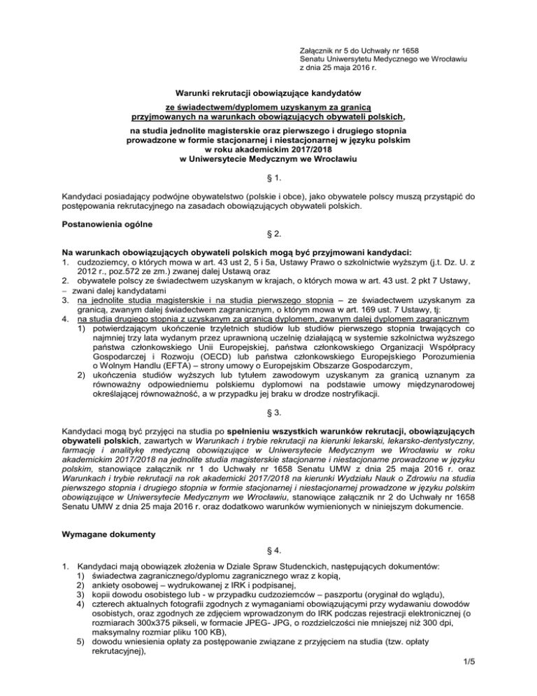 Załącznik nr 5 do Uchwały nr 1658 Senatu Uniwersytetu Medycznego we Wrocławiu z dnia 25 maja 2016 r. Warunki rekrutacji obowiązujące kandydatów ze świadectwem/dyplomem uzyskanym za granicą przyjmowanych na warunkach obowiązujących obywateli polskich, na studia jednolite magisterskie oraz pierwszego i drugiego stopnia prowadzone w formie stacjonarnej i niestacjonarnej w języku polskim w roku akademickim 2017/2018 w Uniwersytecie Medycznym we Wrocławiu § 1. Kandydaci posiadający podwójne obywatelstwo (polskie i obce), jako obywatele polscy muszą przystąpić do postępowania rekrutacyjnego na zasadach obowiązujących obywateli polskich. Postanowienia ogólne § 2. Na warunkach obowiązujących obywateli polskich mogą być przyjmowani kandydaci: 1. cudzoziemcy, o których mowa w art. 43 ust 2, 5 i 5a, Ustawy Prawo o szkolnictwie wyższym (j.t. Dz. U. z 2012 r., poz.572 ze zm.) zwanej dalej Ustawą oraz 2. obywatele polscy ze świadectwem uzyskanym w krajach, o których mowa w art. 43 ust. 2 pkt 7 Ustawy, zwani dalej kandydatami 3. na jednolite studia magisterskie i na studia pierwszego stopnia – ze świadectwem uzyskanym za granicą, zwanym dalej świadectwem zagranicznym, o którym mowa w art. 169 ust. 7 Ustawy, tj: 4. na studia drugiego stopnia z uzyskanym za granicą dyplomem, zwanym dalej dyplomem zagranicznym 1) potwierdzającym ukończenie trzyletnich studiów lub studiów pierwszego stopnia trwających co najmniej trzy lata wydanym przez uprawnioną uczelnię działającą w systemie szkolnictwa wyższego państwa członkowskiego Unii Europejskiej, państwa członkowskiego Organizacji Współpracy Gospodarczej i Rozwoju (OECD) lub państwa członkowskiego Europejskiego Porozumienia o Wolnym Handlu (EFTA) – strony umowy o Europejskim Obszarze Gospodarczym, 2) ukończenia studiów wyższych lub tytułem zawodowym uzyskanym za granicą uznanym za równoważny odpowiedniemu polskiemu dyplomowi na podstawie umowy międzynarodowej określającej równoważność, a w przypadku jej braku w drodze nostryfikacji. § 3. Kandydaci mogą być przyjęci na studia po spełnieniu wszystkich warunków rekrutacji, obowiązujących obywateli polskich, zawartych w Warunkach i trybie rekrutacji na kierunki lekarski, lekarsko-dentystyczny, farmację i analitykę medyczną obowiązujące w Uniwersytecie Medycznym we Wrocławiu w roku akademickim 2017/2018 na jednolite studia magisterskie stacjonarne i niestacjonarne prowadzone w języku polskim, stanowiące załącznik nr 1 do Uchwały nr 1658 Senatu UMW z dnia 25 maja 2016 r. oraz Warunkach i trybie rekrutacji na rok akademicki 2017/2018 na kierunki Wydziału Nauk o Zdrowiu na studia pierwszego stopnia i drugiego stopnia w formie stacjonarnej i niestacjonarnej prowadzone w języku polskim obowiązujące w Uniwersytecie Medycznym we Wrocławiu, stanowiące załącznik nr 2 do Uchwały nr 1658 Senatu UMW z dnia 25 maja 2016 r. oraz dodatkowo warunków wymienionych w niniejszym dokumencie. Wymagane dokumenty § 4. 1. Kandydaci mają obowiązek złożenia w Dziale Spraw Studenckich, następujących dokumentów: 1) świadectwa zagranicznego/dyplomu zagranicznego wraz z kopią, 2) ankiety osobowej – wydrukowanej z IRK i podpisanej, 3) kopii dowodu osobistego lub - w przypadku cudzoziemców – paszportu (oryginał do wglądu), 4) czterech aktualnych fotografii zgodnych z wymaganiami obowiązującymi przy wydawaniu dowodów osobistych, oraz zgodnych ze zdjęciem wprowadzonym do IRK podczas rejestracji elektronicznej (o rozmiarach 300x375 pikseli, w formacie JPEG- JPG, o rozdzielczości nie mniejszej niż 300 dpi, maksymalny rozmiar pliku 100 KB), 5) dowodu wniesienia opłaty za postępowanie związane z przyjęciem na studia (tzw. opłaty rekrutacyjnej), 1/5 6) uwierzytelnionego tłumaczenia świadectwa zagranicznego/dyplomu zagranicznego na język polski (uwierzytelnionego tłumaczenia może dokonać tylko tłumacz przysięgły języka obcego wpisany przez Ministra Sprawiedliwości na listę tłumaczy przysięgłych – tłumaczenia przysięgłe tłumaczy języka polskiego zarejestrowanych za granicą Polski nie będą honorowane), 7) zaświadczenia lekarskiego, stwierdzającego brak przeciwwskazań do podjęcia kształcenia na wybranym kierunku (w przypadku, gdy zaświadczenie wydane jest w języku obcym, konieczne jest tłumaczenie na język polski), 8) polisy ubezpieczeniowej na wypadek choroby lub następstw nieszczęśliwych wypadków na okres kształcenia w Polsce albo Europejskiej Karty Ubezpieczenia Zdrowotnego lub oświadczenia o przystąpieniu do ubezpieczenia w Narodowym Funduszu Zdrowia niezwłocznie po rozpoczęciu kształcenia, 9) kopii karty Polaka (oryginał do wglądu) – jeśli jest posiadaczem, 10) dokumentu potwierdzającego, że kandydat jest osobą, o której mowa w art. 43 ust 2 Ustawy, 11) dokumentu potwierdzającego znajomość języka polskiego: a) zaświadczenia o ukończeniu rocznego kursu przygotowawczego do podjęcia nauki w języku polskim w jednostkach wyznaczonych przez ministra właściwego do spraw szkolnictwa wyższego (Kursy języka polskiego prowadzone są przez Studium Języka Polskiego dla Cudzoziemców przy Uniwersytecie w Łodzi: ul. Matejki 21/23, 90-231 Łódź, tel. (48 42) 635 47 03; fax (48 42) 678 47 06; e-mail: [email protected] ) lub b) certyfikatu znajomości języka polskiego wydanego przez placówkę uznaną przez Państwową Komisję ds. Poświadczania Znajomości Języka Polskiego jako Obcego, jeśli posiada. 12) dokumentu wystawionego przez Uniwersytet Medyczny we Wrocławiu – po przeprowadzonym egzaminie z języka polskiego – potwierdzającego, że przygotowanie oraz stopień znajomości języka polskiego przez kandydata, w tym w zakresie słownictwa biologicznego i chemicznego, pozwala na podjęcie studiów w UMW w języku polskim, 13) dodatkowo – na studia drugiego stopnia: a) publikację, (o której jest mowa w § 4 ust. 2 Warunków i trybu rekrutacji na rok akademicki 