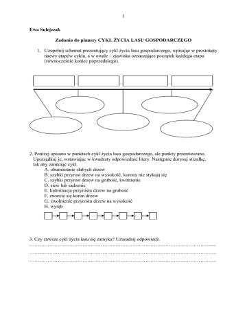 1 Ewa Sulejczak Zadania do planszy CYKL ŻYCIA LASU GOSPODARCZEGO 1. Uzupełnij schemat prezentujący cykl życia lasu gospodarczego, wpisując w prostokąty nazwy etapów cyklu, a w owale – zjawiska oznaczające początek każdego etapu (równocześnie koniec poprzedniego). 2. Poniżej opisano w punktach cykl życia lasu gospodarczego, ale punkty przemieszano. Uporządkuj je, wstawiając w kwadraty odpowiednie litery. Następnie dorysuj strzałkę, tak aby zamknąć cykl. A. obumieranie słabych drzew B. szybki przyrost drzew na wysokość, korony nie stykają się C. szybki przyrost drzew na grubość, kwitnienie D. siew lub sadzenie E. kulminacja przyrostu drzew na grubość F. zwarcie się koron drzew G. zwolnienie przyrostu drzew na wysokość H. wyrąb 3. Czy zawsze cykl życia lasu się zamyka? Uzasadnij odpowiedź. ………………………………………………………………………………………………….. ………………………………………………………………………………………………….. ………………………………………………………………………………………………….. 2 4. Pożar może gwałtownie przerwać cykl życia lasu. Wymień trzy skutki takiego zdarzenia. 5. Uważnie przeczytaj definicję lasu gospodarczego umieszczoną pośrodku planszy. Napisz, jak tę definicję rozumiesz. Zwróć szczególną uwagę na określenia: racjonalna gospodarka, korzystne relacje społeczno-gospodarcze, różnorodność biologiczna. ………………………………………………………………………………………………….. ………………………………………………………………………………………………….. ………………………………………………………………………………………………….. ………………………………………………………………………………………………….. ………………………………………………………………………………………………….. ………………………………………………………………………………………………….. 6. Las pełni funkcje społeczne, ochronne i gospodarcze. Czy określenie „las gospodarczy” oznacza, że w takim lesie ważne są tylko funkcje gospodarcze? Uzasadnij odpowiedź. ………………………………………………………………………………………………….. ………………………………………………………………………………………………….. ………………………………………………………………………………………………….. ………………………………………………………………………………………………….. ………………………………………………………………………………………………….. 7. Poniżej przemieszano cechy lasu posadzonego przez człowieka i lasu rosnącego bez ingerencji człowieka. Zakreśl te cechy, które odnoszą się do lasu posadzonego przez człowieka. drzewa rosnące w miejscach przypadkowych, nieregularnie korony dorosłych drzew mają bardzo podobną wielkość zauważalna regularność w rozmieszczeniu drzew (np. rzędy) korony dorosłych drzew mają bardzo różną wielkość różnorodność biologiczna większa niż w drugim rodzaju lasu wszystkie martwe drzewa nie są usuwane 3 8. Wpisz w każdej komórce tabeli przynajmniej jedną wadę lub zaletę lasu, w którym występuje jeden gatunek drzew i lasu wielogatunkowego. Uwzględnij łatwość przeprowadzania zabiegów (np. pielęgnowania młodych drzewek, wyrębu), różnorodność biologiczną i zagrożenie masowym pojawianiem się owadów mogących wyrządzić szkody. Zalety Wady Las jednogatunkowy Las wielogatunkowy 9. Z każdej pary określeń oznaczonych grubym drukiem wykreśl jedno, tak aby zdanie było prawdziwe. W czasie zakładania uprawy leśnej młode drzewka sadzi się stosunkowo gęsto. Dzięki temu dość szybko rosną w górę / rozrastają się wszerz. Gęste sadzenie też powoduje, że pnie młodych drzewek są krzywe / proste. Kiedy korony drzew stykają się, hamują dostęp światła do słabszych drzew, które rosną wtedy szybciej / stopniowo obumierają. W takim lesie prowadzi się też cięcia pielęgnacyjne, usuwając drzewa najsilniejsze / słabe, chore, utrudniające wzrost tym, rosnącym obok. Drzewa zaczynają wolniej przyrastać na wysokość i szybciej / wolniej na grubość. Zaczynają też kwitnąć. W wiek rębności wkraczają w tym momencie / wtedy, gdy osiągną kulminację przyrostu na grubość. 10. Las osiąga wiek rębności, kiedy leśne drzewa osiągają kulminację przyrostu na grubość. To oznacza, że i wcześniej, i później pogrubianie się pnia jest powolniejsze. Ponadto drzewa zaczynają powoli obumierać po okresie kulminacji przyrostu na grubość. Wyjaśnij, dlaczego to właśnie wtedy leśnicy zaczynają wyrąb. ……………………………………………………………………………………………. ……………………………………………………………………………………………. 4 Odpowiedzi 1. uprawa leśna las dojrzewający młodnik las dojrzały szybki przyrost drzew na grubość zwarcie koron drzew wydzielenie się słabszych drzew siew lub sadzenie wyrąb 2. D B F A G C E H 3. Przykładowa odpowiedź: Las na każdym etapie rozwoju może zniszczyć powódź, huragan, pożar. 4. Przykładowa odpowiedź: Leśne zwierzęta giną albo migrują na inne tereny. Odsłonięta warstwa gleby ulega erozji. Do atmosfery dostaje się pochodzący ze spalania CO2. 5. Przykładowa odpowiedź: W lesie gospodarczym przeprowadza się wiele zabiegów, aby uzyskać duże korzyści, np. dobrej jakości drewno (m.in. proste, grube pnie). Przy tym nie wolno niszczyć lasu ani powodować zanikania 