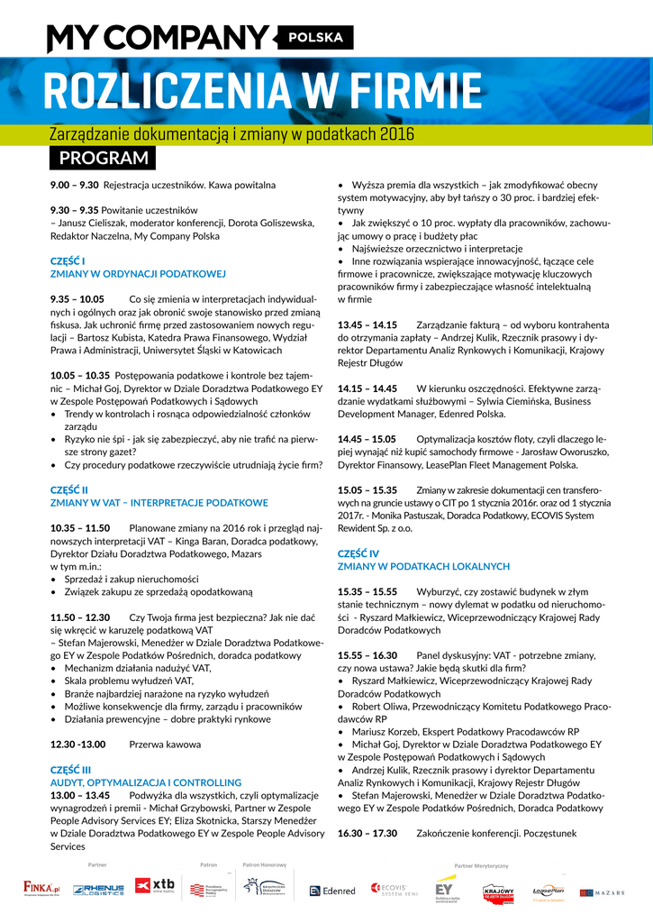 ROZLICZENIA W FIRMIE Zarządzanie dokumentacją i zmiany w podatkach 2016 PROGRAM 9.00 – 9.30 Rejestracja uczestników. Kawa powitalna 9.30 – 9.35 Powitanie uczestników – Janusz Cieliszak, moderator konferencji, Dorota Goliszewska, Redaktor Naczelna, My Company Polska CZĘŚĆ I ZMIANY W ORDYNACJI PODATKOWEJ 9.35 – 10.05 Co się zmienia w interpretacjach indywidualnych i ogólnych oraz jak obronić swoje stanowisko przed zmianą fiskusa. Jak uchronić firmę przed zastosowaniem nowych regulacji – Bartosz Kubista, Katedra Prawa Finansowego, Wydział Prawa i Administracji, Uniwersytet Śląski w Katowicach 10.05 – 10.35 Postępowania podatkowe i kontrole bez tajemnic – Michał Goj, Dyrektor w Dziale Doradztwa Podatkowego EY w Zespole Postępowań Podatkowych i Sądowych • Trendy w kontrolach i rosnąca odpowiedzialność członków zarządu • Ryzyko nie śpi - jak się zabezpieczyć, aby nie trafić na pierwsze strony gazet? • Czy procedury podatkowe rzeczywiście utrudniają życie firm? CZĘŚĆ II ZMIANY W VAT – INTERPRETACJE PODATKOWE • Wyższa premia dla wszystkich – jak zmodyfikować obecny system motywacyjny, aby był tańszy o 30 proc. i bardziej efektywny • Jak zwiększyć o 10 proc. wypłaty dla pracowników, zachowując umowy o pracę i budżety płac • Najświeższe orzecznictwo i interpretacje • Inne rozwiązania wspierające innowacyjność, łączące cele firmowe i pracownicze, zwiększające motywację kluczowych pracowników firmy i zabezpieczające własność intelektualną w firmie 13.45 – 14.15 Zarządzanie fakturą – od wyboru kontrahenta do otrzymania zapłaty – Andrzej Kulik, Rzecznik prasowy i dyrektor Departamentu Analiz Rynkowych i Komunikacji, Krajowy Rejestr Długów 14.15 – 14.45 W kierunku oszczędności. Efektywne zarządzanie wydatkami służbowymi – Sylwia Ciemińska, Business Development Manager, Edenred Polska. 14.45 – 15.05 Optymalizacja kosztów floty, czyli dlaczego lepiej wynająć niż kupić samochody firmowe - Jarosław Oworuszko, Dyrektor Finansowy, LeasePlan Fleet Management Polska. Program Program 15.05 – 15.35 Zmiany w zakresie dokumentacji cen transferoRejestracja uczestników. Kawa powitalna wych nauczestników. gruncie ustawy Rejestracja Kawa powitalnao CIT po 1 stycznia 2016r. oraz od 1 stycznia 9.30 – 9.35 - Monika Powitanie uczestników – Janusz Cieliszak,Podatkowy, moderator konferencji, 2017r. ECOVIS System 9.30 – 9.35 Powitanie uczestników Pastuszak, – Janusz Cieliszak,Doradca moderator konferencji, Dorota Goliszewska, Redaktor Naczelna, My Company Polska Dorota Goliszewska, Redaktor Naczelna, My Company Polska 10.35 – 11.50 Planowane zmiany na 2016 rok i przegląd najRewident Sp. z o.o. nowszych interpretacji VAT – Kinga Baran, Doradca podatkowy, Część I – zmiany w ordynacji podatkowej Rejestracja uczestników. Kawa powitalna Część I – zmiany w ordynacji podatkowej Dyrektor Działu Doradztwa Podatkowego, Mazars CZĘŚĆ IV Powitanie uczestników – Janusz Cieliszak, moderator konferencji, 9.35 – 10.05 Co się zmienia w interpretacjach indywidualnych i ogólnych oraz jak obronić swoje stanowisko Dorota Goliszewska,w tym Redaktor Naczelna, m.in.:My Company Polska ZMIANY LOKALNYCH 9.35 – 10.05 Co się zmieniaW PODATKACH w interpretacjach indywidualnych i ogólnych oraz jak obronić swoje stanowisko przed zmianą fiskusa. Jak uchronić firmę przed zastosowaniem nowych regulacji – Bartosz przed zmianą fiskusa. Jak uchronić firmę przed zastosowaniem nowych regulacji – Bartosz • Sprzedaż i zakup nieruchomości Kubista, Katedra Prawa Finansowego, Wydział Prawa i Administracji, Uniwersytet Śląski w Katowicach Kubista, Katedra Prawa Finansowego, Wydział Prawa i Administracji, Uniwersytet Śląski w Katowicach ny w ordynacji podatkowej • Związek zakupu ze sprzedażą opodatkowaną 15.35 – 15.55 Wyburzyć, czy zostawić w złym 10.05 – 10.35 Postępowania podatkowe i kontrole bez tajemnic budynek – Michał Goj, Dyrektor w Dziale Doradztwa 10.05 – 10.35 Postępowania podatkowe i kontrole bez tajemnic – Michał Goj, Dyrektor w Dziale Doradztwa Podatkowego EY w Zespole Postępowań Podatkowych i Sądowych stanie technicznym – nowy dylemat w podatku od nieruchomoPodatkowego EY w Zespole Postępowań Podatkowych i Sądowych Trendy w kontrolach i rosnąca odpowiedzialność członków zarządu Co się zmienia w interpretacjach indywidualnych i ogólnych oraz jak obronić swoje stanowisko Trendy w kontrolach i rosnąca odpowiedzialność członków zarządu Ryzyko nie śpi - jak się zabezpieczyć, aby nie trafić na pierwsze strony gazet? przed zmianą fiskusa. Jak–uchronić firmę przed nowych regulacji – Bartosz 11.50 12.30 Czyzastosowaniem Twoja firma jest bezpieczna? Jak nie dać ści Ryszard Małkiewicz, Wiceprzewodniczący Ryzyko nie śpi - jak się zabezpieczyć, aby nie trafić na pierwsze strony gazet? Krajowej Rady Czy procedury podatkowe rzeczywiście utrudniają życie firm? Kubista, Katedra Prawa Finansowego, Wydział Prawa i Administracji, Uniwersytet Śląski w Katowicach Czy procedury podatkowe rzeczywiście utrudniają życie firm? się wkręcić w karuzelę podatkową VAT Doradców Podatkowych Postępowania podatkowe i kontrole bez tajemnic – Michał Goj, Dyrektor w Dziale Doradztwa – Stefan Majerowski, Menedżer w Dziale Doradztwa Podatkowe- Część II – Zmiany w VAT – interpretacje podatkowe Podatkowego EY w Zespole Postępowań Podatkowych i Sądowych Część II – Zmiany w VAT – interpretacje podatkowe Trendy w kontrolach i rosnąca odpowiedzialność członków zarządu go EY w Zespole Podatków Pośrednich, doradca podatkowy 15.55 – 16.30 Panel dyskusyjny: VAT - potrzebne zmiany, Ryzyko nie śpi - jak się zabezpieczyć, aby nie trafić na pierwsze strony gazet? 10.35 – 11.50 Planowane zmiany na 2016 rok skutki i przegląd najnowszych interpretacji VAT – Kinga Baran, Doradca Czy procedury• podatkow
