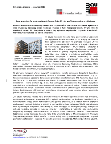 Informacja prasowa – czerwiec 2013 Znamy zwycięzców konkursu Baumit Fasada Roku 2013 – wyróżniona realizacja z Krakowa Konkurs Fasada Roku cieszy się niesłabnącą popularnością. Od kilku lat architekci, wykonawcy oraz inwestorzy zgłaszają swoje realizacje i walczą o tytuł najlepszej fasady. W tym roku do rywalizacji stanęło 211 budynków, z których Jury wybrało 4 zwycięzców i przyznało 9 wyróżnień. Wśród laureatów znalazł się obiekt z Krakowa. VII edycja konkursu Fasada Roku pod wieloma względami była wyjątkowa. Przede wszystkim po raz kolejny padł rekord ilości zgłoszonych obiektów. W pierwszej kategorii „Nowy budynek” – znalazło się 89 obiektów, w drugiej – „Budynek po rekonstrukcji i adaptacji” – 44, w trzeciej – „Budynek z wielkiej płyty” – 46, a w czwartej – „Budynek po renowacji” – 32. W sumie o główną nagrodę rywalizowało aż 211 budynków. Jury złożone z wybitnych architektów, osób Zespół Budynków Mieszkalnozawodowo związanych z branżą budowlaną, a także Usługowych Apartamenty Novum z przedstawicieli mediów branżowych nie miało łatwego Krakowa, fot. Baumit zadania. Jurorzy zwracali szczególną uwagę na zastosowane kolory i struktury na elewacji oraz ich kreatywne łączenie. Nagrodzono realizacje, które podkreślają charakter budynku oraz te które w naturalny sposób wpisują się w otoczenie i nie burzą harmonii przestrzeni, w jakiej się znajdują. W pierwszej kategorii „Nowy budynek” wyróżnienie zostało przyznane Zespołowi Budynków Mieszkalno-Usługowych Apartamenty Novum z Krakowa. Realizacja zlokalizowana przy ul. Rakowickiej została zgłoszona do konkursu przez biuro architektoniczne IMB Asymetria Sp. z o.o. i Wspólnicy sp. k. Autorem projektu jest Marek Borkowski. Wykonawcą jest firma Erbud S.A, inwestorem – firma Durham Sp. z o.o. Jury zaintrygowało zestawienie brył dwóch budynków mieszkalnych podkreślonych przeciwstawnymi kolorami– czarnym i białym. Projekt podkreślają zaakcentowane innym odcieniem detale architektoniczne przełamujące monokolorystyczne ściany. Zastosowanie różnorodnych materiałów elewacyjnych oraz wysoka jakość wykonania podnoszą wartość kompozycji całej fasady. „VII edycja konkursu Fasada Roku przeszła do historii. Po raz kolejny nie zawiedli nas architekci, projektanci, wykonawcy i inwestorzy, którzy zgłosili swoje projekty do konkursu i podzielili się z nami efektami swojej pracy. Konkursowe Jury zgodnie przyznało, że z każdym rokiem przybywa doskonałych realizacji i ciężko je ocenić, a tym bardziej wybrać najlepsze. Wśród nagrodzonych oraz wyróżnionych budynków znalazły się te, które zasługują na szczególną uwagę. Precyzja w doborze kolorów, odwaga w łączeniu struktur i materiałów, a wszystko przy zachowaniu oryginalnej koncepcji architektonicznej to walory, które zachwyciły Jurorów. Zwieńczeniem tegorocznej edycji konkursu Fasada Roku była uroczysta gala w Międzynarodowym Centrum Targowo-Kongresowym EXPO Kraków, podczas której autorzy najlepszych projektów otrzymali pamiątkowe statuetki.”– wyjaśnia Aleksandra Gilewska, Manager ds. Marketingu w firmie Baumit. Kontakt prasowy: Rafał Wójcicki, [email protected], tel.: 667 74 09 10, 71 78 95 204 Informacja prasowa – czerwiec 2013 www.fasadaroku.pl www.baumit.com Baumit jest wspólną marką dwóch austriackich, rodzinnych koncernów z branży budowlanej – Schmid Industrieholding oraz Wietersdorfer Gruppe. Łączy je ponad 110-letnia tradycja i bogate doświadczenia w dziedzinie produkcji materiałów budowlanych. Już teraz przedstawicielstwa handlowe, filie lub zakłady produkcyjne Baumit znajdują się w 30 krajach Europy oraz w Chinach. Firma obecna jest w Polsce od 20 lat, gdzie posiada trzy zakłady produkcyjne: w Pobiedziskach k. Poznania, Łowiczu oraz Bełchatowie. Szczególnie silną pozycję na polskim rynku materiałów budowlanych, Baumit zdobył w zakresie produkcji i sprzedaży kompletnych systemów ociepleń budynków, tynków maszynowych, (cementowo-wapiennych i gipsowych). Ponadto oferta produktowa Baumit obejmuje także m.in. produkty do: układania płytek ceramicznych, materiały do renowacji zabytków, a także jastrychy, wyprawy wierzchnie oraz zaprawy murarskie. Kontakt prasowy: Rafał Wójcicki, [email protected], tel.: 667 74 09 10, 71 78 95 204