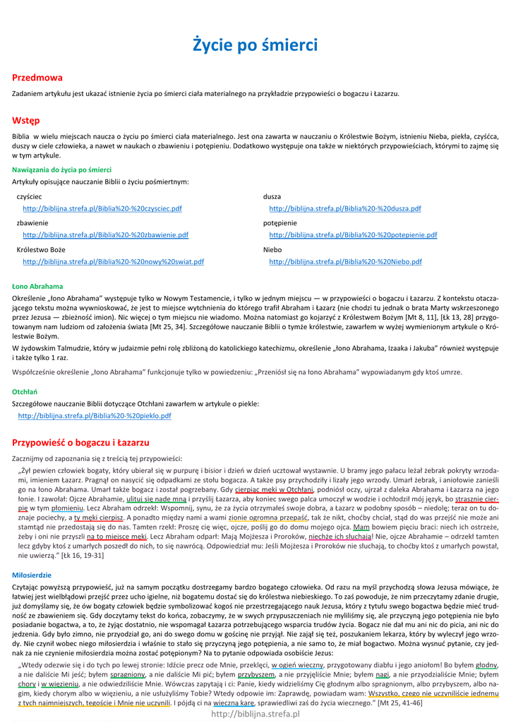Życie po śmierci Przedmowa Zadaniem artykułu jest ukazać istnienie życia po śmierci ciała materialnego na przykładzie przypowieści o bogaczu i Łazarzu. Wstęp Biblia w wielu miejscach naucza o życiu po śmierci ciała materialnego. Jest ona zawarta w nauczaniu o Królestwie Bożym, istnieniu Nieba, piekła, czyśćca, duszy w ciele człowieka, a nawet w naukach o zbawieniu i potępieniu. Dodatkowo występuje ona także w niektórych przypowieściach, którymi to zajmę się w tym artykule. Nawiązania do życia po śmierci Artykuły opisujące nauczanie Biblii o życiu pośmiertnym: czyściec dusza http://biblijna.strefa.pl/Biblia%20-%20czysciec.pdf http://biblijna.strefa.pl/Biblia%20-%20dusza.pdf zbawienie potępienie http://biblijna.strefa.pl/Biblia%20-%20zbawienie.pdf http://biblijna.strefa.pl/Biblia%20-%20potepienie.pdf Królestwo Boże Niebo http://biblijna.strefa.pl/Biblia%20-%20nowy%20swiat.pdf http://biblijna.strefa.pl/Biblia%20-%20Niebo.pdf Łono Abrahama Określenie „łono Abrahama” występuje tylko w Nowym Testamencie, i tylko w jednym miejscu — w przypowieści o bogaczu i Łazarzu. Z kontekstu otaczającego tekstu można wywnioskować, że jest to miejsce wytchnienia do którego trafił Abraham i Łazarz (nie chodzi tu jednak o brata Marty wskrzeszonego przez Jezusa — zbieżność imion). Nic więcej o tym miejscu nie wiadomo. Można natomiast go kojarzyć z Królestwem Bożym [Mt 8, 11], [Łk 13, 28] przygotowanym nam ludziom od założenia świata [Mt 25, 34]. Szczegółowe nauczanie Biblii o tymże królestwie, zawarłem w wyżej wymienionym artykule o Królestwie Bożym. W żydowskim Talmudzie, który w judaizmie pełni rolę zbliżoną do katolickiego katechizmu, określenie „łono Abrahama, Izaaka i Jakuba” również występuje i także tylko 1 raz. Współcześnie określenie „łono Abrahama” funkcjonuje tylko w powiedzeniu: „Przeniósł się na łono Abrahama” wypowiadanym gdy ktoś umrze. Otchłań Szczegółowe nauczanie Biblii dotyczące Otchłani zawarłem w artykule o piekle: http://biblijna.strefa.pl/Biblia%20-%20pieklo.pdf Przypowieść o bogaczu i Łazarzu Zacznijmy od zapoznania się z treścią tej przypowieści: „Żył pewien człowiek bogaty, który ubierał się w purpurę i bisior i dzień w dzień ucztował wystawnie. U bramy jego pałacu leżał żebrak pokryty wrzodami, imieniem Łazarz. Pragnął on nasycić się odpadkami ze stołu bogacza. A także psy przychodziły i lizały jego wrzody. Umarł żebrak, i aniołowie zanieśli go na łono Abrahama. Umarł także bogacz i został pogrzebany. Gdy cierpiąc męki w Otchłani, podniósł oczy, ujrzał z daleka Abrahama i Łazarza na jego łonie. I zawołał: Ojcze Abrahamie, ulituj się nade mną i przyślij Łazarza, aby koniec swego palca umoczył w wodzie i ochłodził mój język, bo strasznie cierpię w tym płomieniu. Lecz Abraham odrzekł: Wspomnij, synu, że za życia otrzymałeś swoje dobra, a Łazarz w podobny sposób – niedolę; teraz on tu doznaje pociechy, a ty męki cierpisz. A ponadto między nami a wami zionie ogromna przepaść, tak że nikt, choćby chciał, stąd do was przejść nie może ani stamtąd nie przedostają się do nas. Tamten rzekł: Proszę cię więc, ojcze, poślij go do domu mojego ojca. Mam bowiem pięciu braci: niech ich ostrzeże, żeby i oni nie przyszli na to miejsce męki. Lecz Abraham odparł: Mają Mojżesza i Proroków, niechże ich słuchają! Nie, ojcze Abrahamie – odrzekł tamten lecz gdyby ktoś z umarłych poszedł do nich, to się nawrócą. Odpowiedział mu: Jeśli Mojżesza i Proroków nie słuchają, to choćby ktoś z umarłych powstał, nie uwierzą.” [Łk 16, 19-31] Miłosierdzie Czytając powyższą przypowieść, już na samym początku dostrzegamy bardzo bogatego człowieka. Od razu na myśl przychodzą słowa Jezusa mówiące, że łatwiej jest wielbłądowi przejść przez ucho igielne, niż bogatemu dostać się do królestwa niebieskiego. To zaś powoduje, że nim przeczytamy zdanie drugie, już domyślamy się, że ów bogaty człowiek będzie symbolizować kogoś nie przestrzegającego nauk Jezusa, który z tytułu swego bogactwa będzie mieć trudność ze zbawieniem się. Gdy doczytamy tekst do końca, zobaczymy, że w swych przypuszczeniach nie myliliśmy się, ale przyczyną jego potępienia nie było posiadanie bogactwa, a to, że żyjąc dostatnio, nie wspomagał Łazarza potrzebującego wsparcia trudów życia. Bogacz nie dał mu ani nic do picia, ani nic do jedzenia. Gdy było zimno, nie przyodział go, ani do swego domu w gościnę nie przyjął. Nie zajął się też, poszukaniem lekarza, który by wyleczył jego wrzody. Nie czynił wobec niego miłosierdzia i właśnie to stało się przyczyną jego potępienia, a nie samo to, że miał bogactwo. Można wysnuć pytanie, czy jednak za nie czynienie miłosierdzia można zostać potępionym? Na to pytanie odpowiada osobiście Jezus: „Wtedy odezwie się i do tych po lewej stronie: Idźcie precz ode Mnie, przeklęci, w ogień wieczny, przygotowany diabłu i jego aniołom! Bo byłem głodny, a nie daliście Mi jeść; byłem spragniony, a nie daliście Mi pić; byłem przybyszem, a nie przyjęliście Mnie; byłem nagi, a nie przyodzialiście Mnie; byłem chory i w więzieniu, a nie odwiedziliście Mnie. Wówczas zapytają i ci: Panie, kiedy widzieliśmy Cię głodnym albo spragnionym, albo przybyszem, albo nagim, kiedy chorym albo w więzieniu, a nie usłużyliśmy Tobie? Wtedy odpowie im: Zaprawdę, powiadam wam: Wszystko, czego nie uczyniliście jednemu z tych najmniejszych, tegoście i Mnie nie uczynili. I pójdą ci na wieczną karę, sprawiedliwi zaś do życia wiecznego.” [Mt 25, 41-46] http://biblijna.strefa.pl Artykuł omawia bardzo szczegółowo przypowieść o bogaczu i Łazarzu. Wskazuje też kilkanaście wniosków z niej płynących. Omawia łono Abrahama, Otchłań, potępienie, 2 sądy (w tym jeden ostateczny), miłosierdzie 