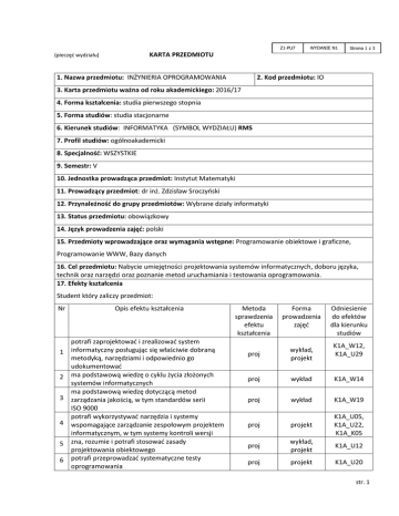 Z1-PU7 WYDANIE N1 Strona 1 z 3 KARTA PRZEDMIOTU (pieczęć wydziału) 1. Nazwa przedmiotu: INŻYNIERIA OPROGRAMOWANIA 2. Kod przedmiotu: IO 3. Karta przedmiotu ważna od roku akademickiego: 2016/17 4. Forma kształcenia: studia pierwszego stopnia 5. Forma studiów: studia stacjonarne 6. Kierunek studiów: INFORMATYKA (SYMBOL WYDZIAŁU) RMS 7. Profil studiów: ogólnoakademicki 8. Specjalność: WSZYSTKIE 9. Semestr: V 10. Jednostka prowadząca przedmiot: Instytut Matematyki 11. Prowadzący przedmiot: dr inż. Zdzisław Sroczyński 12. Przynależność do grupy przedmiotów: Wybrane działy informatyki 13. Status przedmiotu: obowiązkowy 14. Język prowadzenia zajęć: polski 15. Przedmioty wprowadzające oraz wymagania wstępne: Programowanie obiektowe i graficzne, Programowanie WWW, Bazy danych 16. Cel przedmiotu: Nabycie umiejętności projektowania systemów informatycznych, doboru języka, technik oraz narzędzi oraz poznanie metod uruchamiania i testowania oprogramowania. 17. Efekty kształcenia Student który zaliczy przedmiot: Nr 1 2 3 4 5 6 Opis efektu kształcenia potrafi zaprojektować i zrealizować system informatyczny posługując się właściwie dobraną metodyką, narzędziami i odpowiednio go udokumentować ma podstawową wiedzę o cyklu życia złożonych systemów informatycznych ma podstawową wiedzę dotyczącą metod zarządzania jakością, w tym standardów serii ISO 9000 potrafi wykorzystywać narzędzia i systemy wspomagające zarządzanie zespołowym projektem informatycznym, w tym systemy kontroli wersji zna, rozumie i potrafi stosować zasady projektowania obiektowego potrafi przeprowadzać systematyczne testy oprogramowania Metoda sprawdzenia efektu kształcenia Forma prowadzenia zajęć Odniesienie do efektów dla kierunku studiów K1A_W12, K1A_U29 proj wykład, projekt proj wykład K1A_W14 proj wykład K1A_W19 proj projekt K1A_U05, K1A_U22, K1A_K05 proj wykład, projekt K1A_U12 proj projekt K1A_U20 str. 1 zna i potrafi zastosować metody szacowania złożoności i pracochłonności produkcji oprogramowania potrafi identyfikować czynniki społeczne, prawne i 8 organizacyjne wpływające na jakość i bezpieczeństwo projektowanego systemu 18. Formy zajęć dydaktycznych i ich wymiar (liczba godzin) 7 Wykład 30 Ćwiczenia Laboratorium proj wykład K1A_U25 proj wykład, projekt K1A_U03, K1A_U09, K1A_K03 Projekt Seminarium 60 19. Treści kształcenia: Wykład: Projektowanie oprogramowania. Modele cyklu życia oprogramowania. Specyfikacja wymagań. Koncepcje tworzenia złożonego oprogramowania - podejście strukturalne i obiektowe. Korzystanie z API (Application Programming Interface). Narzędzia i środowiska wytwarzania oprogramowania. Modelowanie. UML. Narzędzia CASE. Dobre praktyki notacyjne, przenośność kodu źródłowego. Uruchamianie i testowanie oprogramowania. Refaktoring kodu. Zarządzanie projektem informatycznym. Systemy pracy grupowej, hostingowe, systemy kontroli wersji. Projektowanie interakcji człowiekkomputer. Dokumentacja procesu tworzenia oprogramowania oraz dokumentacja użytkowa. Optymalizacja czasowa i pamięciowa programów. Komunikacja program-użytkownik. Przygotowywanie aplikacji do wykorzystania przez osoby niepełnosprawne. Wdrożenie, utrzymanie i konserwacja oprogramowania. Ocena jakości i złożoności oprogramowania (kryteria, metryki). Projektowanie niezawodnego oprogramowania, programowanie zwinne (agile) oraz ekstremalne. Wzorce projektowe. Standardy i metodyki zarządzania jakością (ISO 9000). Projekt: Opracowanie projektu zespołowego. Wirtualizacja systemu operacyjnego, testowanie i uruchamianie aplikacji. Automatyzacja testów pośrednictwa graficznego. Ocena i poprawa efektywności oprogramowania. Komunikacja programów z użytkownikiem. Zarządzanie projektem informatycznym, notacje wspomagające modelowanie. Przygotowywanie programów i skryptów instalacyjnych. Tworzenie dokumentacji użytkowej oprogramowania i systemów pomocy. Narzędzia pracy grupowej, systemy hostingowe dla projektów informatycznych, wykorzystanie systemu kontroli wersji. 20. Egzamin: nie 21. Literatura podstawowa: 1. K. Sacha: „Inżynieria oprogramowania”, PWN, 2010. 2. J. Nielsen, R. Budiu: „Funkcjonalność aplikacji mobilnych. Nowoczesne standardy UX i UI”. Helion 2013. 3. K. Kaczor: „SCRUM i nie tylko. Teoria i praktyka w metodach Agile”, PWN 2014. 4. P. Szmal (red.): „Inżynieria programowania. Metody i ćwiczenia laboratoryjne”, Wydawnictwo Politechniki Śląskiej, Gliwice, 2003. 5. A. Jaszkiewicz: „Inżynieria oprogramowania”, Helion, 1997. 22. Literatura uzupełniająca: 1. W. Dąbrowski, A. Stasiak, M. Wolski: „Modelowanie systemów informatycznych w języku UML 2.1”, PWN, 2009. 2. S. H. Kan: „Metryki i modele w inżynierii jakości oprogramowania”, PWN, 2006. 3. P. Wróblewski: „Zarządzanie projektami z wykorzystaniem darmowego oprogramowania”, Helion 2009. 4. I. Sommerville: „Inżynieria Oprogramowania”, WNT, 2003. 5. B. Wiszniewski, B. Bereza-Jarociński: „Teoria i praktyka testowania programów”, PWN, 2006. 6. J. Spolsky: „Projektowanie interfejsu użytkownika. Poradnik dla programistów”, Mikom 2001. 7. S. Krug: „Nie każ mi myśleć. O życiowym podejściu do funkcjonalności stron internetowych”, Helion, 2006. str. 2 23. Nakład pracy studenta potrzebny do osiągnięcia efektów kształcenia Lp. Liczba godzin kontaktowych / pracy studenta 30/60 Forma zajęć 1 Wykład 2 Ćwiczenia / 3 Laboratorium / 4 Projekt 5 Seminarium / 6 Inne / 60/60 90/120 Suma godzin 24. 210 Suma wszystkich godzin 25. 7 Liczba punktów ECTS 26. Liczba punktów ECTS uzyskanych na zajęciach z bezpośrednim 7 udziałem nauczyciela akademickiego 27. Liczba punktów ECTS uzyskanych na zajęciach o charakterze 4 praktycznym (laboratoria, projekty) 28. Uwagi: Projekt 0-100 pkt. W ramach projektu obowiązkowa praca w zespole lub międzyzespołowa, z wykorzystaniem narzędzi pracy grupowej. Student powinie