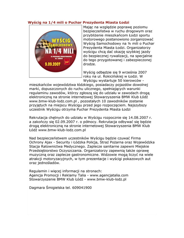Wyścig na 1/4 mili o Puchar Prezydenta Miasta Łodzi Mając na względzie poprawę poziomu bezpieczeństwa w ruchu drogowym oraz przybliżenie mieszkańcom Łodzi sportu motorowego postanowiono zorganizować Wyścig Samochodowy na ¼ mili o Puchar Prezydenta Miasta Łodzi. Organizatorzy wyścigu chcą dać okazję szybkiej jazdy do bezpiecznej rywalizacji, na specjalnie do tego przygotowanej i zabezpieczonej drodze. Wyścig odbędzie się 9 września 2007 roku na ul. Rokicińskiej w Łodzi. W Wyścigu wystartuje 50 kierowców mieszkańców województwa łódzkiego, posiadaczy pojazdów dowolnej marki, dopuszczonych do ruchu ulicznego, spełniających warunki regulaminu zawodów, którzy zgłoszą się do udziału w zawodach drogą elektroniczną na stronie internetowej Stowarzyszenia BMW Klub Łódź www.bmw-klub-lodz.com.pl , pozostałych 10 zawodników zostanie przyjętych na miejscu Wyścigu przed jego rozpoczęciem. Najszybszy uczestnik Wyścigu otrzyma Puchar Prezydenta Miasta Łodzi Rekrutacja chętnych do udziału w Wyścigu rozpocznie się 14.08.2007 r. a zakończy się 02.09.2007 r. o północy. Rekrutacja odbywać się będzie drogą elektroniczną na stronie internetowej Stowarzyszenia BMW Klub Łódź www.bmw-klub-lodz.com.pl Nad bezpieczeństwem uczestników Wyścigu będzie czuwać Firma Ochrony Ajax - Security i Łódzka Policja, Straż Pożarna oraz Wojewódzka Stacja Ratownictwa Medycznego. Zaplecze sanitarne zapewni Miejskie Przedsiębiorstwo Oczyszczania. Organizatorzy zapewnią także oprawę muzyczną oraz zaplecze gastronomiczne. Widzowie mogą liczyć na wiele atrakcji motoryzacyjnych, w tym prezentacje i wyścigi pokazowych aut oraz jednośladów. Regulamin i więcej informacji na stronach: Agencja Promocji i Reklamy Talia - www.agencjatalia.com Stowarzyszenie BMW Klub Łódź - www.bmw-klub-lodz.pl Dagmara Śmigielska tel. 609041900 Regulamin Wyścigu na 1/4 mili o Puchar Prezydenta Miasta Łodzi Data i miejsce rozegrania Wyścigu na ¼ mili w sezonie 2007: 9 września 2007 r. Łódź, ul. Rokicińska (pomiędzy ulicami Augustów i Hetmańską) §1 Przepisy ogólne 1.1 Regulamin wyścigów równoległych WR (zwany dalej Regulaminem lub Regulaminem WR) jest dokumentem określającym zasady rozgrywek i uczestnictwa w wyścigach na dystansie 1/4 mili, organizowanych jednorazowo w wyżej wskazanym miejscu i czasie. 1.2 Zawody winny być rozgrywane zgodnie z przepisami niniejszego Regulaminu. 1.3 Nadzór nad przebiegiem w/w zawodów sprawuje Komisja Wyścigowa (zwana dalej KW), która zastrzega sobie prawo do interpretacji niniejszego regulaminu, rozpatrywania i rozstrzygania wszelkich rozbieżności i wątpliwości, które mogą powstać przy stosowaniu i interpretacji niniejszego regulaminu i innych przepisów, w oparciu o które rozgrywane są WR oraz do podejmowania decyzji, a ponadto do: a) ustalenia charakteru zawodów oraz tytułów, o które mogą ubiegać się kierowcy, b) zatwierdzania wyników i przyznawania tytułów. 1.4 Podczas rund WR nie obowiązują przepisy ustawy "Prawo o ruchu drogowym" 1.5 Zmiany Regulaminu Wyścigów Równoległych mogą być dokonywane w porozumieniu z organizatorem. W wyjątkowych sytuacjach, w szczególności ze względów bezpieczeństwa, zmiany regulaminu w części technicznej mogą być dokonywane również w trakcie zawodów. §2 Organizator 2.1 Organizatorami WR są: - MPO Łódź - Stowarzyszenie BMW Klub Łódź, - Zimny Auto - MPK Łódź - Międzynarodowe Targi Łódzkie a reprezentuje ich pani Dagmara Śmigielska właściciel Agencji Promocji i Reklamy TALIA w Łodzi. 2.2 Organizatorzy WR są odpowiedzialni za przeprowadzenie ich zgodnie z przepisami niniejszego regulaminu. §3 Trasa 3.1 Wyścigi zostaną rozegrane na dystansie 1/4 mili tj. 402,336 m. 3.2 Wyścigi mogą odbywać się wyłącznie na wyznaczonej trasie. 3.3 Za odpowiednie wyposażenie oraz zabezpieczenie trasy wyścigu odpowiada organizator. §4 Władze i kierownictwo zawodów 4.1 Kierownictwo zawodów stanowią: a) Komandor Wyścigu - KMR b) Zastępca Komandora Wyścigu - ZKMR Organizator może wyznaczyć i podać do wiadomości publicznej także inne osoby funkcyjne. 4.2 Powołuje się Zespół Sędziów Sportowych (ZSS) sędziujący zgodnie z zasadami Regulaminu, do którego obowiązków należy: a) odbiór trasy przed zawodami, b) rozpatrywanie odwołań i protestów na decyzję kierownictwa zawodów, c) zatwierdzenie wyników biegów eliminacyjnych i finałowych, d) podejmowanie innych decyzji mających wpływ na wyniki zawodów. 4.3 Podstawowy skład ZSS wynosi 2 osoby. Skład ZSS wyznacza organizator. 4.4 Osoby wymienione w §4 są powoływane przez organizatora. §5 Dokumenty oficjalne wyścigu 5.1 Zezwolenie na organizację zawodów (jeżeli jest wymagane) i ubezpieczenie OC organizatora. 5.2 Regulamin Zawodów i Komunikaty. 5.3 Wyniki wyścigów eliminacyjnych. 5.4 Wyniki wyścigów finałowych. §6 Zgłoszenia 6.1 Do udziału w WR będą dopuszczeni kierowcy, którzy wypełnią zgłoszenie do zawodów i zostaną zakwalifikowani przez organizatora. 6.2 Do udziału w WR będzie dopuszczonych 60 kierowców, którzy zostaną zakwalifikowani do zawodów. 50 kierowców zostanie zakwalifikowanych w drodze zgłoszeń internetowych, 10 kierowców w drodze zgłoszeń osobistych w dniu imprezy przed zawodami. Zawodnicy muszą posiadać: a) adres zameldowania w obrębie województwa łódzkiego, b) prawo jazdy kategorii B, c) samochód osobowy spełniający kryteria niniejszego regulaminu, rejestrowany na siebie lub najbliższą rodzinę (małżonka, rodziców, rodzeństwo lub dzieci). 6.3 Poprzez fakt uczestnictwa w zawodach kierowca potwierdza znajomość i podporządkowanie się regulaminowi, rezygnując z dochodzenia jakichkolwiek roszczeń od organizatora na drodze sądowej. §7 Podział na klasy 7.1 Na WR obowiązuje następujący podział na dwie samochodowe klasy startowe: a) Klasa I - pojemność silnika do 2000 cm3 wolnossące; b) Klasa II -