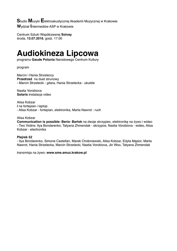 Studio Muzyki Elektroakustycznej Akademii Muzycznej w Krakowie Wydział Intermediów ASP w Krakowie Centrum Sztuki Współczesnej Solvay środa, 13.07.2016, godz. 17.00 Audiokineza Lipcowa programu Gaude Polonia Narodowego Centrum Kultury program Marcin i Hania Strzeleccy Przedrzeź na duet strunowy - Marcin Strzelecki - gitara, Hania Strzelecka - ukulele Nastia Vorobiova Solaris instalacja video Alisa Kobzar i na fortepian i laptop - Alisa Kobzar - fortepian, elektronika, Marta Nawrot - ruch Alisa Kobzar Communication is possible: Berio- Bartok na dwoje skrzypiec, elektronikę na żywo i wideo - Two Violins: Ilya Bondarenko, Tatyana Zhmendak - skrzypce, Nastia Vorobiova - wideo, Alisa Kobzar - electronika Plejrek 52 - Ilya Bondarenko, Simone Castellan, Marek Chołoniewski, Alisa Kobzar, Edyta Mąsior, Marta Nawrot, Hania Strzelecka, Marcin Strzelecki, Nastia Vorobiova, Jin Woo, Tatyana Zhmendak transmisja na żywo: www.sme.amuz.krakow.pl