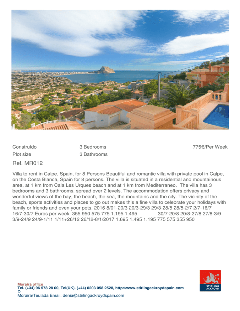 Construído 3 Bedrooms Plot size 3 Bathrooms 775€/Per Week Ref. MR012 Villa to rent in Calpe, Spain, for 8 Persons Beautiful and romantic villa with private pool in Calpe, on the Costa Blanca, Spain for 8 persons. The villa is situated in a residential and mountainous area, at 1 km from Cala Les Urques beach and at 1 km from Mediterraneo. The villa has 3 bedrooms and 3 bathrooms, spread over 2 levels. The accommodation offers privacy and wonderful views of the bay, the beach, the sea, the mountains and the city. The vicinity of the beach, sports activities and places to go out makes this a fine villa to celebrate your holidays with family or friends and even your pets. 2016 8/01-20/3 20/3-29/3 29/3-28/5 28/5-2/7 2/7-16/7 16/7-30/7 Euros per week 355 950 575 775 1.195 1.495 30/7-20/8 20/8-27/8 27/8-3/9 3/9-24/9 24/9-1/11 1/11+26/12 26/12-8/1/2017 1.695 1.495 1.195 775 575 355 950 Moraira office Tel. (+34) 96 578 28 00, Tel(UK). (+44) 0203 058 2528, http://www.stirlingackroydspain.com D Moraira/Teulada Email. [email protected] Powered by TCPDF (www.tcpdf.org)