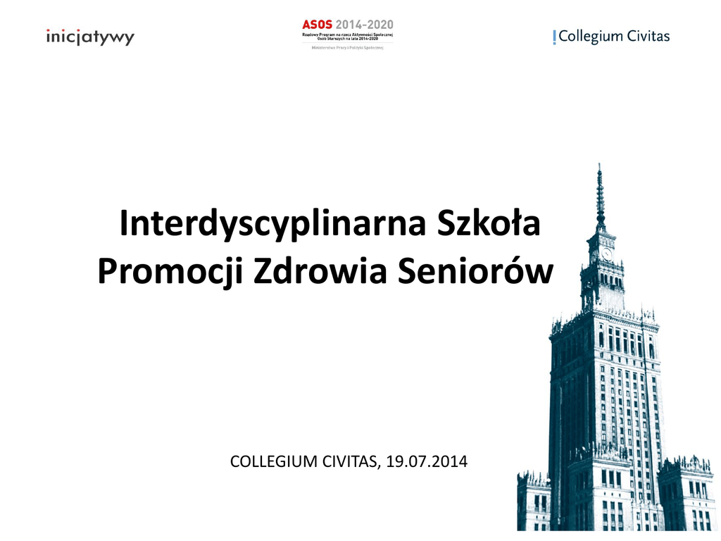 Interdyscyplinarna Szkoła Promocji Zdrowia Seniorów COLLEGIUM CIVITAS, 19.07.2014 Informacje o projekcie (1) • Projekt realizowany przez Partnerów – Klub Myśli Społecznej Inicjatywy (KMSI) – Collegium Civitas (CC) dzięki dofinansowaniu Ministerstwa Pracy Polityki Społecznej Informacje o projekcie (2) Głównym celem projektu jest zwiększenie wiedzy oraz (w efekcie) poprawa kondycji zdrowotnej osób starszych poprzez realizację w ramach Uniwersytetów Trzeciego Wieku (UTW) i systemu opieki zdrowotnej i społecznej nad osobami starszymi interdyscyplinarnego programu edukacji w zakresie promocji zdrowia Zespół projektowy • Prof. dr hab. Janusz Szymborski – kierownik merytoryczny • Krzysztof Przewoźniak – współpracownik merytoryczny Organizacja i rekrutacja: • • • • Katarzyna Błaszczyk – koordynatorka projektu ze strony CC Anna Szylar – rekrutacja i działania promocyjne Magdalena Fruba – rejestracja i rekrutacja Katarzyna Iwińska – kierownik projektu (KMSI) Karol Strasburger - Ambasador Szkoły Informacje o projekcie (3) • Główne działania w projekcie 1. Organizacja Szkoły dla seniorów – realizacja wykładów i warsztatów w wakacje (weekendy od 19.07 do 14.09.14) 2. Szkolenie dla opiekunów osób starszych 3. Opracowanie mini projektów z zakresu promocji zdrowia przez uczestników (pod opieką ekspertów) 4. Uczestnictwo słuchaczy Szkoły w wybranych imprezach prozdrowotnych (kształcenie przez partycypację) 4. Badania ewaluacyjne realizacji projektu – analiza ankiet i wywiadów, wnioski na przyszłość 4. Publikacja – opracowanie modelowego programu ISPZS i najlepsze praktyki Wśród wykładowców: • Dr hab. Adam Czyżewski, Muzeum Etnograficzne • Prof. Paweł Łuków, Uniwersytet Warszawski • Prof. Tadeusz Parnowski, Instytut Psychiatrii i Neurologii • Prof. Piotr Pruszczyk, Warszawski Uniwersytet Medyczny • Prof. Zbigniew Lew Starowicz, Akademia Wychowania Fizycznego • Prof. Janusz Szymborski, Rządowa Rada Ludnościowa • Prof. Witold Zatoński, Centrum Onkologii-Instytut Tematy wykładów: • Zdrowie, wartości i sens życia - dyskusja filozoficzna • Historia wielkich problemów zdrowotnych i wyzwania w zdrowiu w XXI wieku • Co szkodzi zdrowiu? Główne czynniki ryzyka zdrowotnego • Ewolucja a zdrowie człowieka • Ile kosztuje utrata zdrowia? Ile możemy zyskać na jego poprawie? • Czym jest promocja zdrowia? Co muszę wiedzieć, aby poprawić swoje zdrowie? • Kulturowy wymiar zdrowia • Zdrowotne i społeczne problemy wieku starszego • Jak zbierać siły do walki z chorobą? • Prawo i polityka zdrowotna wobec ludzi w starszym wieku • Życie seksualne seniorów, czyli jak czerpać radość z życia Tematy warsztatów: • • • • • • • • • • Kulturowy wymiar zdrowia Opieka nad osobami niepełnosprawnymi i niesamodzielnymi Fizjoprofilaktyka i motoryka zdrowotna Pielęgnacja urody Promocja zdrowego żywienia seniorów Jak zapobiec wypadkom, czyli jak bezpiecznie dożyć później starości? Jak przestać palić tytoń i ograniczyć palenie? Jak radzić sobie z depresją? Problematyka zdrowia psychicznego seniorów Sport dla wszystkich w edukacji zdrowotnej seniorów Jak zostać rzecznikiem i promotorem zdrowia? Ramy czasowe • Harmonogram – Termin rozpoczęcia zajęć: 19 lipca 2014 – Termin zakończenia: wrzesień 2014 • • • • • Szkolenie opiekunów: wrzesień-październik 2014 Mini projekty: październik 2014 Imprezy prozdrowotne: wrzesień-listopad 2014 Badanie ewaluacyjne programu: czerwiec-październik Publikacja na podsumowanie projektu: listopad -grudzień Terminy zjazdów • Zjazd I: 19-20.07.2014 • Zjazd II: 26-27.07.2014 • Zjazd III: 2-3.08.2014 • Zjazd IV: 9-10.08.2014 • Zjazd V: 23-24.08.2014 • Zjazd VI: 30-31.08.2014 • Zjazd VII: 6-7.09.2014 • Zjazd VIII: 13-14.09.2014 We wrześniu i październiku planowane są dodatkowe zajęcia Program zajęć • Plan zajęć jest wręczany podczas rejestracji: uwaga – podział na 6 grup oznacza różne terminy zajęć! O wszystkich dodatkowych terminach i planowanych działaniach będą Państwo informowani poprzez emaile lub kontakt w trakcie wykładów/zjazdów. Kontakt: Kontakty w sprawach bieżących i administracyjnych: p. Katarzyna Błaszczyk [email protected] [email protected] ZAPRASZAMY: http://www.senior.inicjatywy.org/ tel. 22 6567195 www.inicjatywy.org [email protected]