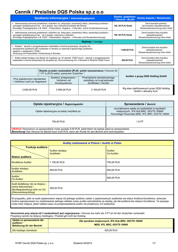 Cennik / Preisliste DQS Polska sp.z o.o Stawka godzinowa Koszty dojazdu / Reisekosten / Honorar - Brutto Spotkania informacyjne / Informationgäsprech Jednorazowa rozmowa projektowa z klientem np. dotycząca: prezentacji oferty, prezentacji produktu i wymagań certyfikacyjnych itp. - do 4 godzin, bez rozliczenia kosztów dla klienta. Einmalige Projektgespräch z.B. DQS – Präsentation, Angebot – 4 Stunden (ohne Kundenberechnung) 125, 00 PLN /Godz Jednorazowa rozmowa projektowa z klientem np. dotycząca: prezentacji oferty, prezentacji produktu i wymagań certyfikacyjnych itp. - do 4 godzin, rozliczona z klientem. Einmalige Projektgespräch z.B. DQS – Präsentation, Angebot – 4 Stunden (mit Kundenberechnung) 150, 00 PLN /Godz Zwrot kosztów podróży bez kosztów zakwaterowania/ Reisekostenberechung ohne Hotel Zwrot kosztów (bez kosztów zakwaterowania)/ Reisekostenberechung ohne Hotel Wykłady / Vorträge Wykład - łącznie z przygotowaniem materiałów w formie prezentacji, skryptów itd., prowadzenie spotkania jako moderator w ramach co najmniej 6 godzinnego spotkania, zgodnie z ustaleniami z DQS / Vorlesung mit Präsentation Vorbereitung 6 Stunden, 1 000,00 PLN Zwrot kosztów bez kosztów zakwaterowania) / Reisekostenberechung ohne Hotel 450,00 PLN Zwrot kosztów (bez kosztów zakwaterowania)/ Reisekostenberechung ohne Hotel Krótki wykład trwający nie dłużej niż 3 godziny np. W ramach DQS Forum – łącznie z przygotowaniem materiałów w formie prezentacji lub skryptów itp. /Kurzvorlessung min 3 Stunden in Rhamen DQS-Forum Stawka za jeden osobodzień [PLN] polski rzeczoznawca / Honorar für 1 PT in [PLN netto]- polnischer Gutachter * Przy pojedynczym standardzie / Verfahren nach ein Regelwerk Systemy zintegrowane / Verfahren mit Kombisystemen Przeniesienie akredytowanego certyfikatu od innej jednostki Zertifikaten Transfer 2 600,00 PLN 2 800,00 PLN 2 100,00 PLN Auditor z grupy DQS Holding GmbH Wg staw zdefiniowanych przez DQS Holding GmbH x aktualny kurs1 Opłata rejestracyjna / Registriegebühr Sprawozdanie / Bericht Opłata rejestracyjna za każdy certyfikat po: zryczałtowana opłata za osobodzień w wyrobach medycznych, IFS i/lub BRC, ISO/TS 16949/ Persontage Pauschale MDD, IFS, BRC, ISO/TS 16949 750,00 PLN 1,0 PT UWAGA! Honorarium za sprawozdanie może wynięść 0,00 PLN, jeżeli klient nie będzie płacił za sprawozdanie. Bemerkung! Das Honorar für Bericht kann 0,00 PLN, wenn der Kunde für den Bericht wird nicht bezahlen. Audity realizowane w Polsce / Audits in Polen Funkcja auditora Auditor wiodący Auditleiter Auditor Co-Auditor Excellence Auditor 1 100,00 PLN 700,00 PLN Auditor wiodący Auditleiter 850,00 PLN 600,00 PLN Auditor Co-Auditor - 600,00 PLN Audit dodatkowy nie na miejscu ocena dokumenacji / Nachbegutachtung nicht vor Ort (Dokumentenprüfung) 300,00 PLN Status auditora W przypadku, jeśli na audit zaplanowano więcej niż jednego auditora i jeden z zaplanowanych auditorów ma status Auditora Excellence, wówczas można zaproponować mu zrealizowanie pełnego nakładu czasu auditu samodzielnie za stawkę, jak dla auditora bez statusu Excellence. Ta sytuacja może mieć miejsce, jeżeli nakład czasu na przeprowadzenie auditu nie przekroczy 3,5 osobodnia. Honorarium przy więcej niż 3 osobodniach jest negocjowane / Honorar bei mehr als 3 PT ist mit den Gutachter verhandelt. Powyższy cennik nie dotyczy holdingów / Preislist gilt nicht bei Holding. Opłata za sprawozdanie dla auditora / Belohnung für der Bericht Dla wyrobów medycznych, IFS i/lub BRC, ISO/TS 16949/ MDD, IFS, BRC, ISO/TS 16949 Dla każdego standardu 1016P Cennik DQS Polska sp. z o.o. 525,00 PLN Wydanie 04/2014 1/1