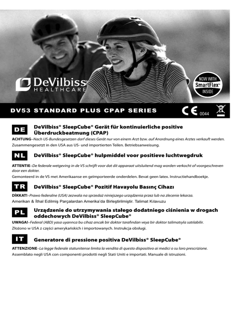 DV53 Standard Plus cpap series DE 0044 D eVilbiss® SleepCube® Gerät für kontinuierliche positive Überdruckbeatmung (CPAP) ACHTUNG–Nach US-Bundesgesetzen darf dieses Gerät nur von einem Arzt bzw. auf Anordnung eines Arztes verkauft werden. Zusammengesetzt in den USA aus US- und importierten Teilen. Betriebsanweisung. NL DeVilbiss® SleepCube® hulpmiddel voor positieve luchtwegdruk ATTENTIE–De federale wetgeving in de VS schrijft voor dat dit apparaat uitsluitend mag worden verkocht of voorgeschreven door een dokter. Gemonteerd in de VS met Amerikaanse en geïmporteerde onderdelen. Bevat geen latex. Instructiehandboekje. TR DeVilbiss® SleepCube® Pozitif Havayolu Basınç Cihazı DİKKAT!–Prawo federalne (USA) zezwala na sprzedaż niniejszego urządzenia przez lub na zlecenie lekarza. Amerikan & İthal Edilmiş Parçalardan Amerika’da Birleştirilmiştir. Talimat Kılavuzu PL Urządzenie do utrzymywania stałego dodatniego ciśnienia w drogach oddechowych DeVilbiss® SleepCube® UWAGA!–Federal (ABD) yasa uyarınca bu cihaz ancak bir doktor tarafından veya bir doktor talimatıyla satılabilir. Złożono w USA z części amerykańskich i importowanych. Instrukcja obsługi. IT Generatore di pressione positiva DeVilbiss® SleepCube® Attenzione–La legge federale statunitense limita la vendita di questo dispositivo ai medici o su loro prescrizione. Assemblato negli USA con componenti prodotti negli Stati Uniti e importati. Manuale di istruzioni. Key Features 8 7 5 A 3 C B 2 6 3 2 D 5 4 4 10 3 1 6 2 E 6 7 4 6 7 5 F 4 1 1 2 7 3 5 DV53/DV5HH 1 2 3 4 5 6 7 8 1 2 DV5HH 9 2 10 11 SE-DV53-2 DE DEUTSCH................................................................................................ DE-3 NLNEDERLANDS......................................................................................... NL-22 TRTURKISH................................................................................................ TR-41 PL POLISH................................................................................................... PL-60 ITITALIANO................................................................................................ IT-81 Inhalt Symbole.................................................................................................................................................................... Wichtige Schutzmaßnahmen................................................................................................................................... Einleitung.................................................................................................................................................................. Verwendungszweck........................................................................................................................................ Verwendungshinweise.................................................................................................................................... Kontraindikationen.......................................................................................................................................... Wichtigste Merkmale (s. Abbildungen auf Seite 2).................................................................................................. Das SleepCube-Gerät.................................................................................................................................... Tastatur........................................................................................................................................................... Aufnahmevorrichtung der Befeuchterkammer................................................................................................ Befeuchterkammer......................................................................................................................................... Therapiemanagementsystem......................................................................................................................... Zusammensetzen des Gerätes................................................................................................................................ Ohne Warmluftbefeuchter.............................................................................................................................. Mit Warmluftbefeuchter.................................................................................................................................. Tastatur und Anzeige................................................................................................................................................ Betrieb...................................................................................................................................................................... Inbetriebnahme............................................................................................................................................... Anwendung der Komfort-Verzögerungsfunktion............................................................................................. Verwendung der SmartFlex™-Funktion......................................................................................................... Warmluftbefeuchter (optional)........................................................................................................................ Abschalten des Gerätes................................................................................................................................. Menüaktivierung............................................................................................................................................. Information zur integrierten SmartCode® Funktion......................................................................................... Patientenmeldungen..........................................................................................