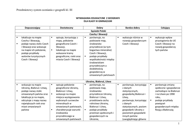 Przedmiotowy system oceniania z geografii kl. III WYMAGANIA EDUKACYJNE Z GEOGRAFII DLA KLASY III GIMNAZJUM Dopuszczający § § § § § § Dostateczny lokalizuje na mapie Czechy i Słowację, podaje nazwy stolic Czech i Słowacji oraz wskazuje na mapie ich położenie, podaje przykłady walorów turystycznych Czech i Słowacji § wskazuje na mapie Ukrainę, Białoruś i Litwę, podaje nazwy stolic omawianych państw oraz lokalizuje je na mapie, odczytuje z mapy nazwy największych rzek oraz miast omawianych państw § § § § opisuje, korzystając z mapy, położenie geograficzne Czech i Słowacji, lokalizuje na mapie wskazane krainy geograficzne, rzeki oraz miasta Czech i Słowacji § opisuje położenie geograficzne Ukrainy, Białorusi i Litwy, wskazuje na mapie miejsca występowania wybranych surowców mineralnych w omawianych państwach, charakteryzuje warunki środowiska przyrodniczego w omawianych państwach § § Dobry Sąsiedzi Polski Czechy i Słowacji porównuje, na podstawie map, środowisko przyrodnicze (w tym bogactwa mineralne) Czech i Słowacji, podaje przykłady współzależności między środowiskiem przyrodniczym a działalnością gospodarczą w omawianych państwach Ukraina, Białoruś, Litwa porównuje, na podstawie map, środowisko przyrodnicze Ukrainy, Białorusi i Litwy, § przedstawia cechy rolnictwa Ukrainy, Białorusi i Litwy, § podaje przykłady przemian społecznych i gospodarczych na Ukrainie, Bardzo dobry Celujący § wykazuje różnice w rozwoju gospodarczym Czech i Słowacji § wykazuje wpływ przystąpienia do UE Czech i Słowacji na rozwój gospodarczy tych państw § porównuje, korzystając z danych statystycznych, gospodarkę Białorusi i Litwy, porównuje, korzystając z danych statystycznych, poziom gospodarki Ukrainy z poziomem gospodarki innych państw (uwzględniając główne § porównuje zmiany społeczne i gospodarcze zachodzące na Białorusi i na Litwie po 1990 roku, podaje przykłady powiązań gospodarczych między Rosją a Białorusią § § 1 Przedmiotowy system oceniania z geografii kl. III § § § § § § wskazuje na mapie Rosję oraz podaje nazwę jej stolicy, lokalizuje na mapie stolicę Rosji, lokalizuje na mapie wskazane obiekty geograficzne Rosji (krainy geograficzne, rzeki, jeziora, morza, miasta) § § § § § z punktu widzenia przydatności dla rolnictwa, wymienia główne kierunki produkcji rolnej w omawianych państwach, przedstawia konsekwencje awarii elektrowni w Czarnobylu § opisuje, korzystając z mapy, położenie geograficzne Rosji oraz jej stolicy, podaje przykłady konsekwencji dużej rozciągłości południkowej i równoleżnikowej, wskazuje, korzystając z map tematycznych, miejsca występowania wybranych surowców mineralnych i obszary upraw wybranych roślin, wymienia przyczyny spadku liczby ludności Rosji w ostatnim okresie, § § § § wskazuje przyczyny i konsekwencje ujemnego przyrostu naturalnego na Ukrainie Rosja charakteryzuje, na podstawie map, środowisko przyrodnicze Rosji, porównuje, korzystając z map, środowisko przyrodnicze europejskiej i azjatyckiej części Rosji, wykazuje różnice w zaludnieniu różnych regionów Rosji i wskazuje przyczyny tych różnic, wykazuje rolę surowców energetycznych w gospodarce Rosji kierunki oraz cechy wyróżniające) § § § wykazuje zależności między elementami środowiska przyrodniczego Rosji, porównuje zagospodarowanie azjatyckiej i europejskiej części Rosji, podaje przyczyny wyludniania się Syberii § § ocenia, na podstawie map, warunki środowiska przyrodniczego wskazanych obszarów Rosji z punktu widzenia życia i działalności człowieka, wyszukuje w źródłach statystycznych dane dotyczące miejsca Rosji w produkcji przemysłowej świata przedstawia zróżnicowanie narodowościowe i 2 Przedmiotowy system oceniania z geografii kl. III § § § lokalizuje na mapie Niemcy oraz ich stolicę, lokalizuje na mapie przynajmniej trzy rzeki i trzy miasta Niemiec § § § kulturowe Rosji, wskazuje, korzystając z mapy demograficznej, obszary o dużej i małej gęstości zaludnienia opisuje, korzystając z mapy, położenie geograficzne Niemiec oraz ich stolicy, lokalizuje na mapie wskazane obiekty geograficzne Niemiec: - krainy geograficzne, - rzeki, - miasta, wymienia główne cechy gospodarki Niemiec (nowoczesny, dobrze rozwinięty przemysł, wysoki poziom rolnictwa towarowego) § § § § Niemcy charakteryzuje, na podstawie map, środowisko przyrodnicze Niemiec, wykazuje na przykładach związek produkcji rolnej Niemiec z warunkami środowiska przyrodniczego, identyfikuje cechy rolnictwa towarowego, przedstawia główne kierunki i przyczyny zmian w strukturze przemysłu w ReńskoWestfalskim Okręgu Przemysłowym jako przykład zmian zachodzących w przemyśle w Europie Zachodniej § § § wyjaśnia, dlaczego starzenie się społeczeństwa Niemiec jest problemem społecznym i gospodarczym (z uwzględnieniem imigracji) przedstawia problemy gospodarcze powstałe w wyniku połączenia NRD i RFN, ocenia, na podstawie danych statystycznych, efektywność i towarowość rolnictwa Niemiec § przedstawia, na § § § ocenia środowisko przyrodnicze z punktu widzenia gospodarki kraju, wyjaśnia przyczyny dynamicznego rozwoju gospodarczego Niemiec, wykazuje rolę Niemiec w Europie Europa Kraje skandynawskie § lokalizuje na mapie kraje pojęcia: gejzer § wykazuje, na podstawie § porównuje, na 3 Przedmiotowy system oceniania z geografii kl. III skandynawskie oraz ich stolice § § § § § wskazuje na mapie wielką § przedstawia, korzystając z map, cechy położenia państw skandynawskich, podaje, korzystając z map, cechy środowiska przyrodniczego państw skandynawskich, wymienia czynniki wpływające na średnią długość życia ludności w krajach skandynawskich, podaje przykłady działalności gospodarczej państw skandynawskich wynikającej z cech środowiska przyrodniczego tych krajów podaje cechy położenia § map tematycznych, zwi