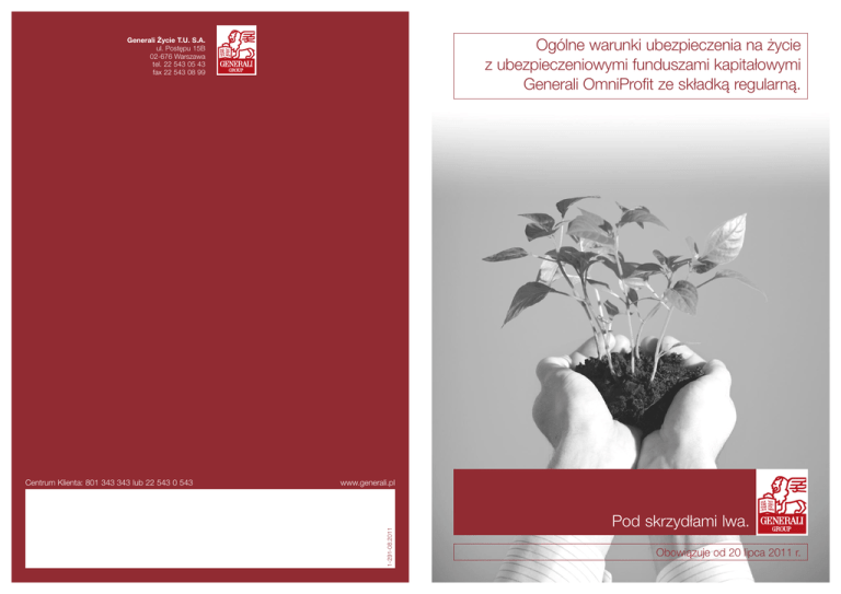 Generali Życie T.U. S.A. ul. Postępu 15B 02-676 Warszawa tel. 22 543 05 43 fax 22 543 08 99 www.generali.pl 1-291-08.2011 Centrum Klienta: 801 343 343 lub 22 543 0 543 Ogólne warunki ubezpieczenia na życie z ubezpieczeniowymi funduszami kapitałowymi Generali OmniProfit ze sk∏adką regularną. Pod skrzydłami lwa. Obowiązuje od 20 lipca 2011 r. SPIS TREÂCI OGÓLNE WARUNKI UBEZPIECZENIA NA ˚YCIE Z UBEZPIECZENIOWYMI FUNDUSZAMI KAPITAŁOWYMI GENERALI OMNIPROFIT ZE SKŁADKÑ REGULARNÑ Artykuł I Postanowienia ogólne...................................................................................... 3 Artykuł II Definicje............................................................................................................ 3 Artykuł III Przedmiot ubezpieczenia i zakres odpowiedzialnoÊci.................................... 5 Artykuł IV Zawarcie Umowy............................................................................................. 5 Artykuł V Umowa............................................................................................................. 6 Artykuł VI Rozwiàzanie Umowy........................................................................................ 6 Artykuł VII Składka............................................................................................................ 7 Artykuł VIII Ubezpieczenie bezskładkowe......................................................................... 9 Artykuł IX Wykup polisy.................................................................................................. 10 Artykuł X Fundusze........................................................................................................ 11 Artykuł XI Rachunek jednostek uczestnictwa i alokacja składek.................................. 12 Artykuł XII Zmiana funduszy............................................................................................ 14 Artykuł XIII Indeksacja...................................................................................................... 14 Artykuł XIV Zmiany Umowy.............................................................................................. 15 Artykuł XV Wypłata Êwiadczeƒ........................................................................................ 15 Artykuł XVI Ograniczenia i wyłàczenia odpowiedzialnoÊci.............................................. 16 Artykuł XVII Postanowienia koƒcowe................................................................................ 17 KLAUZULA ROZSZERZAJÑCA OCHRON¢ O RYZYKO ÂMIERCI W WYNIKU NIESZCZ¢ÂLIWEGO WYPADKU Artykuł I Postanowienia ogólne.................................................................................... 19 Artykuł II Definicje.......................................................................................................... 19 Artykuł III Przedmiot ubezpieczenia i zakres odpowiedzialnoÊci.................................. 19 Artykuł IV Ochrona ubezpieczeniowa............................................................................ 20 Artykuł V Wypłata Êwiadczenia..................................................................................... 20 Artykuł VI Ograniczenia i wyłàczenia odpowiedzialnoÊci.............................................. 20 Artykuł VII Postanowienia koƒcowe................................................................................ 21 Tabela opłat i limitów...............................................................................................................22 Zasady lokowania Êrodków ubezpieczeniowego funduszu kapitałowego............................27 Załàcznik nr 1 Wykaz ubezpieczeniowych funduszy kapitałowych.......................................33 1 2 OGÓLNE WARUNKI UBEZPIECZENIA NA ˚YCIE Z UBEZPIECZENIOWYMI FUNDUSZAMI KAPITAŁOWYMI GENERALI OMNIPROFIT ZE SKŁADKÑ REGULARNÑ OWU RPFM1.01.2010 Artykuł I Postanowienia ogólne Na podstawie Umowy ubezpieczenia, zwanej dalej „Umowà”, zawartej na podstawie niniejszych ogólnych warunków ubezpieczenia, zwanych dalej „OWU”, Generali ˚ycie Towarzystwo Ubezpieczeƒ Spółka Akcyjna, zwana dalej „Towarzystwem”, zobowiàzuje si´ wypłaciç Êwiadczenie w przypadku zajÊcia w ˝yciu Ubezpieczonego zdarzenia przewidzianego w Umowie, a Ubezpieczajàcy zobowiàzuje si´ terminowo opłacaç składki. Artykuł II Definicje Terminy u˝yte w niniejszych OWU, polisie oraz innych dokumentach zwiàzanych z Umowà oznaczajà: Ubezpieczony – osoba fizyczna, której ˝ycie jest przedmiotem ubezpieczenia. Ubezpieczajàcy – podmiot zawierajàcy Umow´ i zobowiàzany do opłacania składek. Uposa˝ony – osoba (lub osoby) wskazana przez Ubezpieczonego lub Ubezpieczajàcego za zgodà Ubezpieczonego, uprawniona do otrzymania Êwiadczenia na wypadek Êmierci Ubezpieczonego. Alokacja składki – okreÊlona w polisie cz´Êç składki regularnej lub składki dodatkowej, ustalona procentowo, przeznaczona na nabycie jednostek uczestnictwa. Cena nabycia – cena jednostki uczestnictwa, po której jest ona dopisywana do rachunku jednostek uczestnictwa. Cena sprzeda˝y – cena jednostki uczestnictwa, po której jest ona odliczana z rachunku jednostek uczestnictwa. Dzieƒ nabycia jednostek – dzieƒ nabycia jednostek uczestnictwa ubezpieczeniowych funduszy kapitałowych przypadajàcy nie póêniej ni˝ w terminie 3 Dni roboczych od: - dnia opłacenia składki regularnej lub odpowiednio składki dodatkowej lub, - dnia wymagalnoÊci składki regularnej o ile została ona zarejestrowana przed datà jej wymagalnoÊci. Dzieƒ wyceny – ka˝dy dzieƒ roboczy oraz ostatni dzieƒ kalendarzowy miesiàca. Dzieƒ roboczy – ka˝dy dzieƒ, z wyłàczeniem sobót, niedziel i dni ustawowo wolnych od pracy. Fundusz zewn´trzny – ubezpieczeniowy fundusz kapitałowy, którego aktywa inwestowane sà w jednostki uczestnictwa funduszu inwestycyjnego, w rozumieniu ustawy z dnia 27 maj