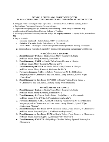 WYNIKI Z PRZEGLĄDU FORM TANECZNYCH W RAMACH II POWIATOWEGO PRZEGLADU ZESPOŁÓW ARTYSTYCZNYCH 1. Przegląd Form Tanecznych odbył się w dniu 13 kwietnia 2015r. w Domu Kultury „Sokół” w Trzebini pod Patronatem Starosty Chrzanowskiego. 2. Organizatorami przeglądu był Powiatowy Młodzieżowy Dom Kultury w Trzebini przy współorganizacji Trzebińskiego Centrum Kultury w Trzebini. 3. W Przeglądzie Form Tanecznych udział wzięło 34 zespoły taneczne z łączną liczbą uczestników: 396 4. Jury w składzie: - Marzena Lozinszek - Szkoła Tańca „WIR” w Mysłowicach - Gabriela Warzecha Studio Tańca Power w Chrzanowie - Jacek Palka – choreograf w Powiatowym Młodzieżowym Domu Kultury w Trzebini po przesłuchaniu wszystkich zespołów postanowiło przyznać następujące wyróżnienia : WYRÓŻNIENIE I STOPNIA 1. Zespół taneczny FUKS ze Studia Tańca Marty Kremer w Libiążu pod kier. naucz. Marty Kremer („Urodzinki”) 2. Zespół taneczny TAKT ze Studia Tańca Marty Kremer w Libiążu pod kier. naucz. Marty Kremer („Materiał girl”) 3. Zespół tanecznyREFLEX ze Studia Tańca Marty Kremer w Libiążu pod kier. naucz. Marty Kremer („Welcome To Rio”) 4. Formacja taneczna AXEL ze Szkoły Podstawowej Nr 1 z Oddziałami Integracyjnymi w Chrzanowie pod kier. naucz. Anny Zielonki, Sylwii Wijas „Poker Face” 5. Zespół tanecznym Em-Team HIP-HOP ze Studia Tańca „Fuzja Dance „ w Chrzanowie pod kier. naucz. Justyny Kędry Układ taneczny 1. 2. 3. 4. 5. 6. WYRÓŻNIENIE II STOPNIA Zespół taneczny FAZA ze Studia Tańca Marty Kremer w Libiążu pod kier. naucz. Marty Kremer („Barbie show”) Zespół taneczny RePlay ze Studia Tańca „Fuzja Dance „ w Chrzanowie pod kier. naucz. Sylwii Wijas („W roztańczonym hotelu”) Formacja taneczna AXEL JUNIOR ze Szkoły Podstawowej Nr 1 z Oddziałami Integracyjnymi w Chrzanowie pod kier. naucz. Anny Zielonki, Sylwii Wijas „Ucieczka z Alcatraz” Zespół tanecznym Em-Team DIVA ze Studia Tańca „Fuzja Dance „ w Chrzanowie pod kier. naucz. Justyny Kędry („W sklepie zoologicznym”) Zespół tanecznym Em-Team JAZZ ze Studia Tańca „Fuzja Dance „ w Chrzanowie pod kier. naucz. Justyny Kędry („Dla niej światło to życie”) Zespół taneczny KAPRYS z Miejskiego Ośrodka Kultury Sportu i Rekreacji w Chrzanowie WYRÓŻNIENIE III STOPNIA 1. Zespół taneczny MINI BĘC z Libiąskiego Centrum Kultury w Libiążu pod kier. naucz. Anny Kremer („Disco kids”) 2. Zespół taneczny KADR ze Studia Tańca Marty Kremer w Libiążu pod kier. naucz. Marty Kremer („Jazz”) 3. Zespół taneczny MISZ-MASZ z Zespołu Szkolno-Przedszkolnego w Młoszowej pod kier. naucz. Sylwii Wijas „Bollywood” 4. Zespól taneczny STARLIGHT z Zespołu Szkół Nr 2 w Chrzanowie –Publicznego Gimnazjum Nr 2 pod kier. naucz. Bartłomieja Kocota WYRÓŻNIENIE 1. Zespół taneczny DWAAB z Zespołu Szkół Nr 2 w Chrzanowie-Szkoły Podstawowej Nr 10 pod kier. naucz.Katarzyny Mrowińskiej, Iwony Latko 2. Julia Farat ze Specjalnego Ośrodka Szkolno-Wychowawczego w Chrzanowie pod kier. naucz. Agnieszki Łach 3. Zespół taneczny ŚWIERSZCZE ze Specjalnego Ośrodka Szkolno-Wychowawczego w Chrzanowie pod kier. naucz. Agnieszki Łach 4. Zespół taneczny BĘC z Libiąskiego Centrum Kultury w Libiążu pod kier. naucz. Anny Kremer 5. Zespół taneczny HAŁAS z Zespołu Szkół w Babicach pod kier. naucz. Sylwii Wijas „Zlot czarownic” 6. Zespół taneczny BLACKKOUT z Zespołu Szkolno-Gimnazjalnego w Libiążu pod kier. naucz. Agnieszki Zabawy WYRÓŻNIENIE SPECJALNE dla Pani Agnieszki Łach nauczyciela Specjalnego Ośrodka Szkolno-Wychowawczego w Chrzanowie .