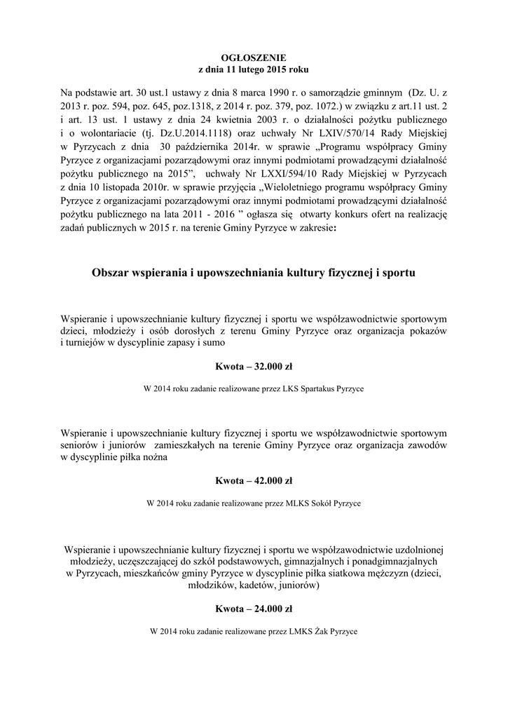 OGŁOSZENIE z dnia 11 lutego 2015 roku Na podstawie art. 30 ust.1 ustawy z dnia 8 marca 1990 r. o samorządzie gminnym (Dz. U. z 2013 r. poz. 594, poz. 645, poz.1318, z 2014 r. poz. 379, poz. 1072.) w związku z art.11 ust. 2 i art. 13 ust. 1 ustawy z dnia 24 kwietnia 2003 r. o działalności pożytku publicznego i o wolontariacie (tj. Dz.U.2014.1118) oraz uchwały Nr LXIV/570/14 Rady Miejskiej w Pyrzycach z dnia 30 października 2014r. w sprawie „Programu współpracy Gminy Pyrzyce z organizacjami pozarządowymi oraz innymi podmiotami prowadzącymi działalność pożytku publicznego na 2015”, uchwały Nr LXXI/594/10 Rady Miejskiej w Pyrzycach z dnia 10 listopada 2010r. w sprawie przyjęcia „Wieloletniego programu współpracy Gminy Pyrzyce z organizacjami pozarządowymi oraz innymi podmiotami prowadzącymi działalność pożytku publicznego na lata 2011 - 2016 ” ogłasza się otwarty konkurs ofert na realizację zadań publicznych w 2015 r. na terenie Gminy Pyrzyce w zakresie: Obszar wspierania i upowszechniania kultury fizycznej i sportu Wspieranie i upowszechnianie kultury fizycznej i sportu we współzawodnictwie sportowym dzieci, młodzieży i osób dorosłych z terenu Gminy Pyrzyce oraz organizacja pokazów i turniejów w dyscyplinie zapasy i sumo Kwota – 32.000 zł W 2014 roku zadanie realizowane przez LKS Spartakus Pyrzyce Wspieranie i upowszechnianie kultury fizycznej i sportu we współzawodnictwie sportowym seniorów i juniorów zamieszkałych na terenie Gminy Pyrzyce oraz organizacja zawodów w dyscyplinie piłka nożna Kwota – 42.000 zł W 2014 roku zadanie realizowane przez MLKS Sokół Pyrzyce Wspieranie i upowszechnianie kultury fizycznej i sportu we współzawodnictwie uzdolnionej młodzieży, uczęszczającej do szkół podstawowych, gimnazjalnych i ponadgimnazjalnych w Pyrzycach, mieszkańców gminy Pyrzyce w dyscyplinie piłka siatkowa mężczyzn (dzieci, młodzików, kadetów, juniorów) Kwota – 24.000 zł W 2014 roku zadanie realizowane przez LMKS Żak Pyrzyce Wspieranie i upowszechnianie kultury fizycznej i sportu we współzawodnictwie sportowym uzdolnionej młodzieży i dorosłych zamieszkałej na terenie miejscowości: Rzepnowo, Żabów, Pyrzyce oraz organizacja zawodów w dyscyplinie piłka nożna Kwota – 9.000 zł W 2014 roku zadanie realizowane przez LZS Bonus Rzepnowo Wspieranie i upowszechnianie kultury fizycznej i sportu we współzawodnictwie sportowym uzdolnionej młodzieży i dorosłych zamieszkałej na terenie miejscowości: Nowielin, Mielęcin, Krzemlin i Pstrowice oraz organizacja zawodów w dyscyplinie piłka nożna Kwota – 9.000 zł W 2014 roku zadanie realizowane przez LZS Gryf Nowielin Administrowanie gminnym boiskiem do piłki nożnej w miejscowości Nowielin (na działce nr 246/6) Kwota – 4.000 zł W 2014 roku zadanie realizowane przez LZS Gryf Nowielin Wspieranie i upowszechnianie kultury fizycznej i sportu we współzawodnictwie uzdolnionej sportowo młodzieży i dorosłych mieszkańców gminy Pyrzyce w dyscyplinie lekkoatletyka Kwota – 1.500 zł W 2014 roku zadanie realizowane przez LKS Spartakus Pyrzyce Wspieranie i upowszechnianie kultury fizycznej i sportu we współzawodnictwie uzdolnionych dzieci i młodzieży, zamieszkałych na terenie miasta i gminy Pyrzyce oraz organizacja zawodów, pokazów w dyscyplinie karate dzieci Kwota – 5000 zł W 2014 roku zadanie realizowane przez Klub Karate Kamikaze Organizacja szkolenia i zawodów w piłce siatkowej wśród młodzieży i dorosłych mieszkańców Gminy Pyrzyce Kwota – 1.000 zł W 2014 roku zadanie realizowane przez Black Team – siatkówka Wspieranie i upowszechnianie kultury fizycznej i sportu we współzawodnictwie uzdolnionej młodzieży i dorosłych, zamieszkałej na terenie miejscowości: Brzesko, Mechowo, Letnin, Obromino oraz organizacja zawodów w dyscyplinie piłka nożna Kwota – 28.000 zł W 2014 roku zadanie realizowane przez LZS Sęp Brzesko Wspieranie i upowszechnianie kultury fizycznej i sportu we współzawodnictwie sportowym uzdolnionej młodzieży i dorosłych zamieszkałej na terenie miejscowości: Żabów, Ryszewko, Młyny, Nieborowo, Brzezin, Ryszewo oraz organizacja zawodów w dyscyplinie piłka nożna Kwota – 22.000 zł W 2014 roku zadanie realizowane przez LZS Goplana Żabów Administrowanie gminnym boiskiem do piłki nożnej w miejscowości Żabów (na działce nr 60/2) Kwota – 4.000 zł W 2014 roku zadanie realizowane przez LZS Goplana Żabów Upowszechnianie działań w ramach prowadzenia zdrowego trybu życia poprzez promocję aktywności ruchowej wśród seniorów zamieszkałych na terenie Gminy Pyrzyce Kwota – 3.000 zł W 2014 roku zadanie realizowane przez UTW, EKS i PZERiI Wspieranie i upowszechnianie kultury fizycznej i sportu poprzez organizację zawodów oraz udział w sportowym współzawodnictwie w różnych dyscyplinach sportowych uzdolnionych dzieci uczęszczających do szkół podstawowych na terenie Gminy Pyrzyce Kwota – 5.500 zł W 2014 roku zadanie realizował LUKS Płonia Okunica Wspieranie i upowszechnianie kultury fizycznej i sportu poprzez udział we współzawodnictwie sportowym uzdolnionej młodzieży uczęszczającej do Publicznego Gimnazjum w dyscyplinie piłka siatkowa Kwota – 4.500 zł W 2014 roku zadanie realizował UKS Piast Pyrzyce Obszar przeciwdziałania uzależnieniom i patologiom społecznym Przeciwdziałanie poprzez sport zjawiskom patologicznym wśród dzieci i młodzieży uczęszczających do szkół podstawowych Gminy Pyrzyce Kwota – 6.000 zł W 2014 roku zadanie realizowały; UKS Copernikus Żabów, UKS Orliki Brzesko, UKS Olimp Mielęcin, UKS Opty Pyrzyce Przeciwdziałanie poprzez sport zjawiskom patologicznym wśród dzieci i młodzieży uczęszczających do Publicznego Gimnazjum w Pyrzycach Kwota – 1.500 zł W 2014 roku zadanie realizował UKS Piast Pyrzyce Obszar wspierania turystyki i krajoznawstwa Organizacja rajdów i zlotów turystycznych, uczestnictwo w rajdach i zlotach tu