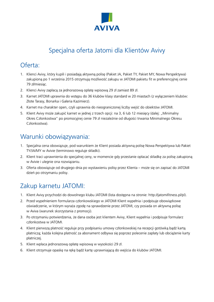 Specjalna oferta Jatomi dla Klientów Avivy Oferta: 1. Klienci Avivy, który kupili i posiadają aktywną polisę (Pakiet JA, Pakiet TY, Pakiet MY, Nowa Perspektywa) zakupioną po 1 września 2015 otrzymują możliwość zakupu w JATOMI pakietu fit w preferencyjnej cenie 79 zł/miesiąc. 2. Klienci Avivy zapłacą za jednorazową opłatę wpisową 29 zł zamiast 89 zł. 3. Karnet JATOMI uprawnia do wstępu do 36 klubów klasy standard w 20 miastach (z wyłączeniem klubów: Złote Tarasy, Bonarka i Galeria Kazimierz). 4. Karnet ma charakter open, czyli uprawnia do nieograniczonej liczby wejść do obiektów JATOMI. 5. Klient Avivy może zakupić karnet w jednej z trzech opcji: na 3, 6 lub 12 miesięcy (dalej: „Minimalny Okres Członkostwa” po promocyjnej cenie 79 zł niezależnie od długości trwania Minimalnego Okresu Członkostwa). Warunki obowiązywania: 1. Specjalna cena obowiązuje, pod warunkiem że Klient posiada aktywną polisę Nowa Perspektywa lub Pakiet TY/JA/MY w Avivie (terminowo reguluje składki). 2. Klient traci uprawnienia do specjalnej ceny, w momencie gdy przestanie opłacać składkę za polisę zakupioną w Avivie i ulegnie ona rozwiązaniu. 3. Oferta obowiązuje od drugiego dnia po wystawieniu polisy przez Klienta – może się on zapisać do JATOMI dzień po otrzymaniu polisy. Zakup karnetu JATOMI: 1. Klient Avivy przychodzi do dowolnego klubu JATOMI (lista dostępna na stronie: http://jatomifitness.pl/pl). 2. Przed wypełnieniem formularza członkowskiego w JATOMI Klient wypełnia i podpisuje obowiązkowe oświadczenie, w którym wyraża zgodę na sprawdzenie przez JATOMI, czy posiada on aktywną polisę w Aviva (warunek skorzystania z promocji). 3. Po otrzymaniu potwierdzenia, że dana osoba jest klientem Avivy, Klient wypełnia i podpisuje formularz członkostwa w JATOMI. 4. Klient pierwszą płatność reguluje przy podpisaniu umowy członkowskiej na recepcji gotówką bądź kartą płatniczą; każda kolejna płatność za abonament odbywa się poprzez polecenie zapłaty lub obciążenie karty płatniczej. 5. Klient wpłaca jednorazową opłatę wpisową w wysokości 29 zł. 6. Klient otrzymuje opaskę na rękę bądź kartę uprawniającą do wejścia do klubów JATOMI.