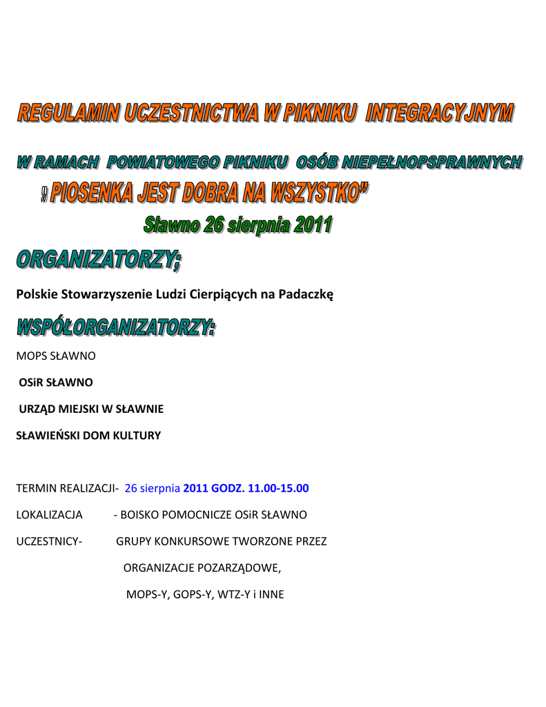 Polskie Stowarzyszenie Ludzi Cierpiących na Padaczkę MOPS SŁAWNO OSiR SŁAWNO URZĄD MIEJSKI W SŁAWNIE SŁAWIEOSKI DOM KULTURY TERMIN REALIZACJI- 26 sierpnia 2011 GODZ. 11.00-15.00 LOKALIZACJA - BOISKO POMOCNICZE OSiR SŁAWNO UCZESTNICY- GRUPY KONKURSOWE TWORZONE PRZEZ ORGANIZACJE POZARZĄDOWE, MOPS-Y, GOPS-Y, WTZ-Y i INNE CEL IMPREZY- INTEGRACJA I AKCEPTACJA OSÓB NIEPEŁNOSPRAWNYCH W ŚRODOWISKUPROPAGOWANIE IDEI WZAJEMNEJ POMOCY, ZROZUMIENIA I ŻYCZLIWOŚCI - DOSTARCZANIE OSOBOM NIEPEŁNOSPRAWNYM DOZNAO DUCHOWYCH - WYPRACOWANIE DOBRYCH RELACJI ZE WSZYSTKINMI LUDŹMI BEZ WZGLĘDU NA REPREZENTOWANE POGLĄDY, STATUS SPOŁECZNY - ZWIEKSZENIE WRAŻLIWOŚCI NA NIEPEŁNOSPRAWNOŚD INNYCH LUDZI - PODNIESIENIE SPRAWNOŚCI FIZYCZNO-RUCHOWEJ ORAZ ARTYSTYCZNEJ UCZESTNIKÓW FESTYNU - WDRAŻANIE ZDROWEJ RYWALIZACJI Grupy konkursowe będą podczas festynu rywalizowały w następujących dyscyplinach; 1. Prezentacja artystyczna- w skład grupy mogą wchodzid osoby niepełnosprawne w liczbie nieograniczonej czas prezentacji nie może przekroczyd 5 minut. 2. Dobór repertuaru jest dowolny i powinien zawierad jeden utwór muzycznypiosenkę. 3. Konkurs plastyczny- każda grupa deleguje 5 osób niepełnosprawnych, które wykonają prace plastyczną na temat określony przez organizatora Każda grupa przywozi materiały niezbędne do wykonania wyklejanego obrazu(plastelinę, ryż, groch, kolorowe gazety i inne materiały według uznania) 4. Konkurs na najładniejszy kosz piknikowy (uwaga nowośd) 5. Każda Grupa przygotowuje co najmniej 3 blaszki ciasta na konkurs kulinarnyobowiązkowo- zgłoszenie grupy jest jednoznaczne z wyrażeniem zgody na przygotowanie ciasta 6. Zawody sportowe na wesoło- konkursy dla poszczególnych grup Za kolejne miejsca punkty od 20 do 0 w zależności od zajętego miejsca w poszczególnych konkurencjach Prezentacja poszczególnych grup konkursowych oceni jury powołane na czas festynu przez organizatora – Polskie Stowarzyszenie Ludzi Cierpiących na Padaczkę. Grupy będą ocenione odrębnie we wszystkich kategoriach 1.Prezentacja artystyczna : - opracowanie muzyczne 2. Konkurs plastyczny :grupy konkursowe wykonają prace plastyczna na zadany przez organizatora temat. Niezbędne jest przywiezienie ze sobą materiałów do wykonania pracy Oceniana będzie - oryginalnośd , pomysłowośd - estetyka wykonania - wrażenia artystyczne 3. Konkurs na najładniejszy kosz piknikowy 4. Konkurs na najlepsze i najsmaczniejsze, najestetyczniej wykonane ciasta 5. Zawody sportowe: - konkursy dla poszczególnych grup Za kolejne miejsca punkty od 20 do 0 w zależności od zajętego miejsca w poszczególnych konkurencjach Indywidualne zabawy sportowe dla chętnych Prowadzone będą dodatkowo zajęcia lepienia gliny dla wszystkich chętnych uczestników Pikniku. Zapewniony będzie materiał do zajęd. Przepisy organizacyjne: Karty zgłoszenia należy przesłać na adres: Miejski Ośrodek Pomocy Społecznej w Sławnie do dnia 31 lipca 2011 Narada instruktorów i opiekunów grup w dniu 26sierpnia 2011 roku o godzinie 10.00 w BIURZE FESTYNU
