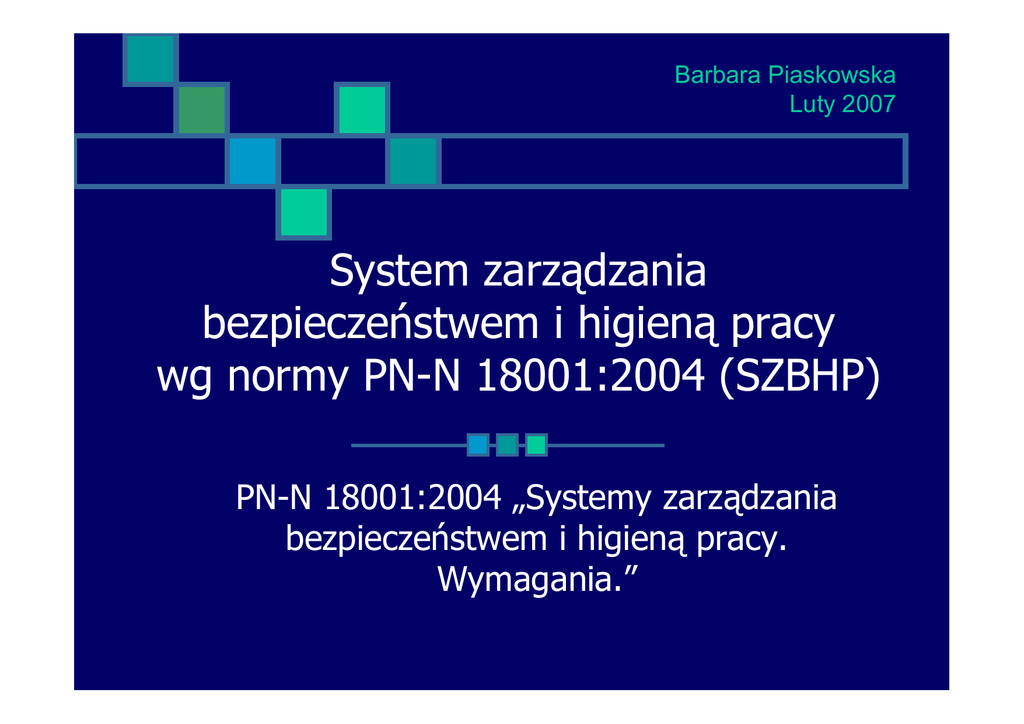 Barbara Piaskowska Luty 2007 System zarządzania bezpieczeństwem i higieną pracy wg normy PN-N 18001:2004 (SZBHP) PN-N 18001:2004 „Systemy zarządzania bezpieczeństwem i higieną pracy. Wymagania.” System Zarządzania Bezpieczeństwem i Higieną Pracy to część ogólnego systemu zarządzania organizacją, która obejmuje strukturę organizacyjną, planowanie, odpowiedzialności, zasady postępowania, procedury, procesy i zasoby potrzebne do opracowania, wdraŜania, realizowania, przeglądu i utrzymywania polityki bezpieczeństwa i higieny pracy pkt. 3.20 PN-N 18001:2004 Co to znaczy systemowe zarządzanie BHP ? Systemowe zarządzanie bezpieczeństwem jest metodą, która pozwala uporządkować i usystematyzować wszystkie działania związane z bezpieczeństwem i higieną pracy w firmie, a jej ideą jest pełne i udokumentowane zaangaŜowanie zarówno kierownictwa, jak i kaŜdego pracownika w rzeczywiste działania na rzecz bezpieczeństwa pracy SZBHP w szczególności polega na konsekwentnej realizacji ustalonych działań tj.: opracowanie i ogłoszenie załodze polityki oraz celów w zakresie BHP, będących wyrazem zaangaŜowania najwyŜszego kierownictwa określenie odpowiedzialności i uprawnień poszczególnych pracowników w zakresie działań na rzecz BHP zapewnienie właściwych szkoleń oraz motywowanie pracowników do bezpiecznej i higienicznej pracy organizowanie sprawnego systemu komunikowania się w zakresie BHP ocenianie ryzyka zawodowego opracowanie zasad reagowania na wypadki przy pracy oraz wdraŜanie działań korygujących i zapobiegawczych związanych z bezpieczeństwem i higieną pracy monitorowanie i auditowanie systemu zarządzania BHP Model systemu zarządzania BHP przyjęty w normie PN-N 18001:2004 Ciągłe doskonalenie Przegląd dokonywany przez kierownictwo ZaangaŜowanie kierownictwa oraz polityka BHP Planowanie Sprawdzanie oraz działania korygujące i zapobiegawcze WdraŜanie i funkcjonowanie Cykl pracy Deminga PDCA Planuj (PLAN) – zaplanuj zadania do wykonania Wykonaj (DO) – wykonaj zaplanowane zadania, zapewnij do tego zasoby Sprawdź (CHECK) – czy realizacja zadań przebiega zgodnie z planem Działaj (ACT) – jeŜeli realizacja zadań nie przebiega zgodnie z planem dokonaj niezbędnych korekt PDCA to zasada ciągłego doskonalenia, japońska nazwa KAIZEN. jap. 改改 - "kai" - zmiana, "zen" - dobry Działaj Planuj Sprawdź Wykonaj Korzyści na które wskazuje literatura: spełnienie wymagań prawnych z zakresu BHP rzeczywista poprawa warunków pracy poprawa wizerunku firmy i wzrost jej konkurencyjności ograniczenie liczby zwolnień chorobowych zwiększenie ilości czasu pracy przeznaczonego na produkcję w związku z poprawą stanu BHP aktywne włączanie się pracowników w program samokontroli - wzrost świadomości i motywacji załogi zainteresowanie pracą w związku z poprawą jakości, wydajności i bezpieczeństwa pracy lepsza organizacja pracy i usprawnienie systemu informacji w przebiegu produkcji i problemach codziennej pracy zatrudnionych Korzyści, na które wskazuje literatura cd. przeprowadzona w sposób uŜyteczny i czytelny ocena ryzyka zawodowego zapobieganie zdarzeniom potencjalnie wypadkowym (tzw. „śpiące wypadki”) zmniejszenie kosztów związanych z ubezpieczeniem wypadkowym pracowników zmniejszenie rotacji pracowników Państwowa Inspekcja Pracy coraz częściej zwalnia firmy posiadające certyfikat systemu zarządzania BHP z okresowych kontroli Ogólny zakres prac ocena stopnia spełnienia przez przedsiębiorstwo wymagań systemu BHP (przegląd wstępny) identyfikacja procesów i procedur BHP w organizacji identyfikacja i ocena ryzyka zawodowego opracowanie i wdroŜenie dokumentacji Systemu Zarządzania Bezpieczeństwem i Higieną Pracy (SZBHP) przeprowadzenie auditów wewnętrznych SZBHP szkolenia dla kadry pracowniczej i auditorów wewnętrznych Etapy wdraŜania SZBHP - Etap I – Zespół ds. wdroŜenia Powołanie zespołu ds. wdraŜania SZBHP (Specjalista ds. Systemu, Kierownicy Działów, Specjalista ds. BHP) Określenie odpowiedzialności za wdroŜenie SZBHP oraz związanych z tym uprawnień Etapy wdraŜania SZBHP - Etap II – Szkolenia Zorganizowanie i przeprowadzenie szkoleń dla kadry kierowniczej celem zapewnienia zrozumienia wymagań systemu zarządzania BHP oraz zaangaŜowania kadry we wdraŜanie systemu (podstawy daje niniejsza prezentacja) Etapy wdraŜania SZBHP - Etap III – Identyfikacja wymagań prawnych naleŜy opracować wykaz obowiązujących aktów prawnych, odpowiedzialności w tym zakresie oraz sposób przekazywania Informacji, np.: przeglądanie bazy danych o wymaganiach prawnych i wykazów wydawanych norm, identyfikacja wymagań dotyczących BHP oraz przekazywanie informacji Specjaliście ds. BHP (odp. Biuro Organizacyjno – Prawne) analiza wymagań prawnych lub norm w aspekcie ich zastosowania w zakładzie oraz aktualizacja wykazu obowiązujących zakład wymagań prawnych i innych (odp. Specjalista ds. BHP) ocena czy zakład spełnia zaktualizowane wymagania oraz zainicjowanie działań potrzebnych do ich spełnienia (odp. Specjalista ds. BHP) Etapy wdraŜania SZBHP - Etap IV – Przegląd wstępny opracowanie ankiet (anonimowych) o stanie BHP dla pracowników produkcyjnych zebranie danych z ankiet celem przyjrzenia się wymienianym problemom w trakcie wypełniania list kontrolnych opracowanie planu przeglądu wstępnego i list kontrolnych dla zespołów wykonujących przegląd wyznaczenie osób do przeprowadzenia przeglądu wstępnego szkolenie osób wykonujących przegląd przeprowadzenie przeglądu wstępnego podsumowanie wyników przeglądu wstępnego poinformowanie o wynikach przeglądu wstępnego pracowników lub ich przedstawicieli oraz komisji ds. BHP Przegląd wstępny – co to jest ? Przegląd wstępny to analiza stanu obecnego procesu zarządzania bezpieczeństwem i higieną pracy w odniesieniu do wymagań normy PN-N 18001:2004 Wynikiem przeglądu wstępnego powinna b