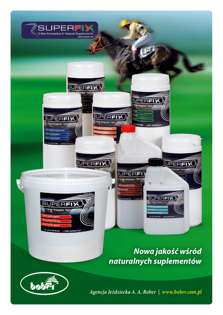 Nowa jakość wśród naturalnych suplementów Agencja Jeździecka A. A. Bober | www.bober.com.pl Superfix – Bone Bone – to naturalnie występujący fitosteryd, który został wyekstrahowany z rośliny i ustabilizowany na poziomie czystości 98%. Możliwość ustabilizowania aktywnego składnika i wyekstrahowania dostatecznych ilości stanowi najnowsze osiągnięcie w dziedzinie leczniczych środków odżywczych. Wspiera leczenie złamań i bolących goleni. Wspomaga rozmnażanie osteoblastów. Wspiera produkcję krwinek czerwonych w szpiku kostnym. Zrastanie się złamań jest procesem dynamicznym, który regulują różne pierwiastki komórkowe i środki stymulujące. Złamane kości zrastają się dzięki kaskadzie zdarzeń komórkowych, w których zasadniczą rolę odgrywają hormony wzrostu. Superfix należy podawać młodym zwierzętom odstawionym od matki, roczniakom oraz w ramach diety przygotowującej do sprzedaży. Podawać natychmiast po urazie i kontynuować przez cztery komórkowe etapy zrastania się kości (odpoczynek, rozmnażanie, dojrzewanie i przerost). Instrukcje podawania: Po złamaniu i w razie bolących goleni podawać codziennie przez co najmniej sześć miesięcy w celu uzyskania maksymalnego rezultatu. Dawka dzienna: 2 miarki dziennie. Superfix L6 L-6 zawiera 100% naturalnych składników znanych z właściwości moczopędnych. L-6 jest szczególnie efektywny, gdy jest podawany koniom, które mają skłonność do pojawiania się krwotoku płucnego podczas pracy. L-6 pomaga utrzymać prawidłowe funkcjonowanie układu oddechowego i zwiększa wydolności. Intensywny trening, niewydolność oddechowa i stres jest wśród koni powszechnym problemem. Badania weterynaryjne wskazują, że ponad 60% wszystkich koni jest dotkniętych krwotokiem płucnym wywołanym intensywną pracą. W wypadku folblutów EIPH może spowodować niemożność trenowania. L-6 ma silne właściwości moczopędne i uwalnia od EIPH. Składniki w L-6 są w 100% naturalne i w odróżnieniu od leków na receptę, preparat ten nie powoduje utraty wydajności zwierzęcia, nie powoduje też utraty ważnych substancji odżywczych takich jak potas. Długotrwałe stosowanie przynosi korzyści i wspomaga ogólny stan zdrowia. Instrukcje podawania: Podawać trzy razy w tygodniu 1–2 godziny przed szybką pracą czy wyścigiem. Przewlekle chore konie mogą dostawać dawkę na dobę. Nie podawać z innym lekiem moczopędnym. Superfix Performance Podtrzymuje wytrzymałość i zwiększa energię. Pomaga utrzymać prawidłowy poziom glukozy we krwi. Zwiększa syntezę białka nawet o 100%. Jest potężnym naturalnym preparatem przeciwbólowym (nie fenylobutazonem). Superfix spełnia podstawowe cele treningu: opóźnia wystąpienie zmęczenia, utrzymuje maksymalną sprawność, pomaga zmniejszyć częstotliwość występowania urazów a także utrzymuje chęć i zapał do ćwiczeń. Efektów należy się spodziewać w ciągu 1–5 dni. Dawka: Podawać 3 czubate miarki (3g) dwa razy dziennie przez tydzień. Powinien być dodawany do normalnej paszy wieczorem. Dzienna dawka: Potem 3 czubate miarki, raz dziennie przez miesiąc. Zaleca się, aby podawać ten suplement podczas intensywnych okresów treningowych i najlepiej przez okres jednego miesiąca z sześcio-tygodniową przerwą pomiędzy kolejnymi cyklami. Superfix Performance nie zawiera kofeiny i teobrominy ale może naruszać równowagę organizmu dlatego wskazane jest, aby nie stosować produktu 24 godziny przed zawodami. Agencja Jeździecka A. A. Bober, ul. Baranowicka 3, Ochaby Wielkie, 43-430 Skoczów, Polska tel.: +48 33 857 98 20, mobil: +48 507 175 865, e-mail: [email protected], www.bober.com.pl Superfix Respri-Ease Superfix Respri-Ease jest bardzo skutecznym suplementem zawierającym 70% biologicznie dostępnej witaminy C. Zawiera również znaczne ilości witamin A i B oraz mocną kombinację bioflawonoidów. Produkt zapewnia: wzrost stężenia hemoglobiny; zdrowy i silny układ immunologiczny; ulgę w stanach zesztywnienia. Próby wykazały wzrost poziomów żelaza we krwi u koni, oraz niższą zapadalność na choroby układu oddechowego i niższe poziomy białka surowicy krwi związane z rozstrojem nerwowym. Wysokie poziomy witaminy C i bioflawonoidów tworzą zdrowszy i silniejszy układ immunologiczny, szybciej reagujący na wyzwania bakteryjne i wirusowe. Produkt jest skuteczniejszy od glukozaminy we wspieraniu dobrego stanu i gibkości. Dobra suplementacja witaminy C jest niezbędna dla zdrowego rozwoju kopyt, ścięgien, więzadeł, mięśni i kości, przy czym młode i trenujące konie wymagają wyższych poziomów niż konie odpoczywające. Instrukcje podawania: Podawać jedną miarkę z poranną i wieczorną paszą. Stosować stale przez cały sezon treningowy koniom, które mają problemy z oddychaniem lub kondycją. Aby wesprzeć konie na początku sezonu treningowego i po ciężkim wyścigu można zastosować kurację miesięczną w celu ich wzmocnienia lub przyśpieszenia powrotu do sił. Niewielkim kucykom i starszym koniom prowadzącym spokojny tryb życia można podawać w formie trzytygodniowej kuracji. Receptura uwzględnia przepisy FEI Zaleca się odstawienie na 24 godziny przed wyścigiem lub zawodami. Superfix SetFree Superfix SetFree zawiera 100% naturalnych składników mających za zadanie silnie wspierać i dbać o zdrowe funkcjonowanie mięśni. Wpływa uspokajająco na układ nerwowy koni. Superfix SetFree działa w następujący sposób: Opóźnia pojawienie się zmęczenia, utrzymuje pracę mięśni, minimalizuje częstotliwość występowania dysfunkcji mięśnia, utrzymuje chęć i zapał do ćwiczeń. Spodziewany wynik następuje w przeciągu 1–5 dni. Superfix SetFree ma silne właściwości anty-kurczowe, które chronią i wspierają układ mięśniowo-szkieletowy podczas stresów i problemów związanych z treningiem. Produkt ten posiada dodatkową funkcję działającą uspokajająco na układ nerwowy 